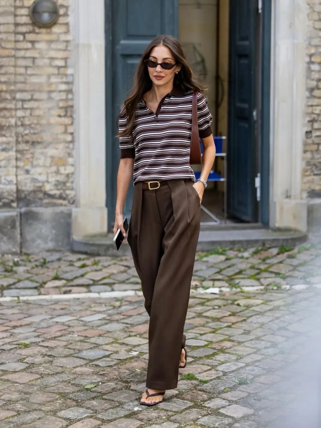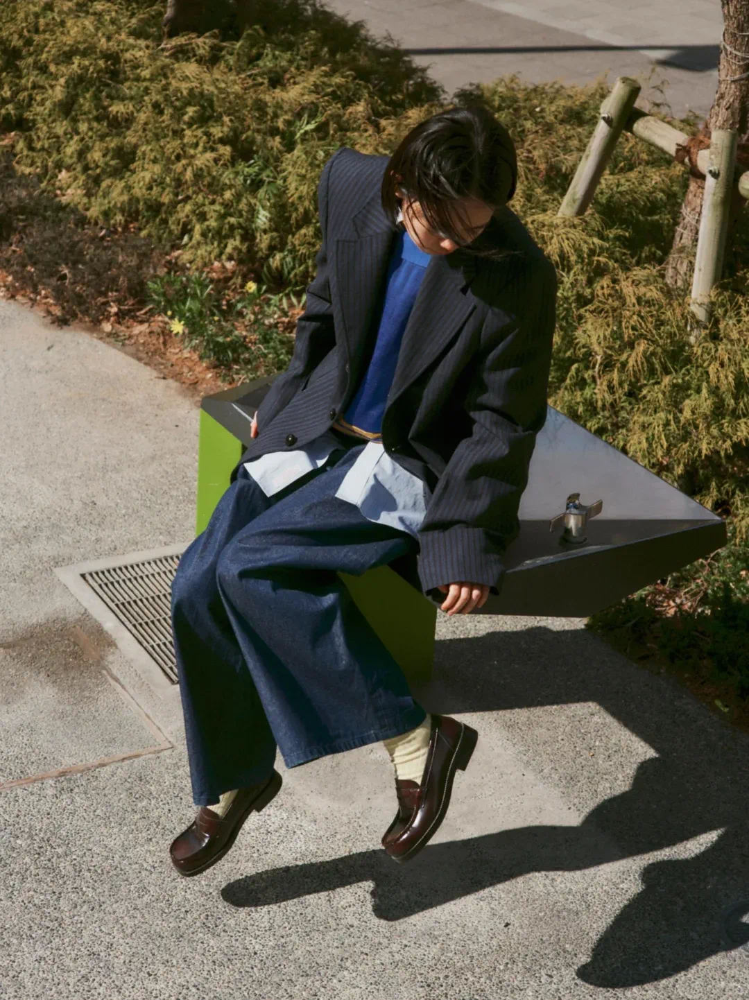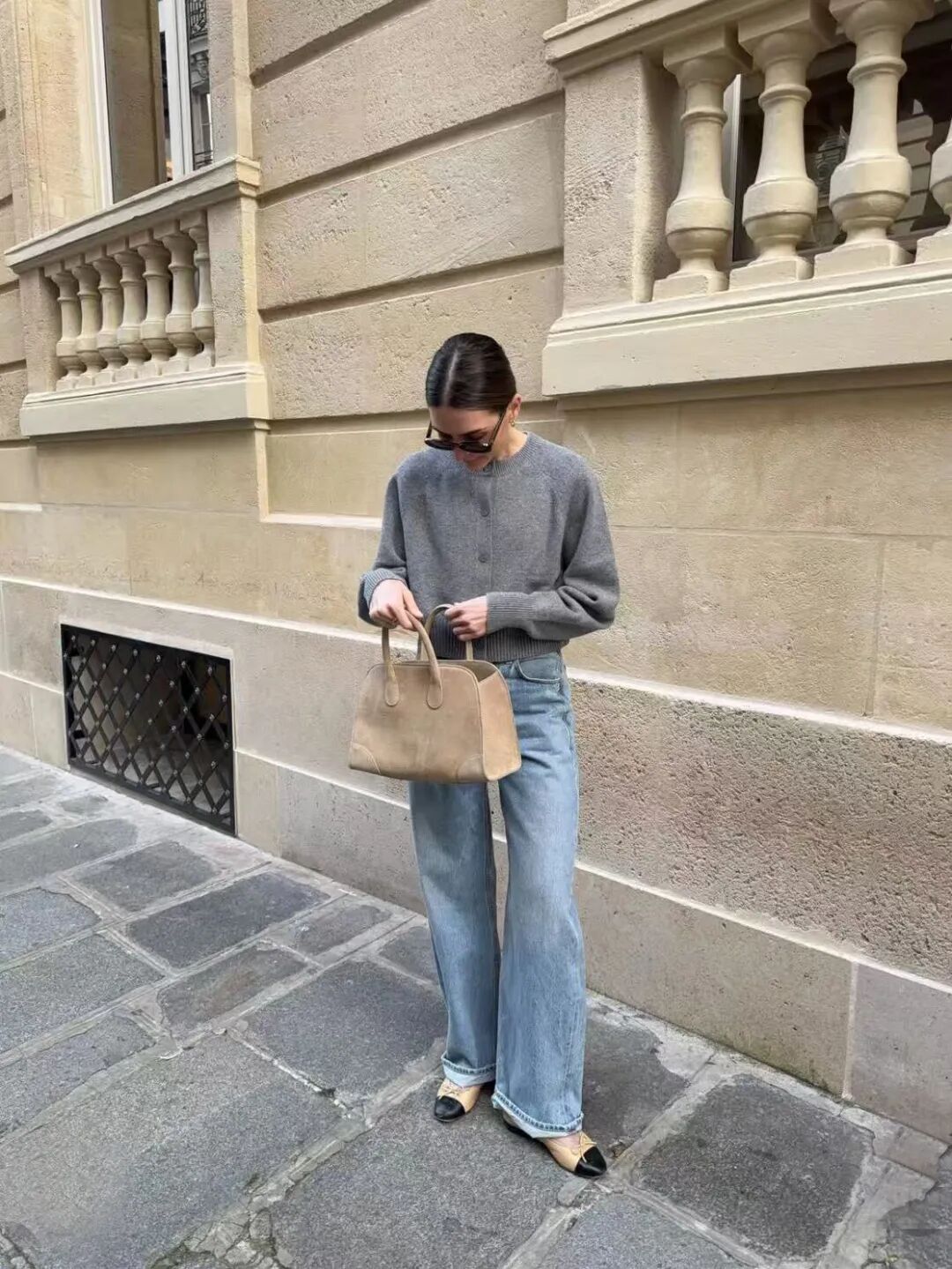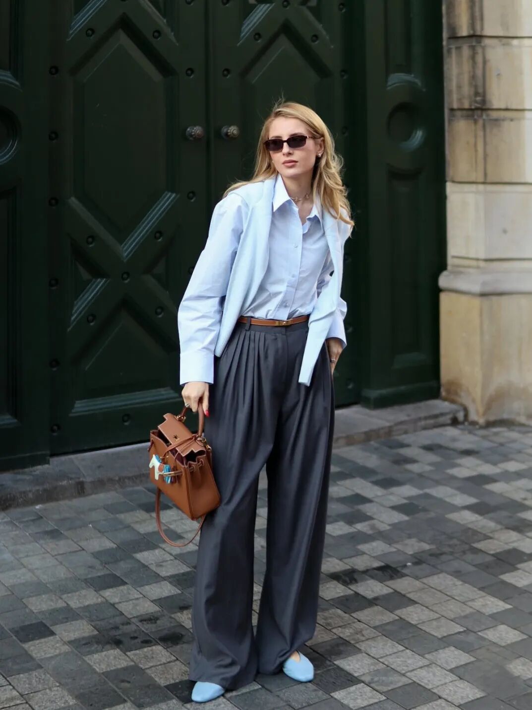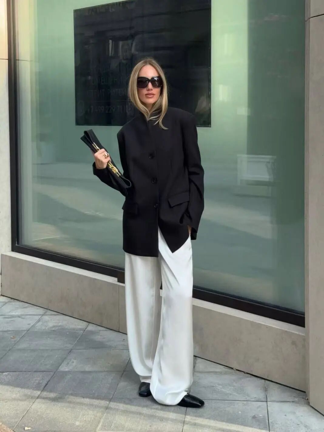 宽松卡其裤或西装裤是不可或缺的单品。2025年裤装有了更多变化空间,褶皱设计的宽松西装裤,或灯芯绒、条纹羊毛裤等特殊面料裤款,能增加造型丰富度。