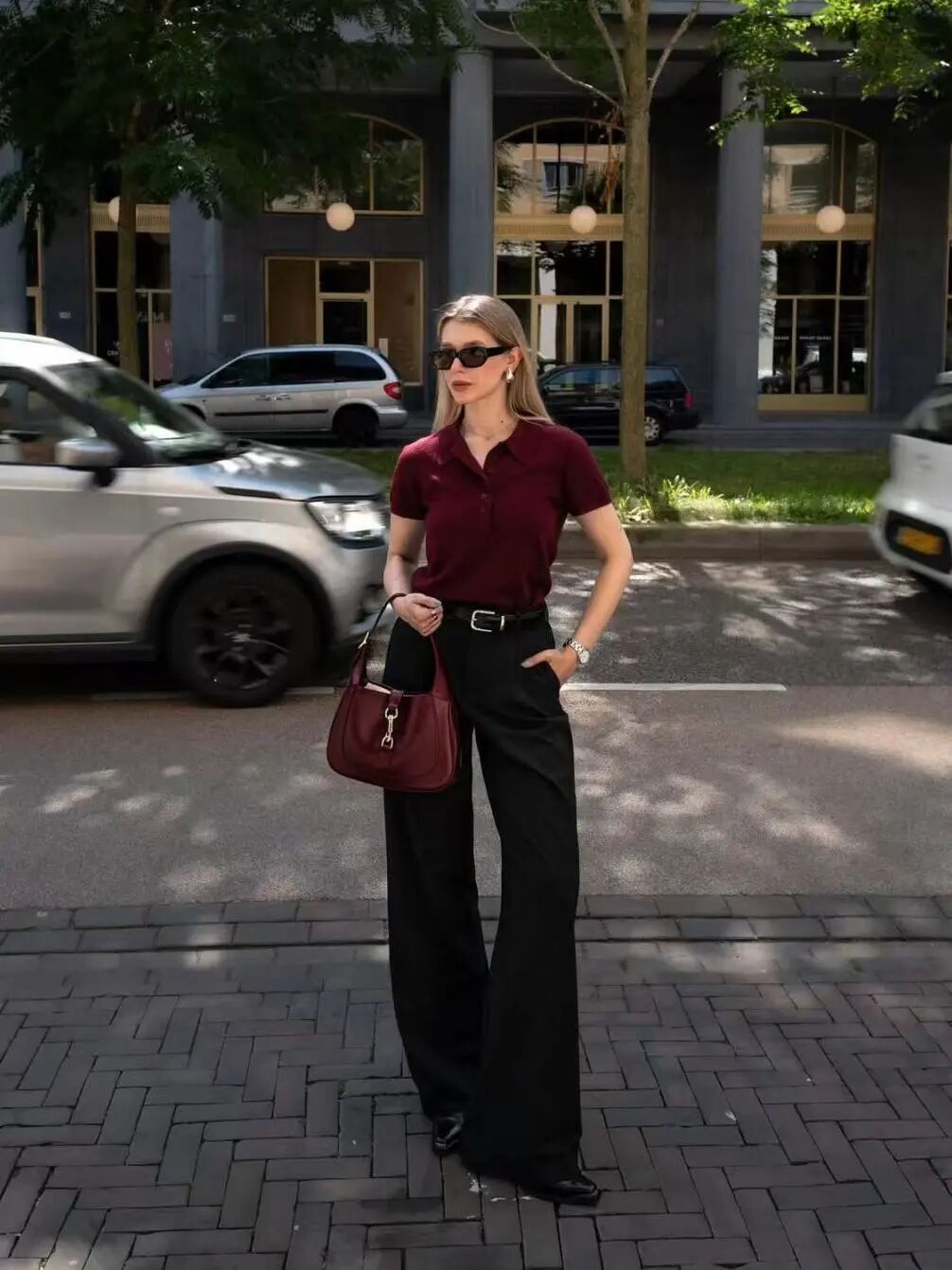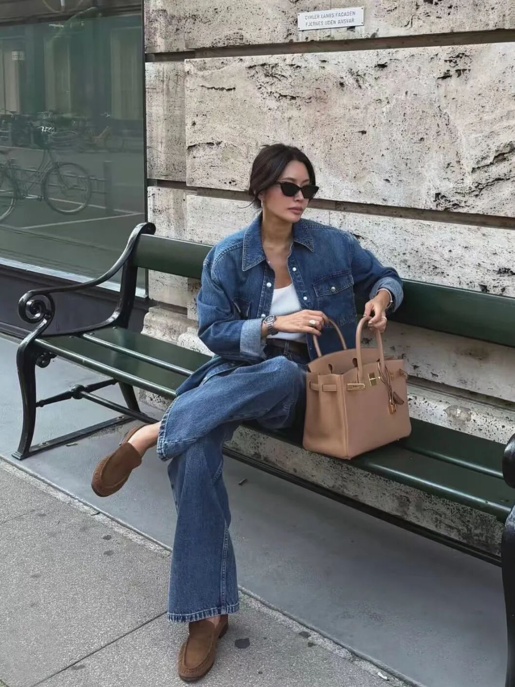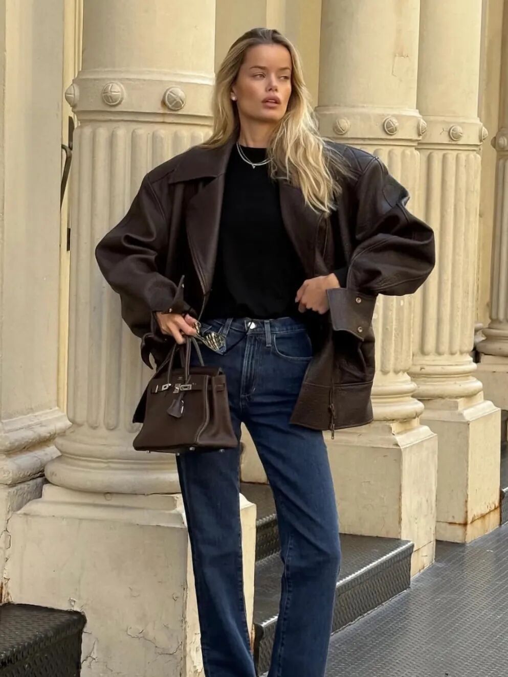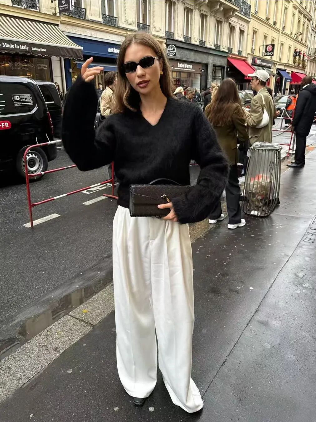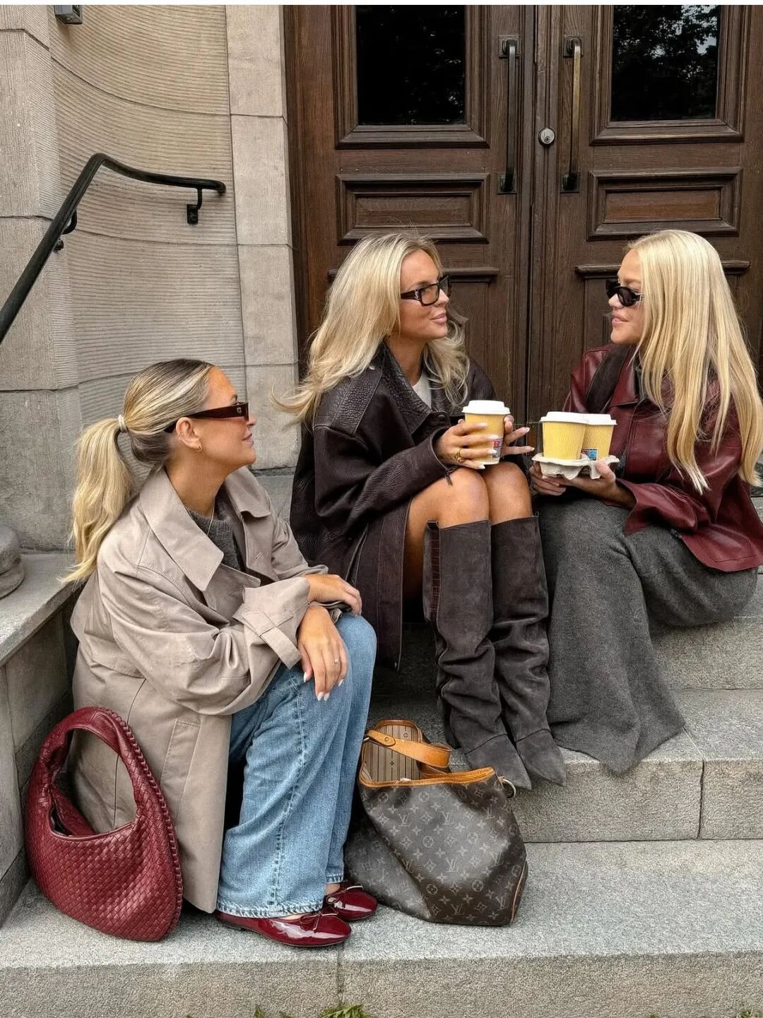 宽松卡其裤或西装裤是不可或缺的单品。2025年裤装有了更多变化空间,褶皱设计的宽松西装裤,或灯芯绒、条纹羊毛裤等特殊面料裤款,能增加造型丰富度。