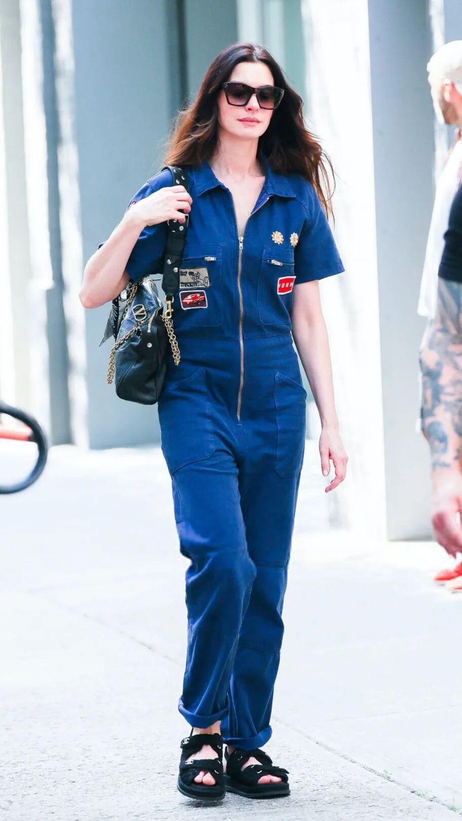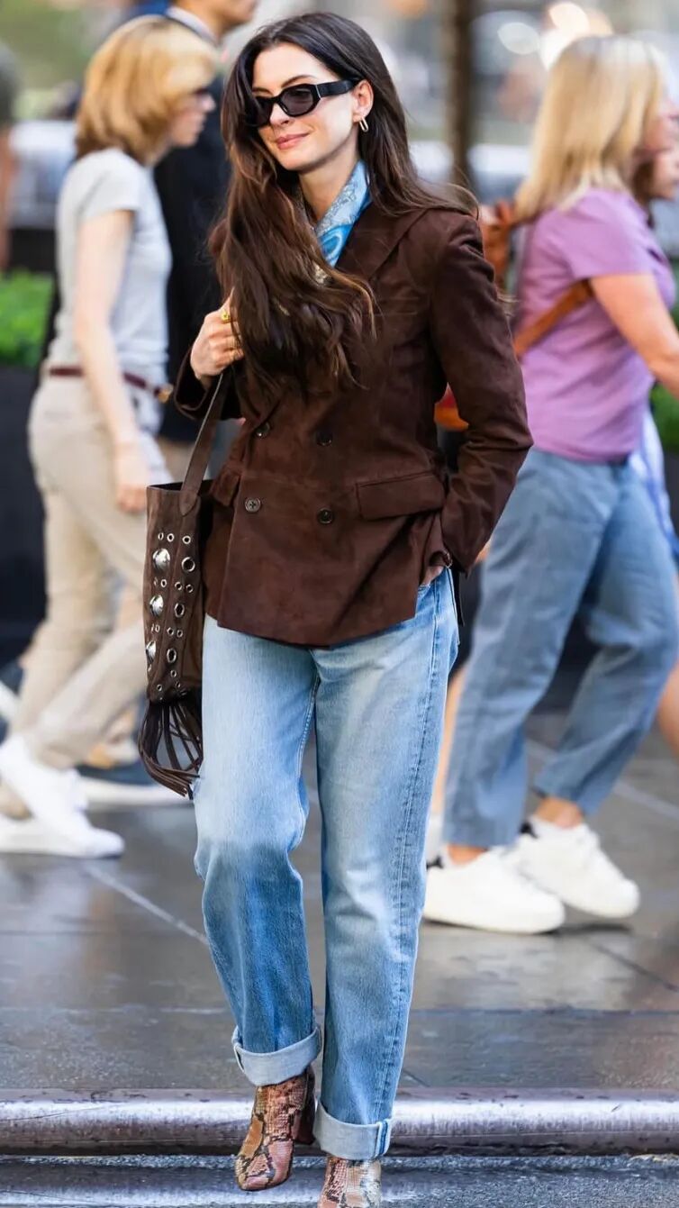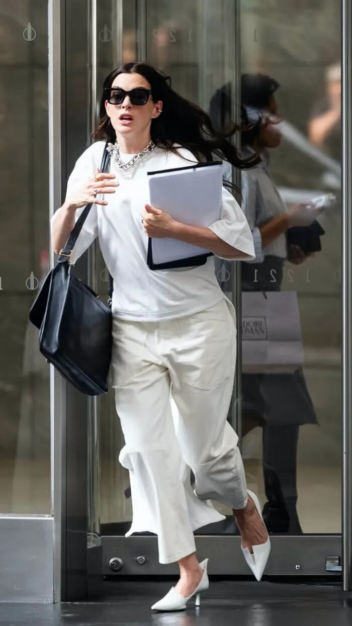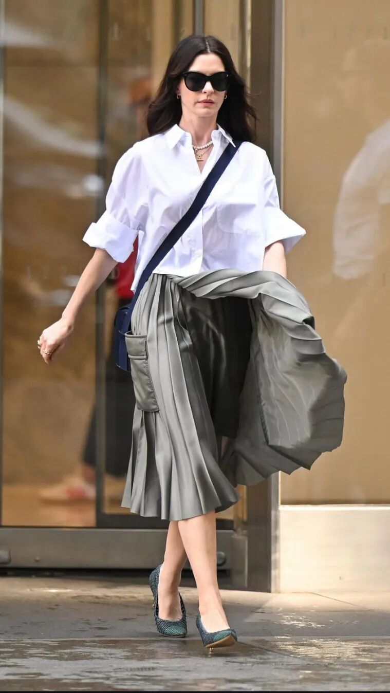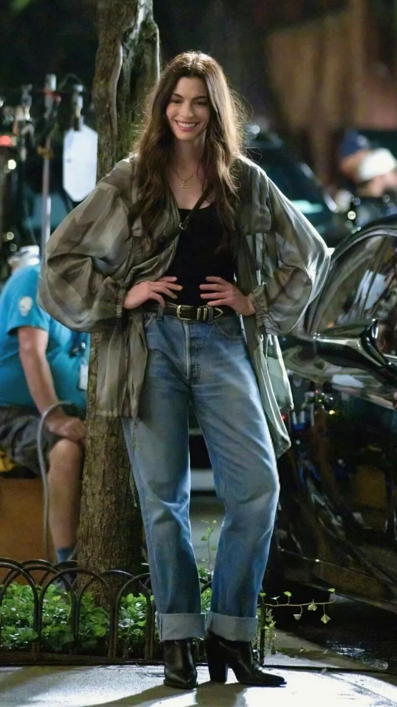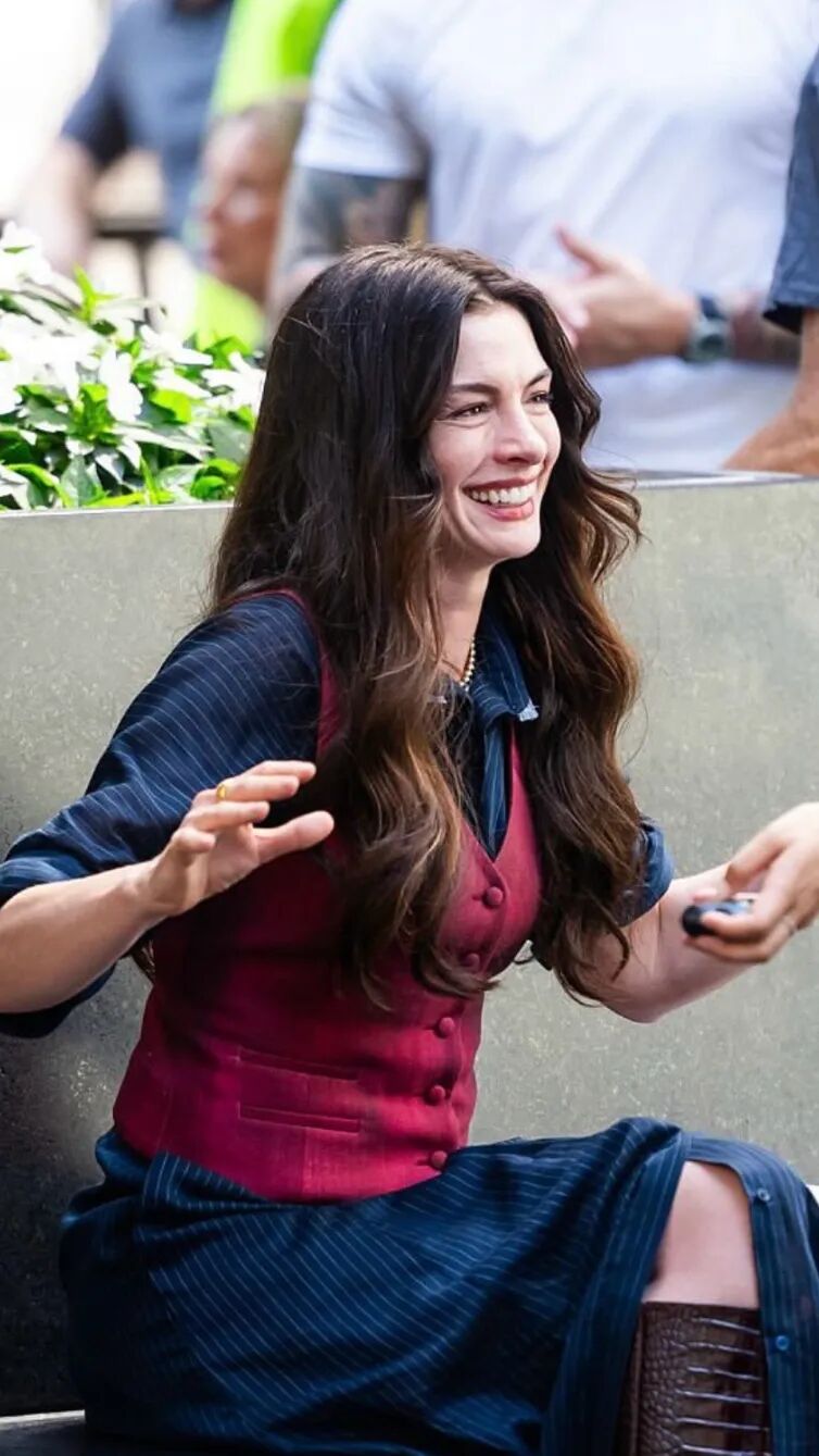 安妮・海瑟薇这套蓝色条纹裙打底,酒红马甲叠穿制造焦点,衬衫露出领口袖口增加呼吸感,Paris Texas长靴呼应酒红。看似法式优雅,实则在常规叠穿中,把基础色系搭配和现代设计的先锋感完美融合,让「职场实穿」有了故事感。