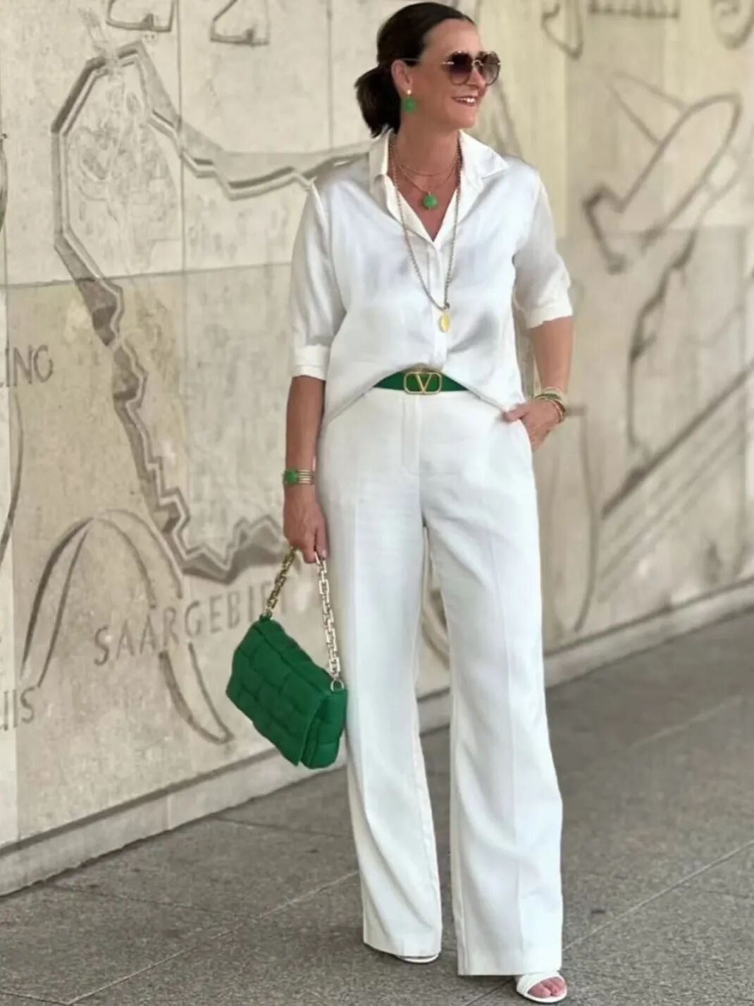 一件挺括的衬衫是“新”高智风的起点。解开两颗纽扣露出锁骨,搭配高腰烟管裤,用金属袖扣替代传统领带,瞬间从「乖乖女」进化为「冷脸甜心」,兼顾松弛与精致。