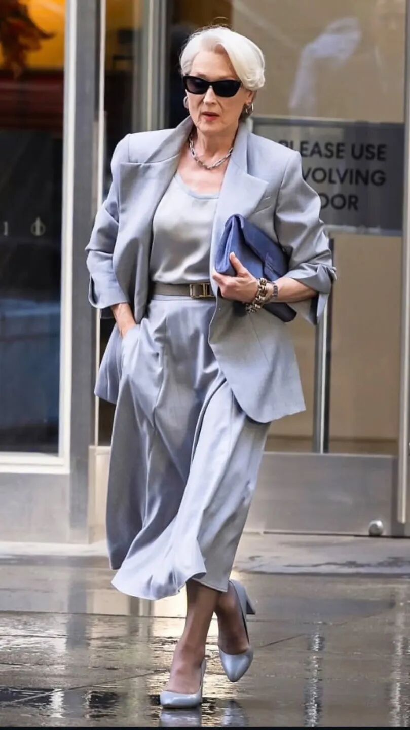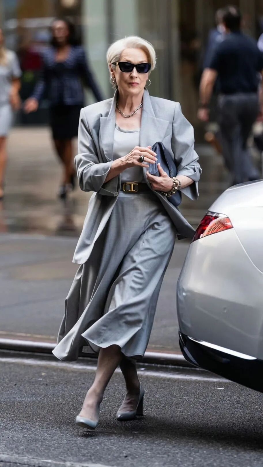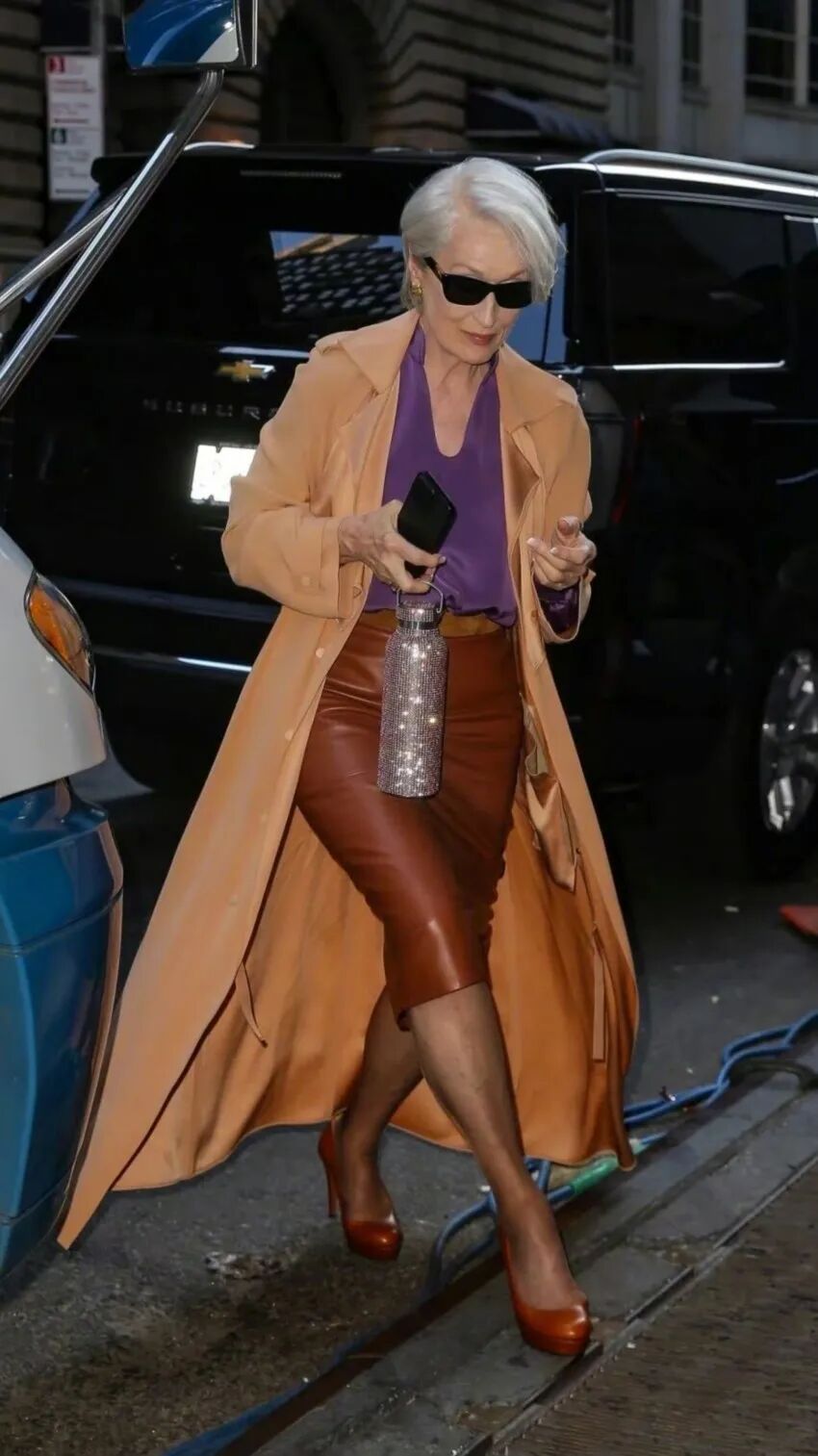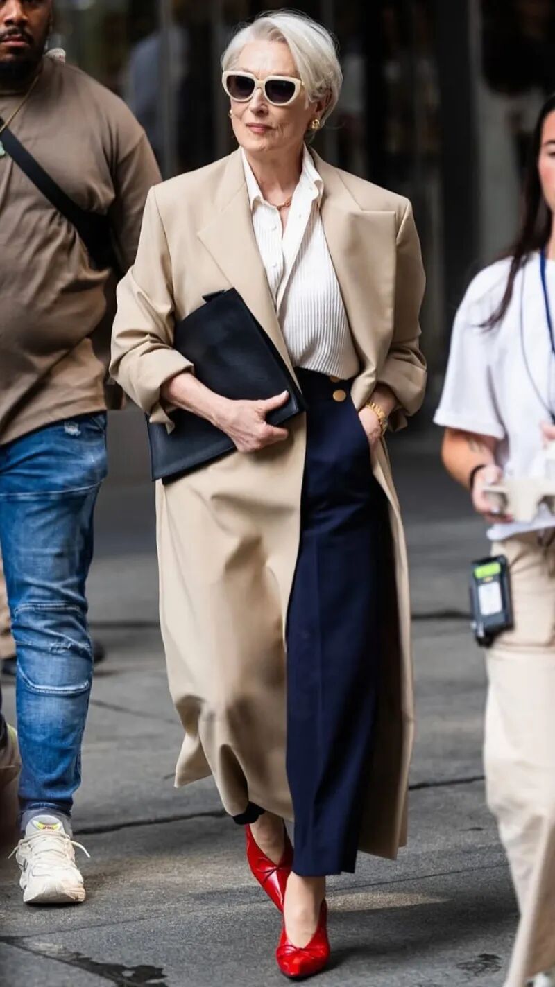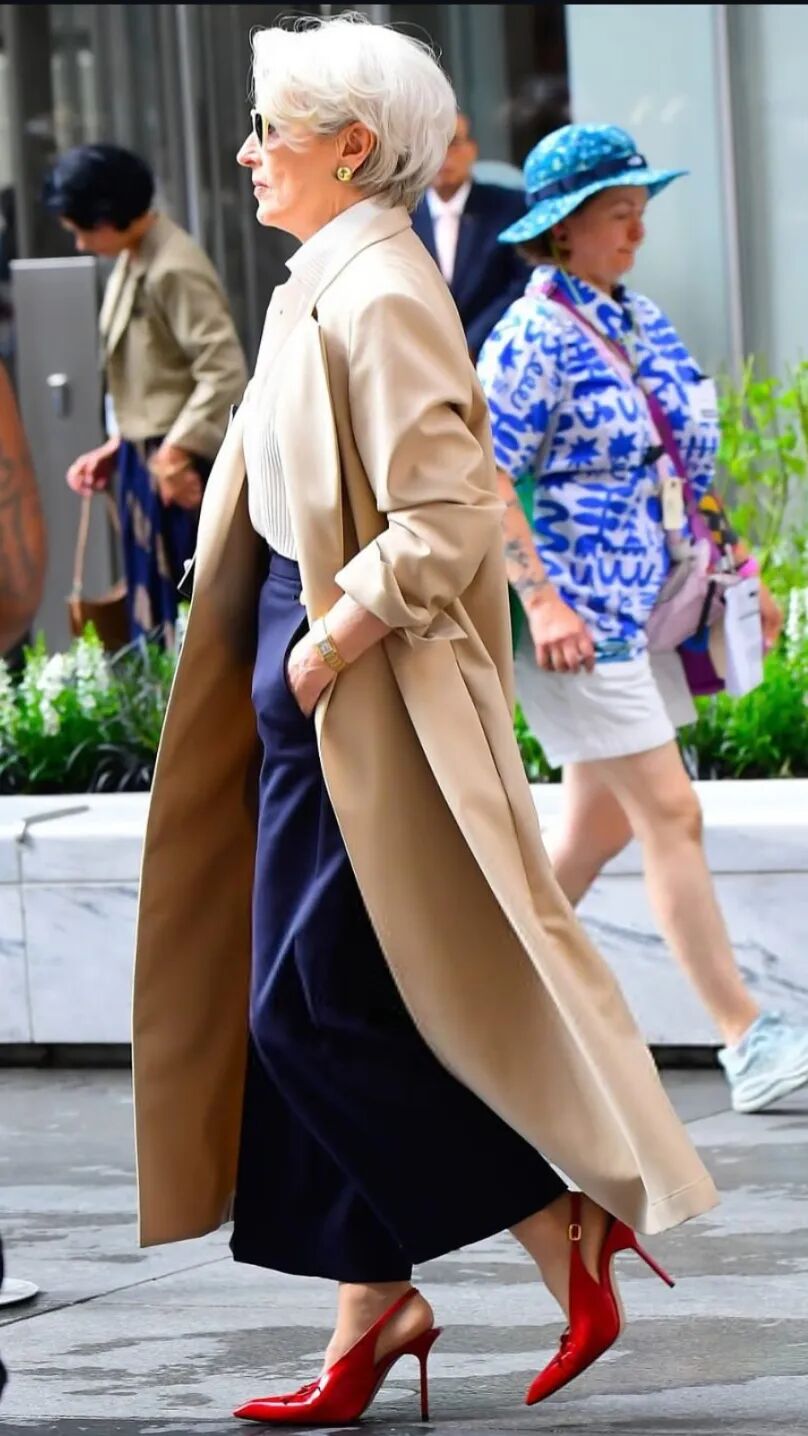 梅丽尔·斯特里普这套驼色大衣则自带老钱滤镜,内搭白衬衫+藏青阔腿裤,基础色碰撞出 “静奢” 质感;Jacquemus红鞋是神来之笔,用跳脱色彩打破驼色沉闷,Tiffany & Co.墨镜以简约线条呼应极简风,把「松弛感」和「精英感」捏合,走路带风却不显刻意。