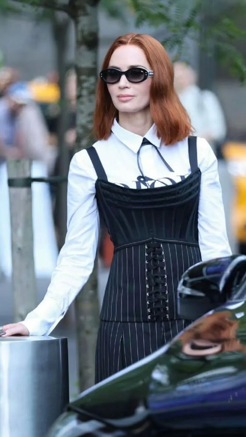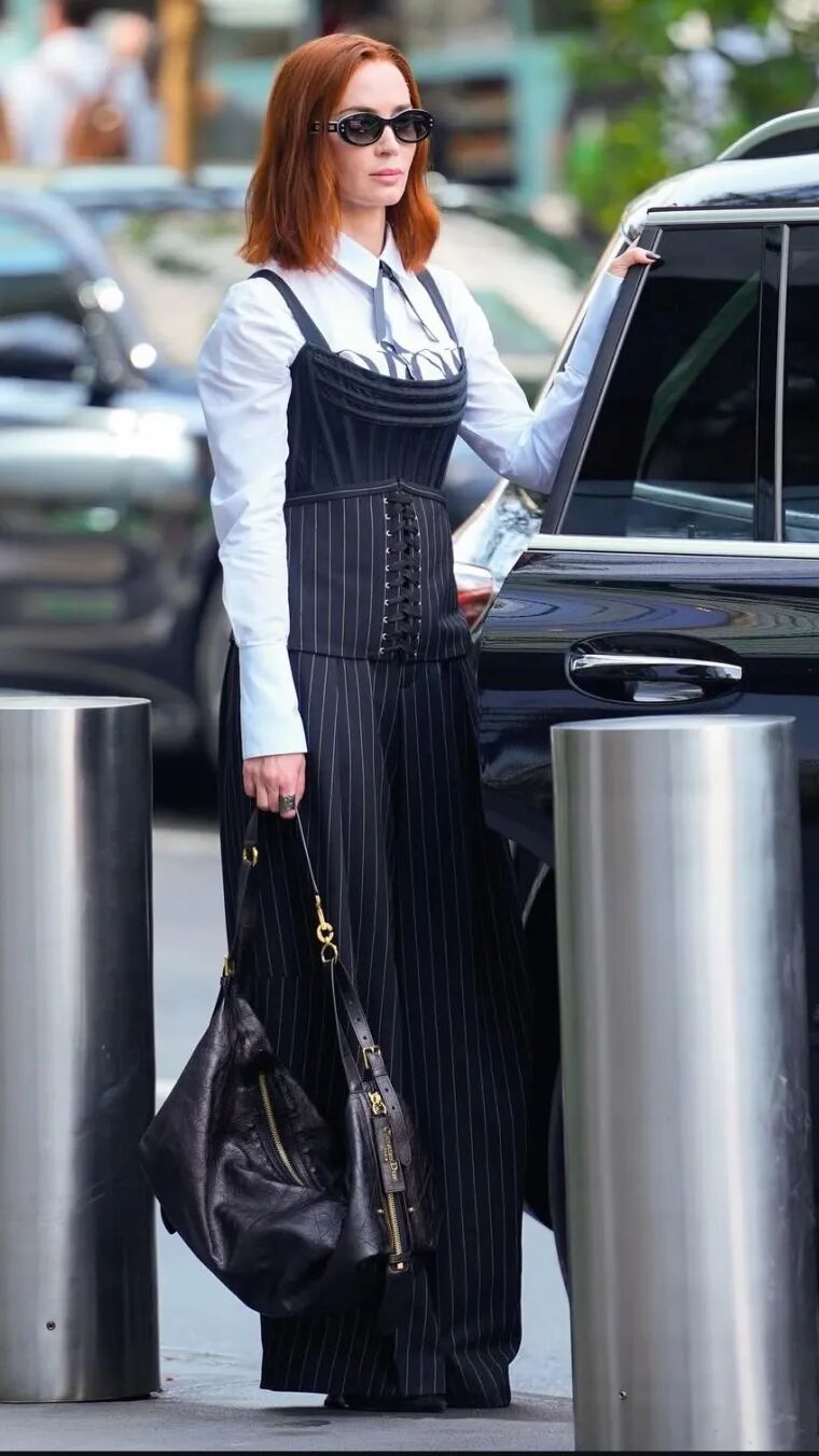 艾米莉·布朗特的白衬衫+条纹背带裤本是乖乖牌组合,Wiederhoeft鱼骨胸衣横空出世,用结构塑形重塑身体线条,Jean Paul Gaultier条纹裤的阔腿剪裁平衡紧身胸衣的束缚感,Dior D-JOURNEY手袋强化暗黑气场。
