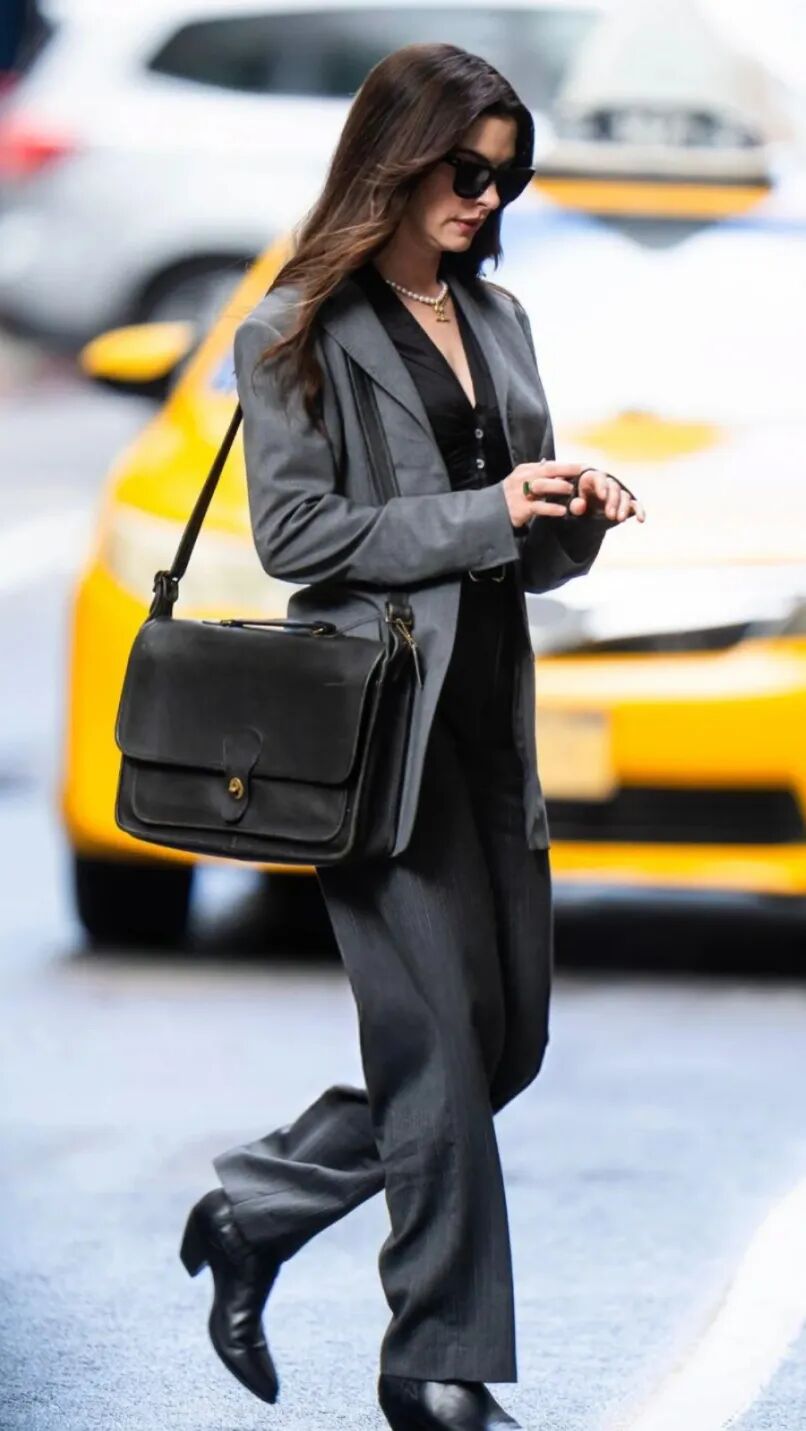 另外一套剪裁利落的灰色西装,内搭简约黑色上衣,利落又显气场。搭配Barton Perreira方框墨镜增添气场,Jemma Wynne项链则用来点缀精致感,每一处细节都在诉说着专业与格调。