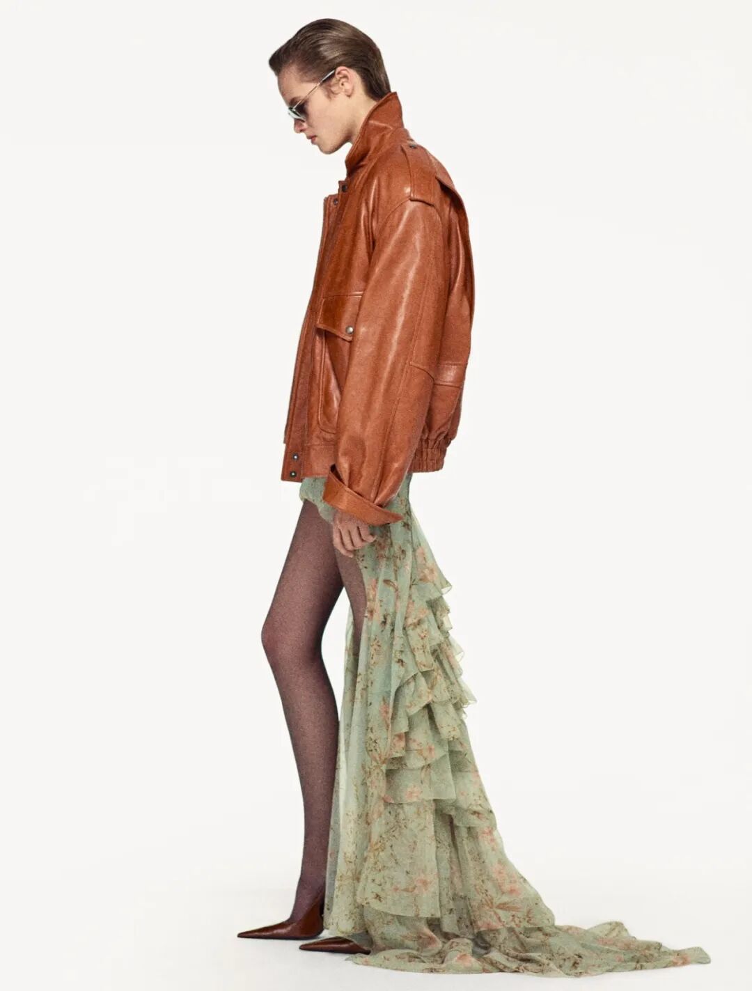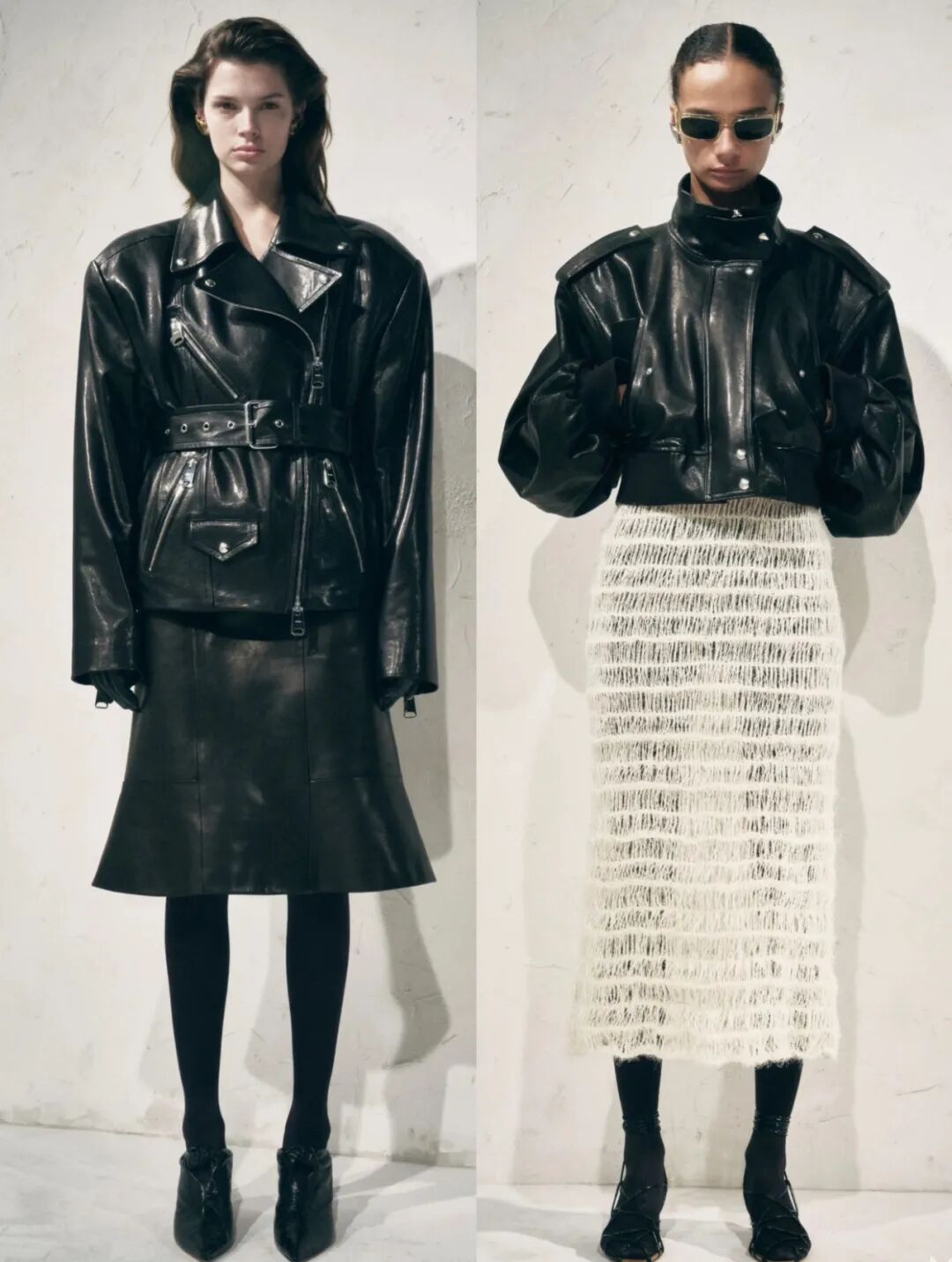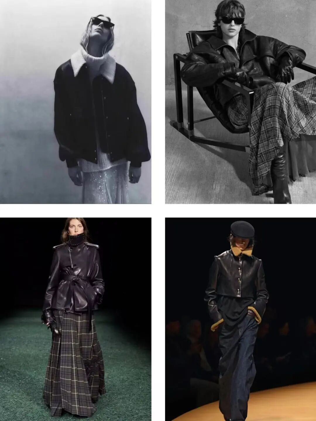 近年来,飞行夹克在女装中的崛起更值得关注。Miu Miu用短款设计搭配百褶裙,制造“刚柔并济”的少女感;Alexander McQueen则将飞行夹克与解构手法结合,夸张的肩部与收紧的腰线让它具备雕塑感。