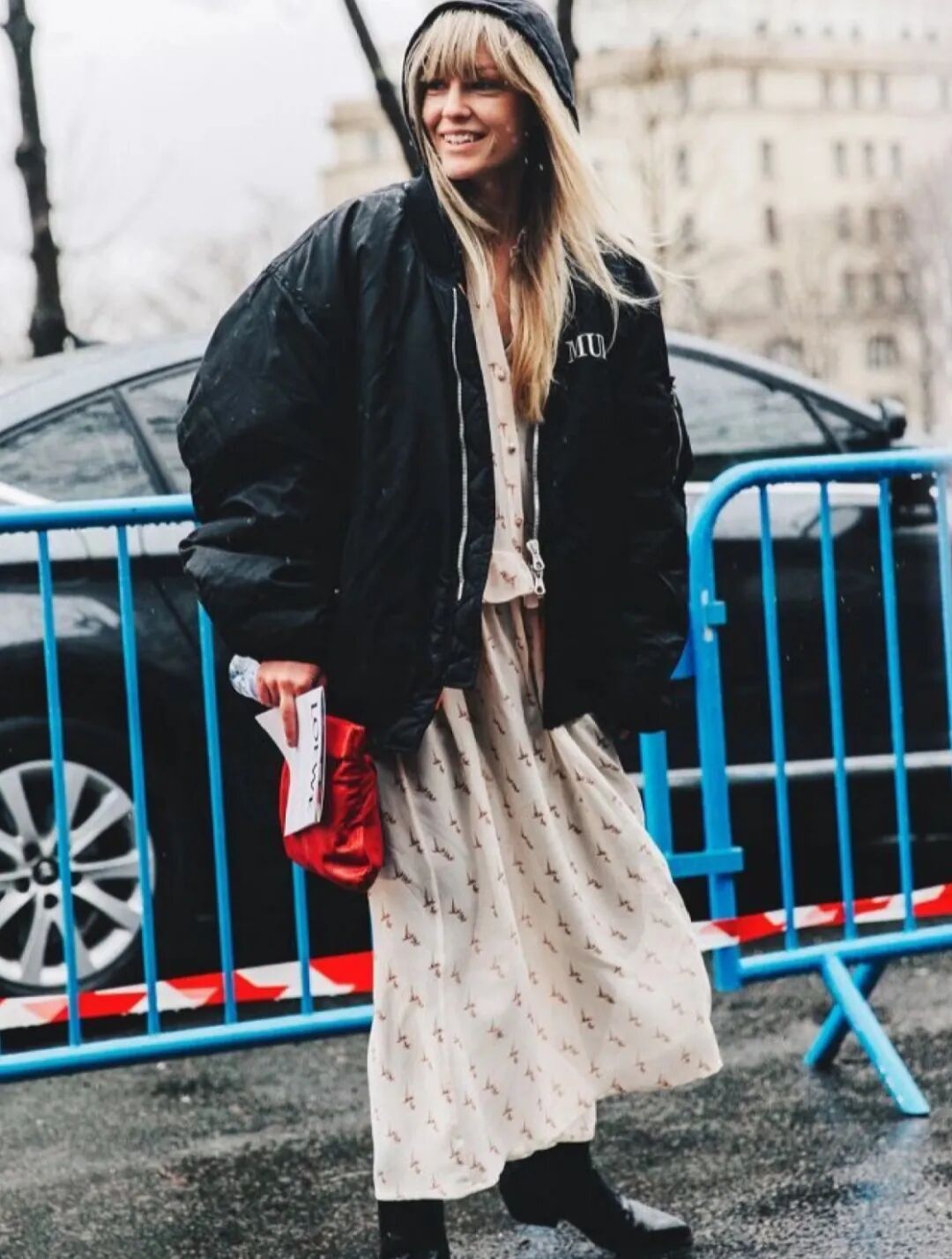 最经典的柔与刚平衡,是宽松飞行夹克配上紧身打底与高腰牛仔裤,营造上宽下窄的比例。如果想要更具女性气质,不妨将飞行夹克与连衣裙结合,让丝绸、雪纺等轻盈材质与尼龙外套进行碰撞。