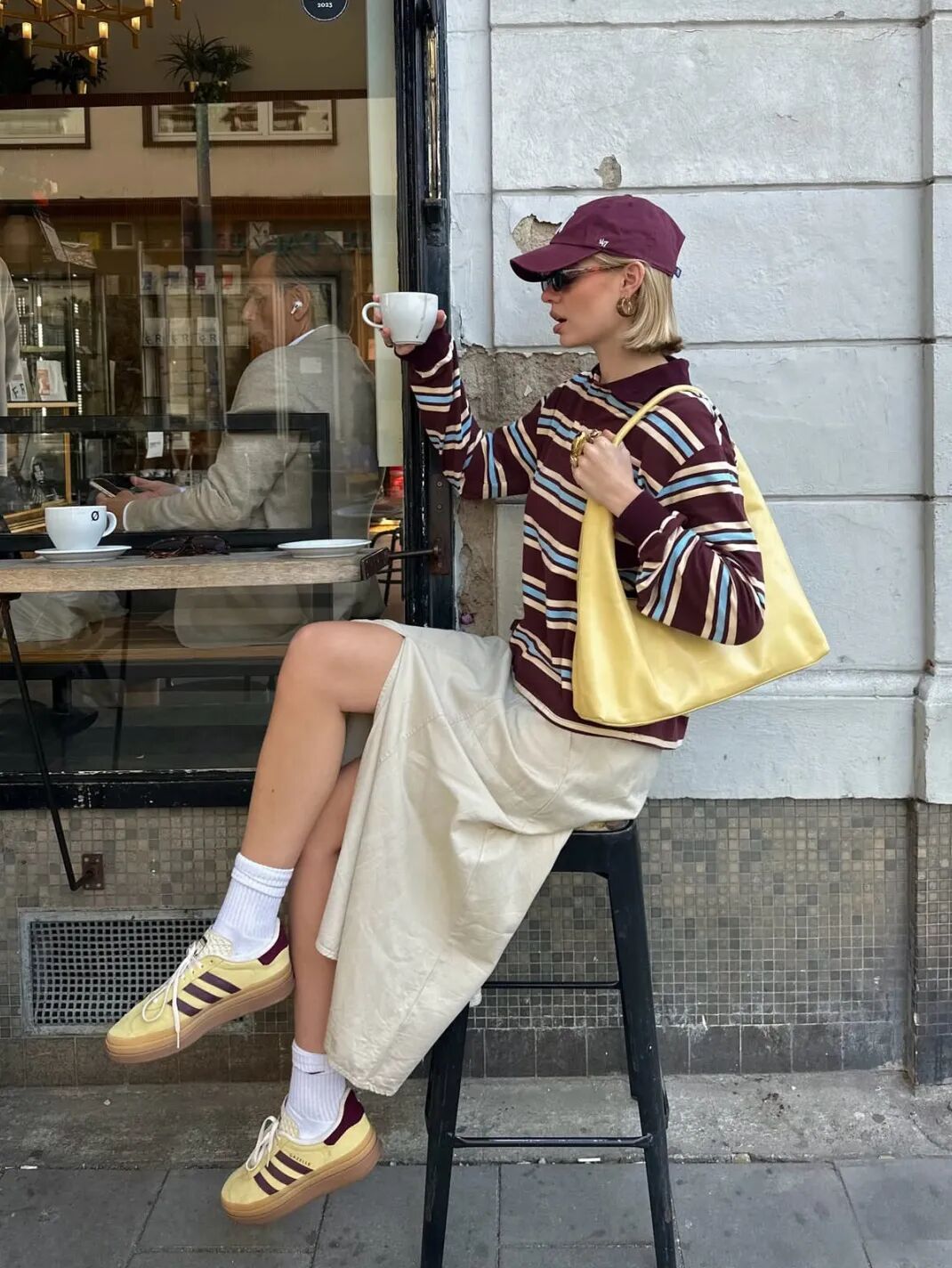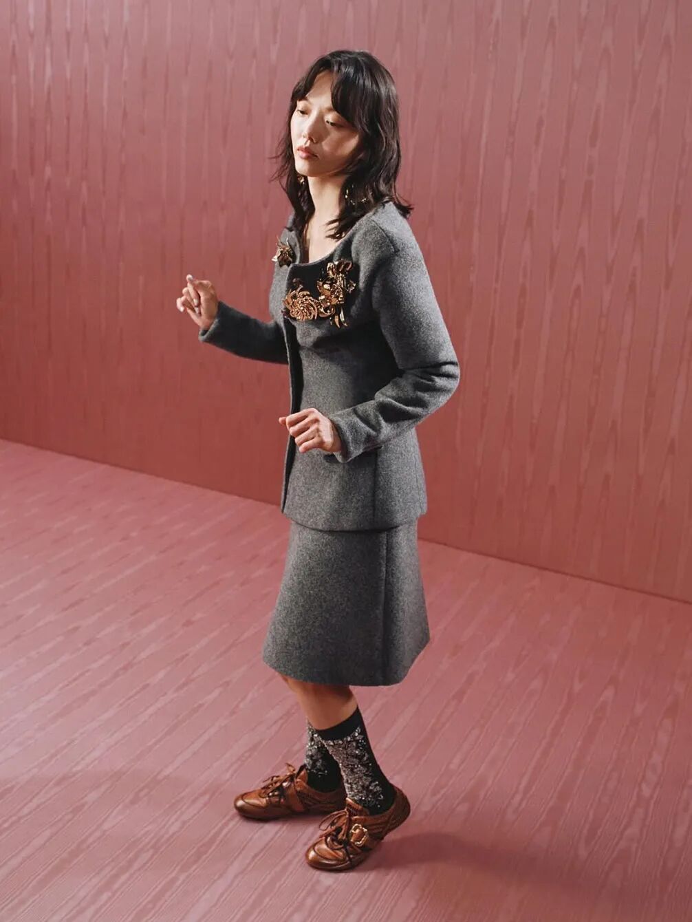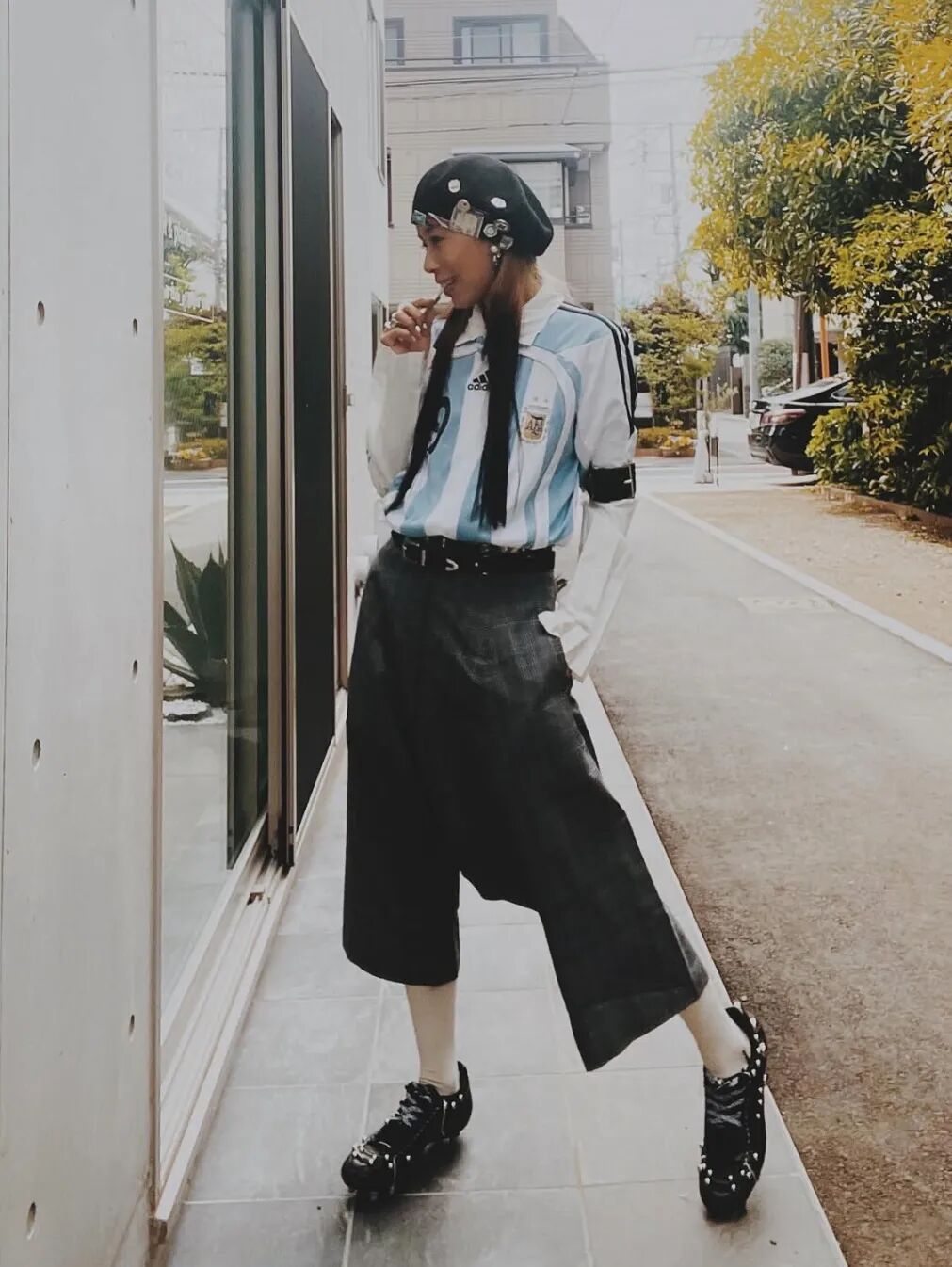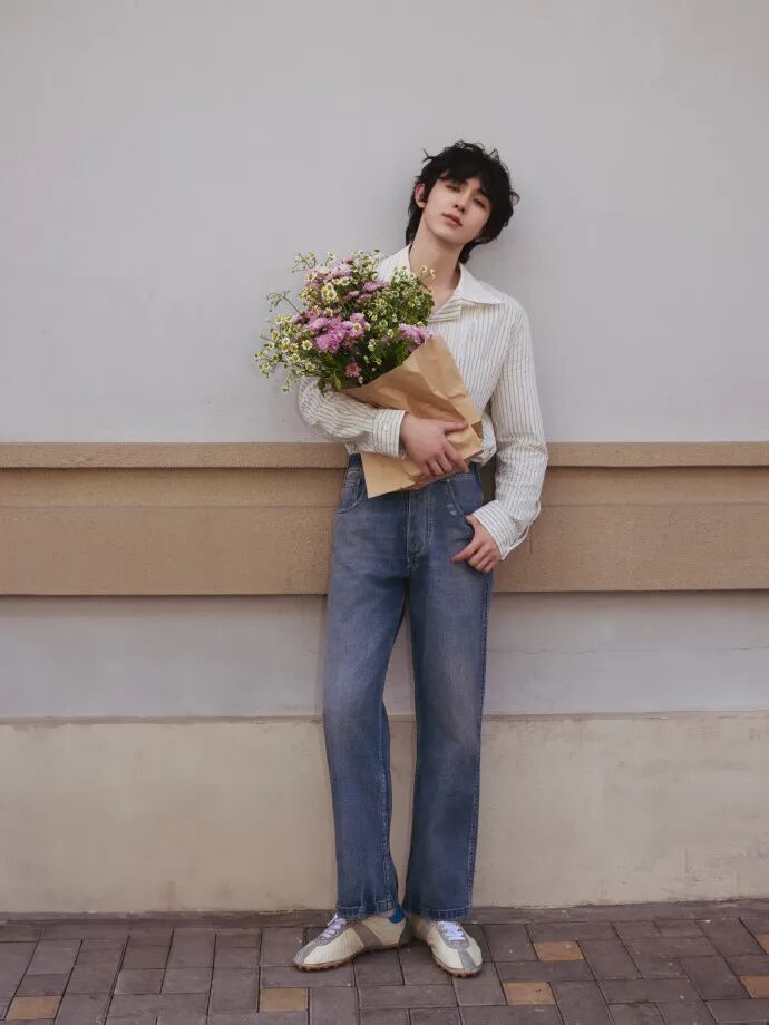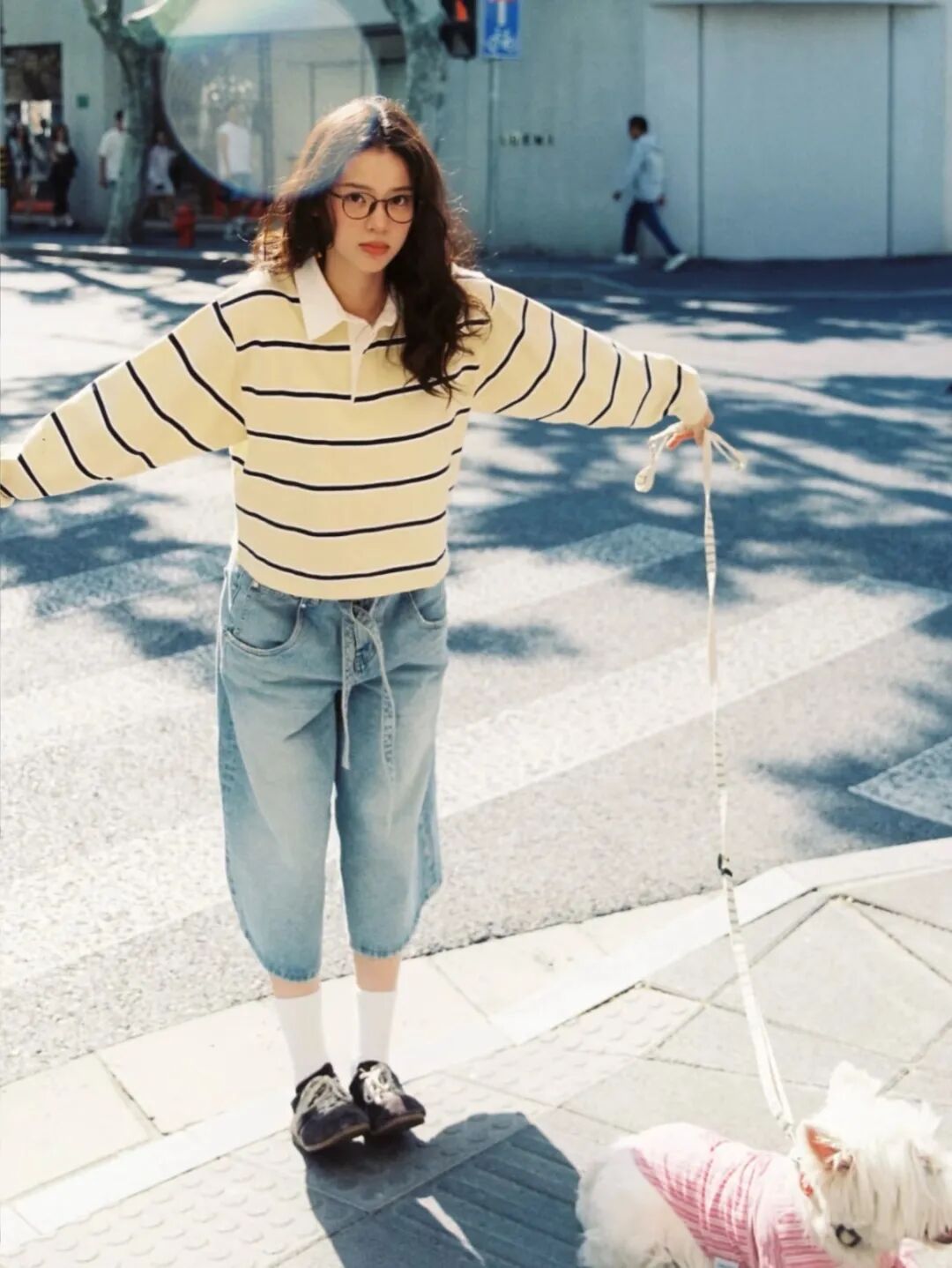 而在另一套造型中,她选择Dries Van Noten咖色薄底德训鞋为核心,搭配条纹Polo衫与牛仔阔腿中裤,复古松弛又显利落,日常好借鉴。