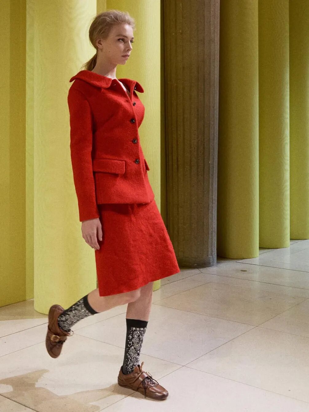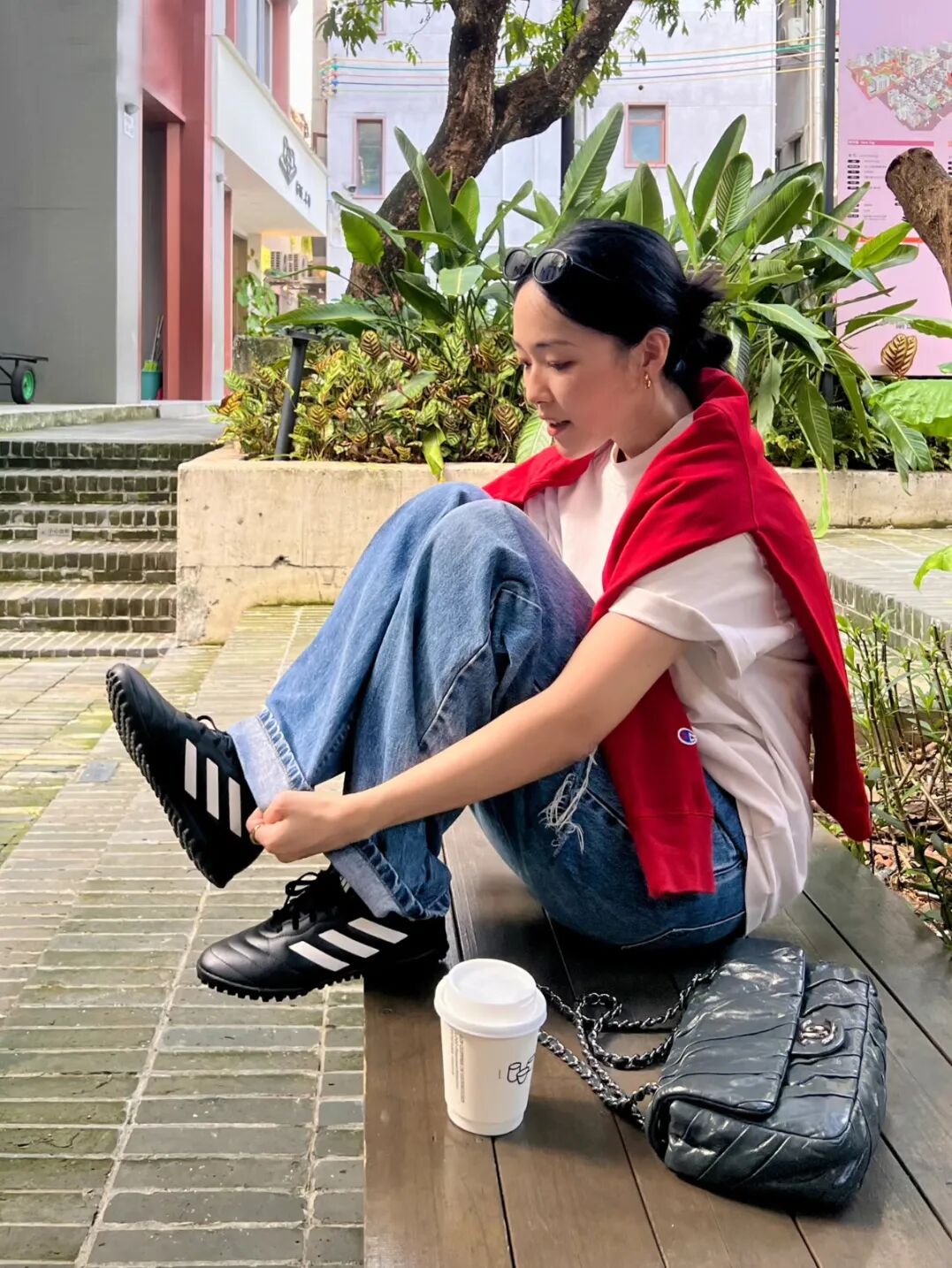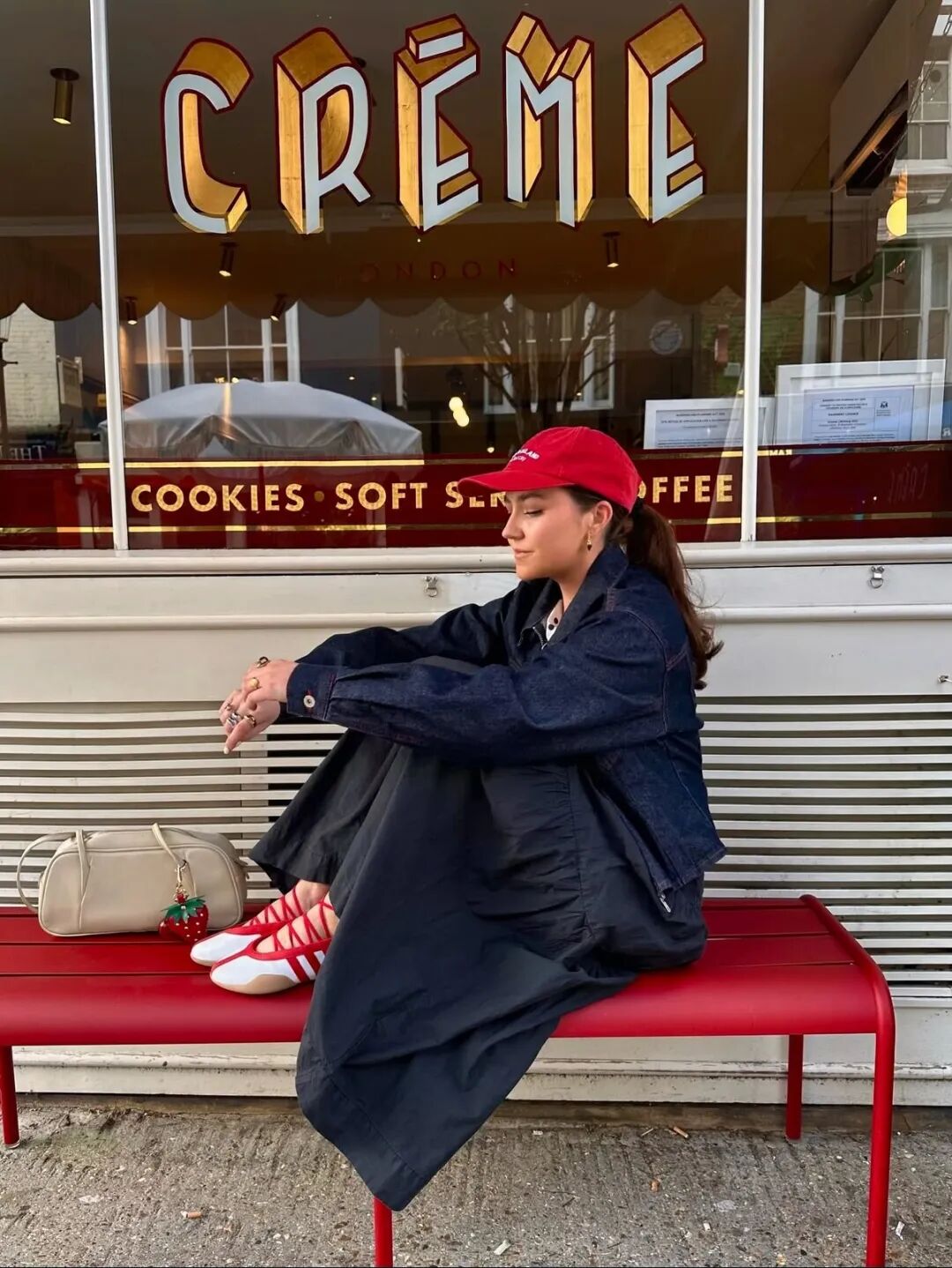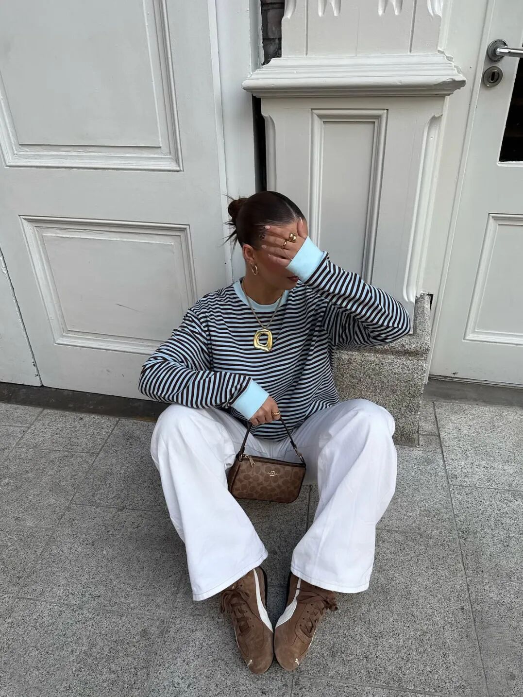 而在另一套造型中,她选择Dries Van Noten咖色薄底德训鞋为核心,搭配条纹Polo衫与牛仔阔腿中裤,复古松弛又显利落,日常好借鉴。