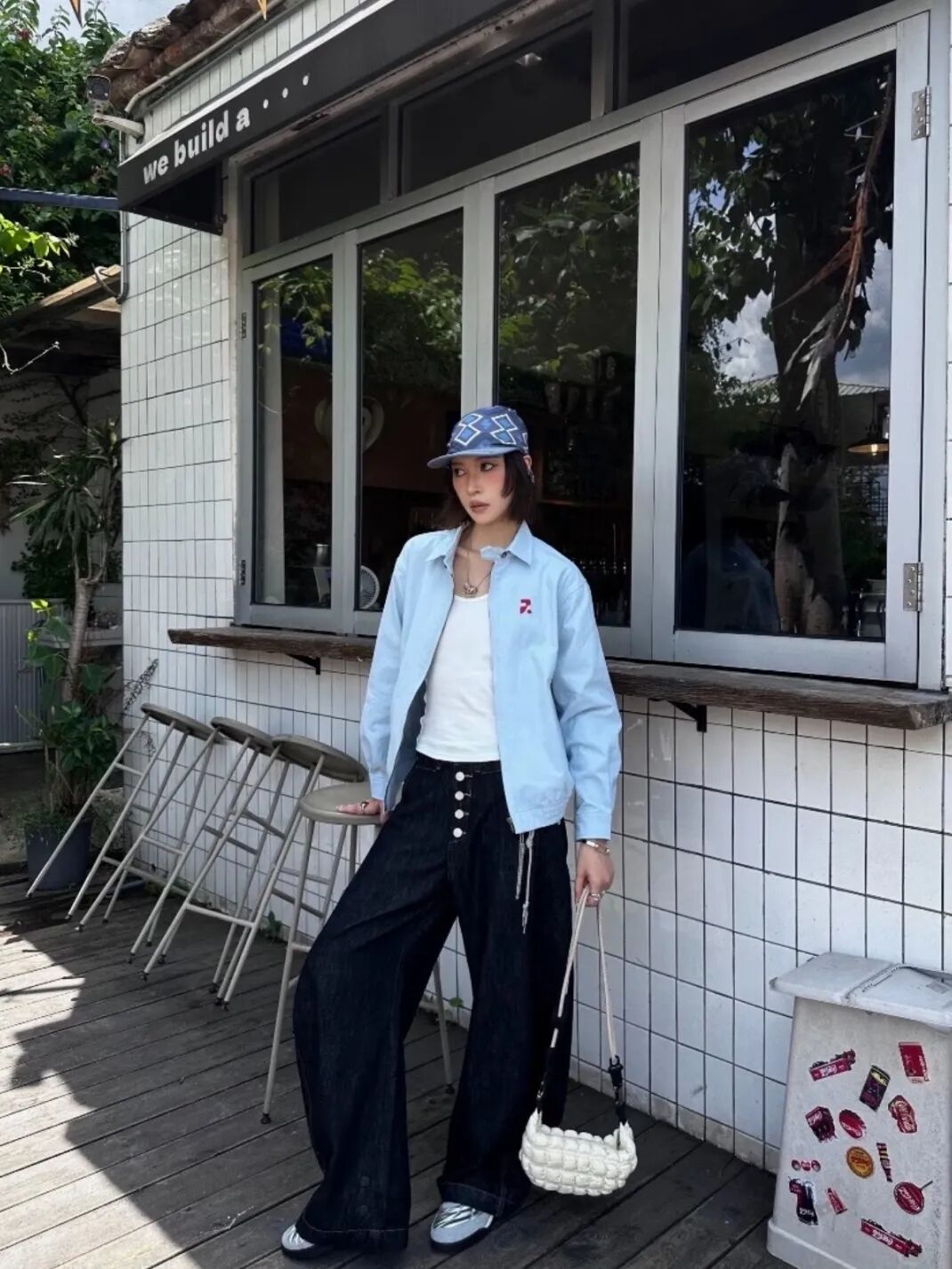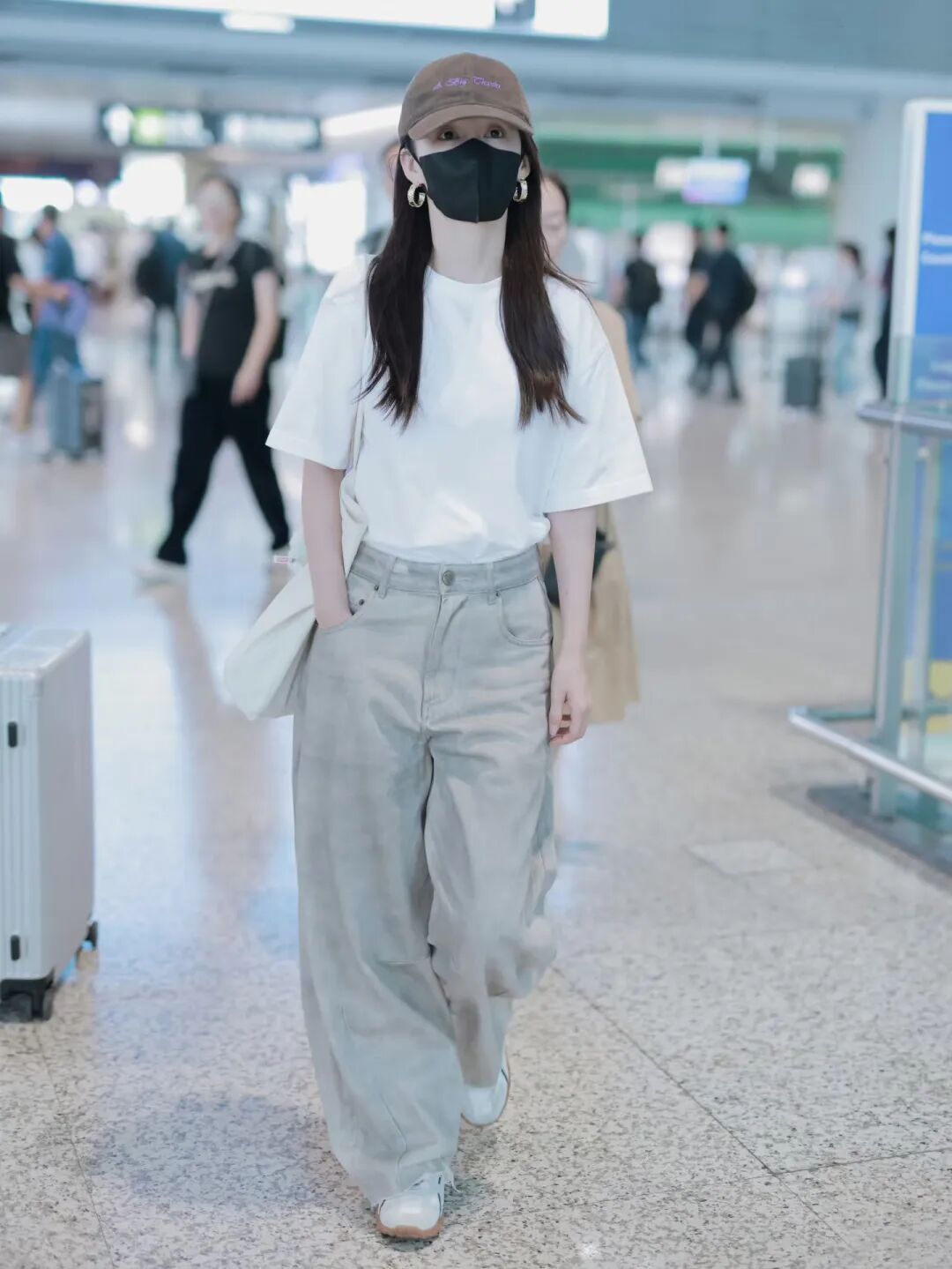 李沁的Buffalo小白鞋为亮点,搭配宽松白T与浅灰阔腿裤,再用棒球帽点缀,整体风格简约利落,通勤出街都适配。