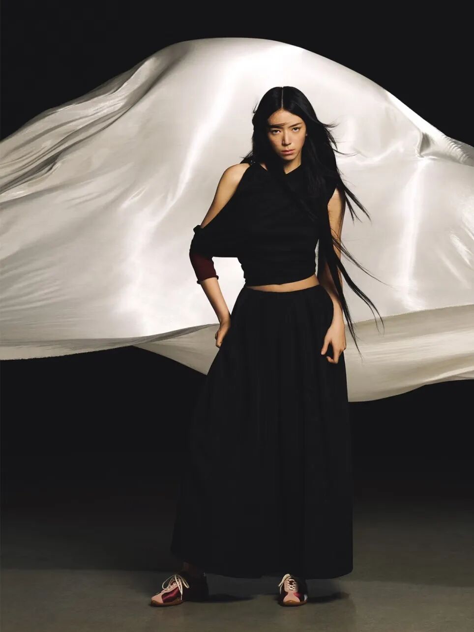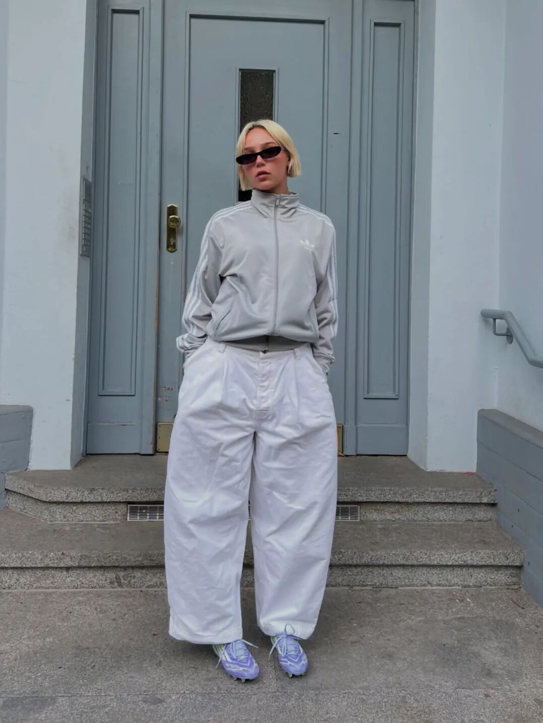 薄底德训鞋搭配廓形套装,内搭可选择紧身或crop top露出腰线,打破套装的沉闷感,营造干练又时髦的职场形象。