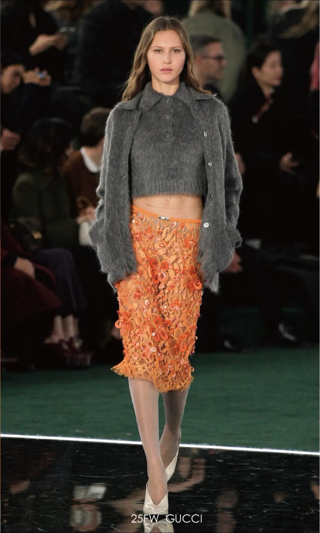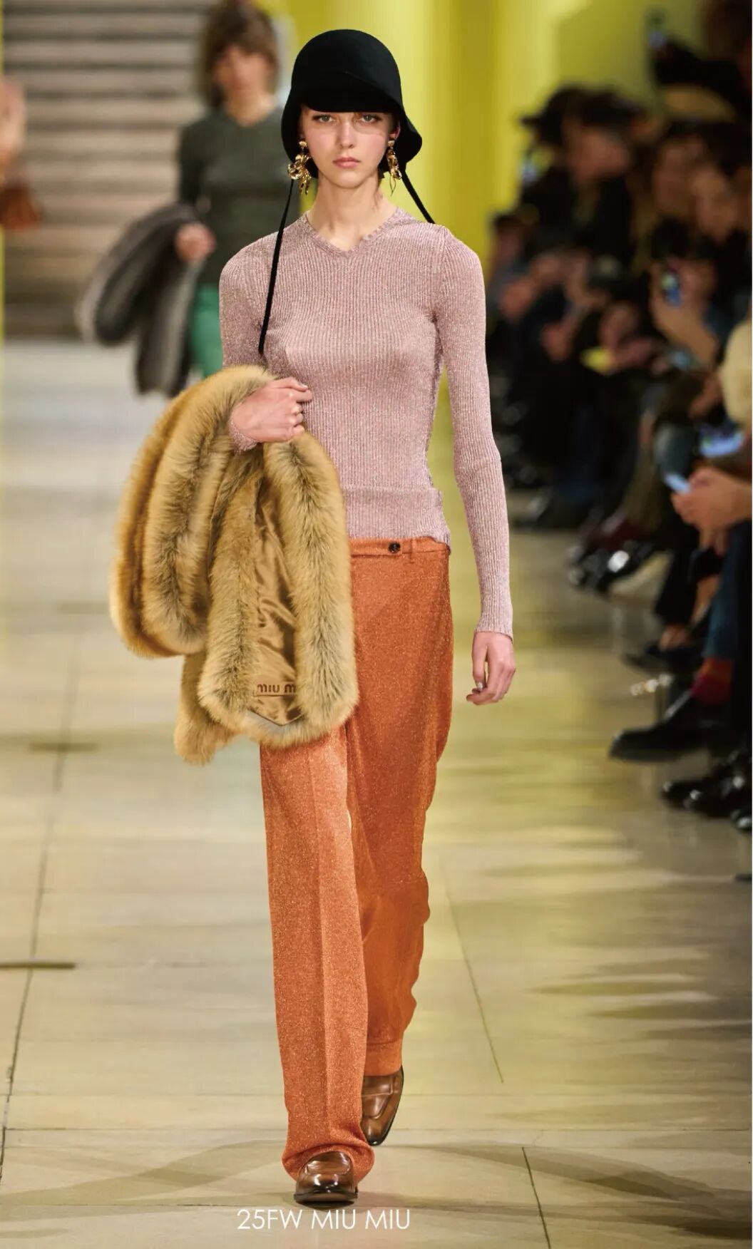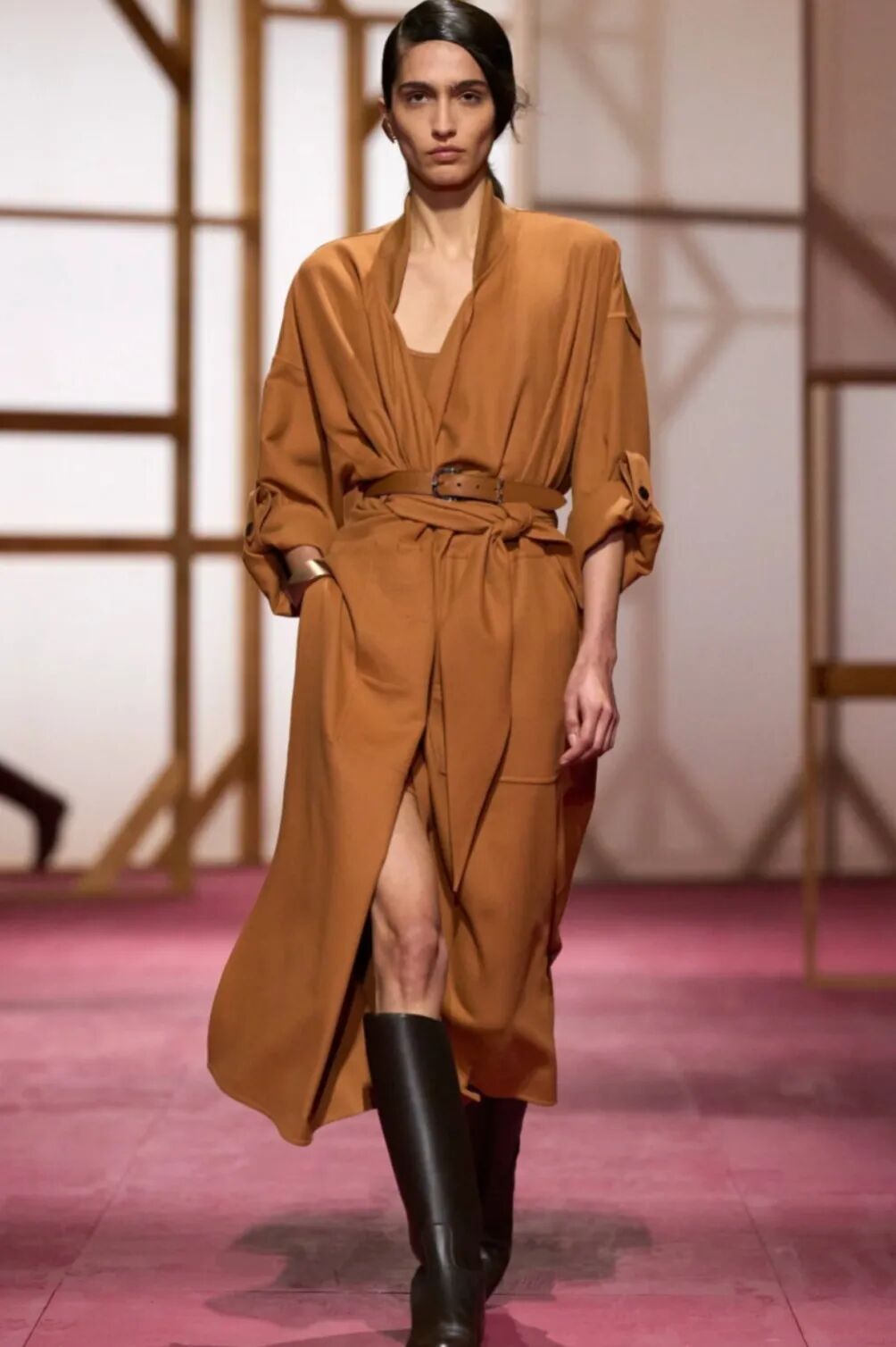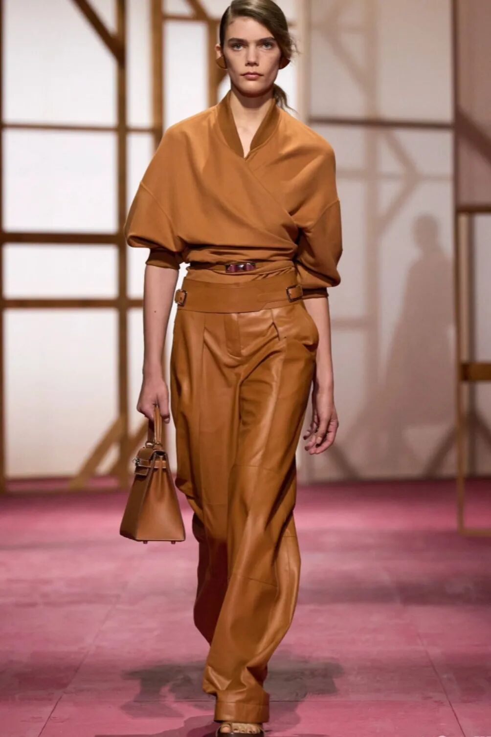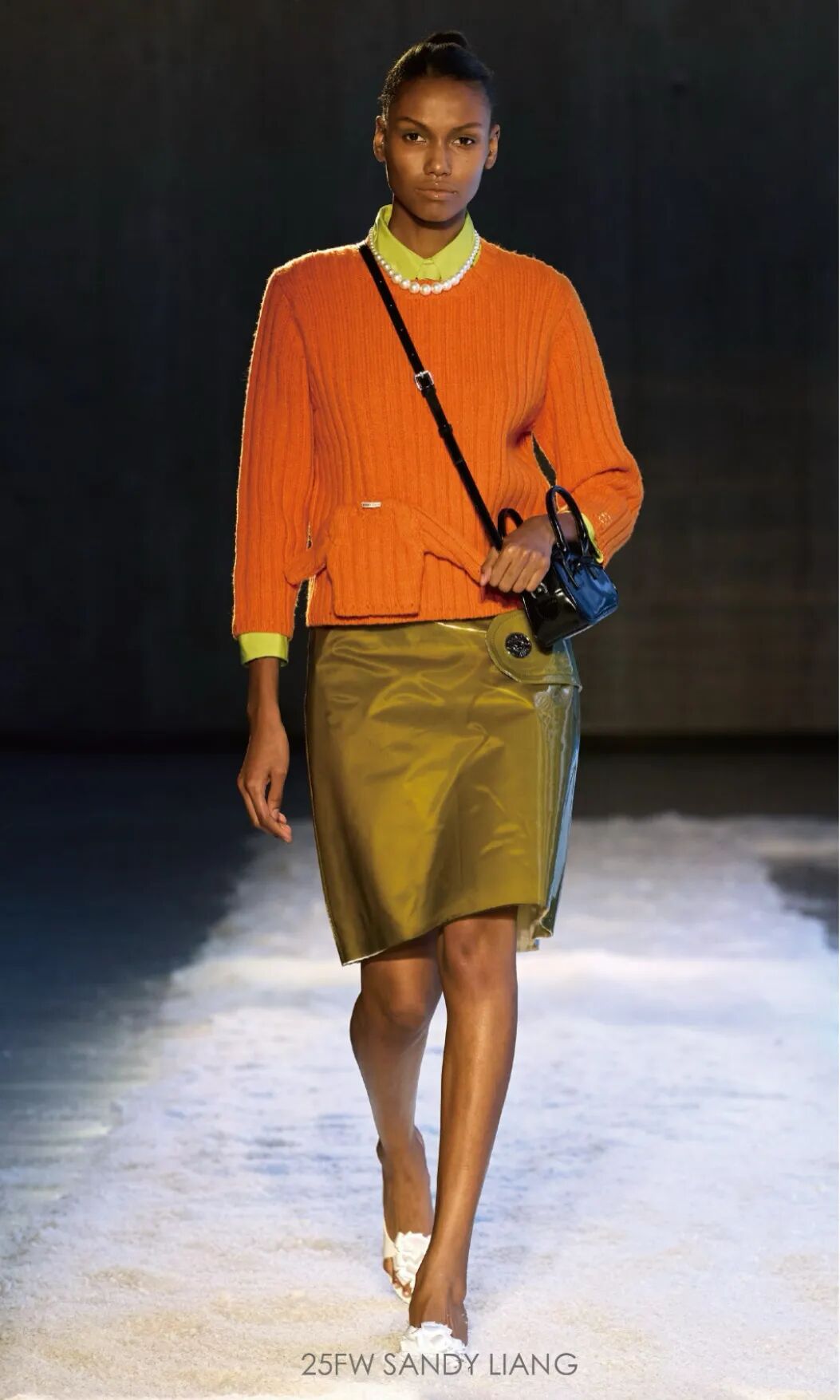 今年,南瓜色在秀场上同样频繁出现。从 Tory Burch 的长款大衣,到 Ferragamo 的针织衫,再到 Loewe 的丝质衬衫,不同材质与廓形的演绎,使得这一色彩在优雅与街头之间自由切换。