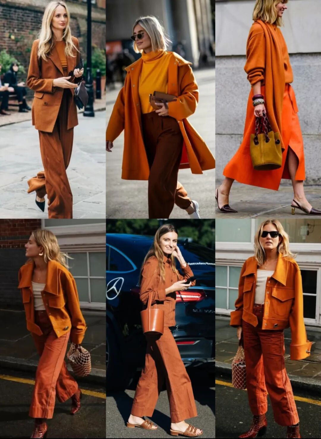 穿搭上,南瓜色最大的优势在于“可深可浅”。浅南瓜色更贴近米色与奶油色的区间,适合通勤与日常;而深南瓜色接近焦糖与铁锈红,气场强烈,非常适合大面积运用。若嫌大面积的南瓜色过于张扬,也可以通过配饰——一只南瓜色手袋、一双短靴或是一条丝巾——来点亮整体造型。