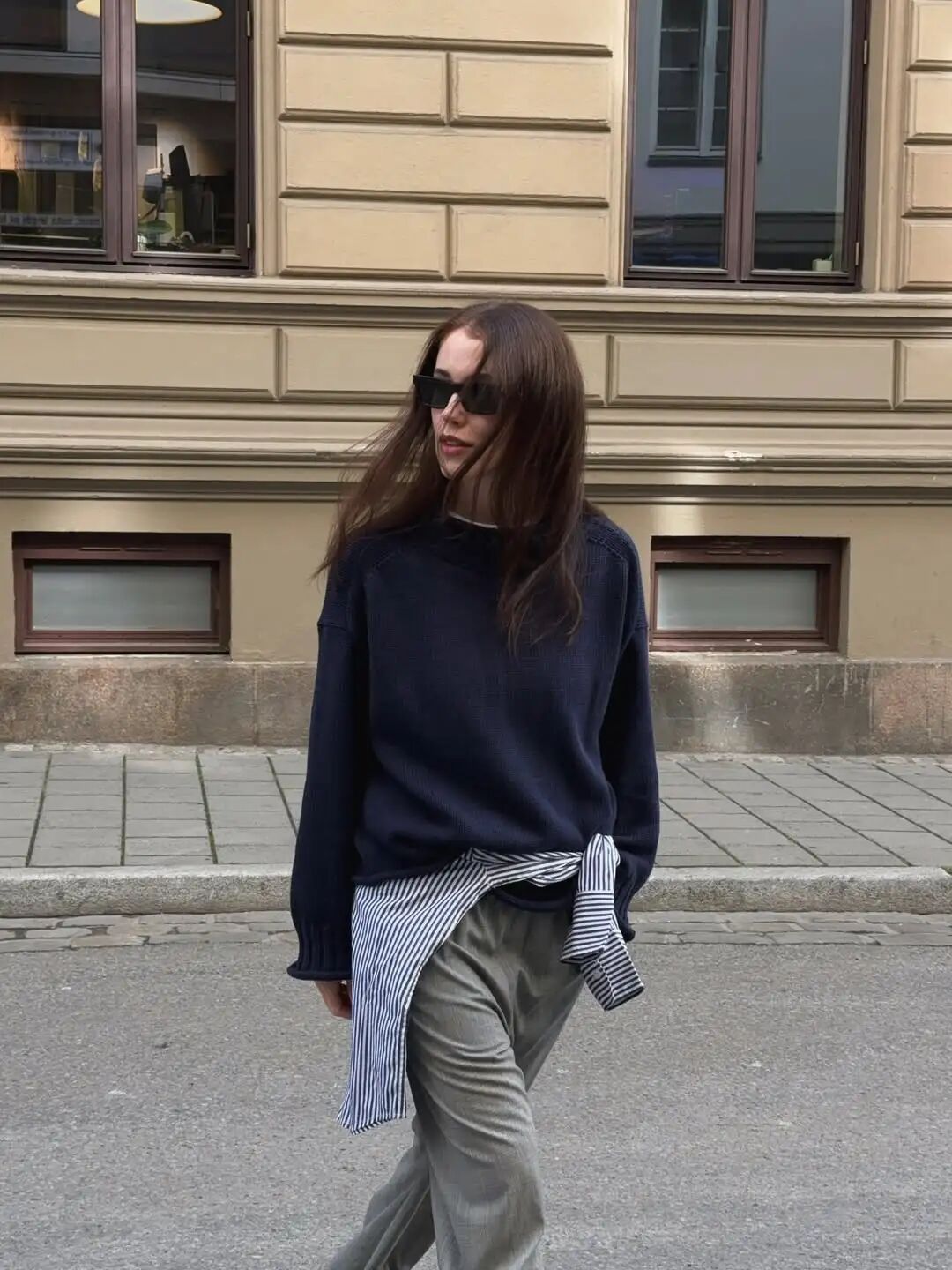 一件针织衫可以完美抵御最近的早晚温差,通勤穿搭中在腰间系一件针织衫,能立刻打破西服的严肃感,让造型更加chill。