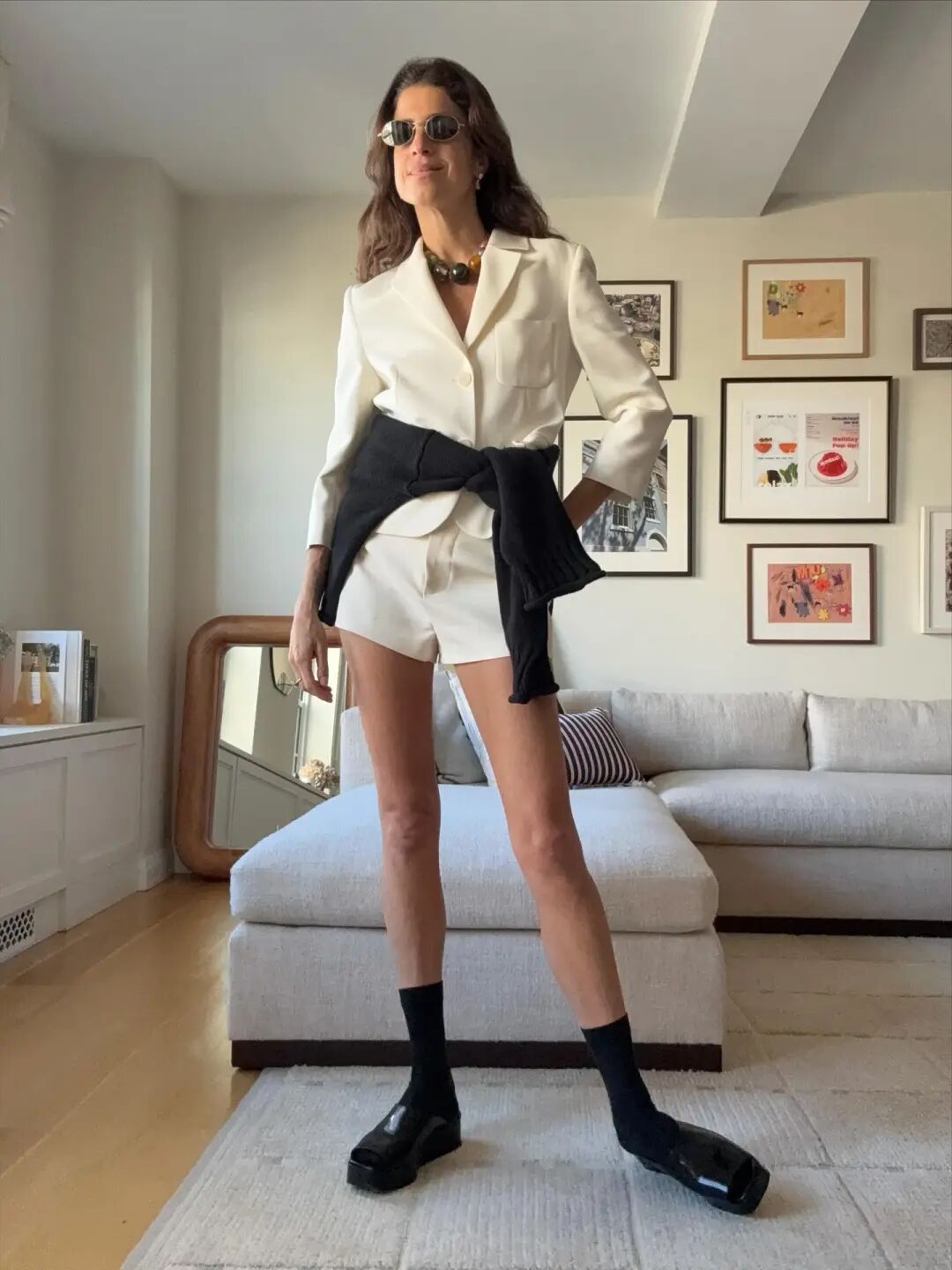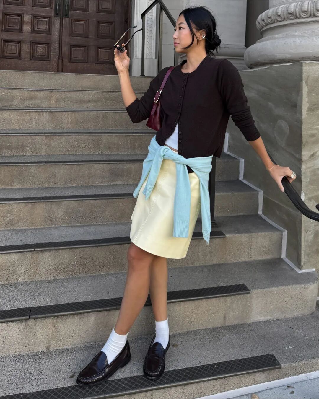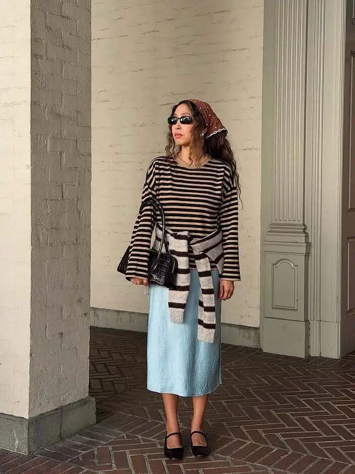 对于你的夏装先别急着收!用一件针织衫围在腰间,不仅能应对早晚温差,更能明确腰线,优化比例。选择与连衣裙顺色的针织衫,高级感拉满;选择对比色,则碰撞出意想不到的时髦火花。