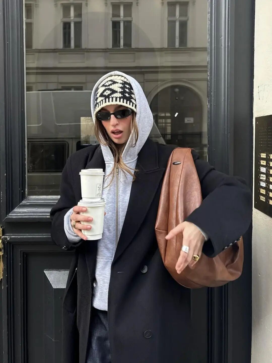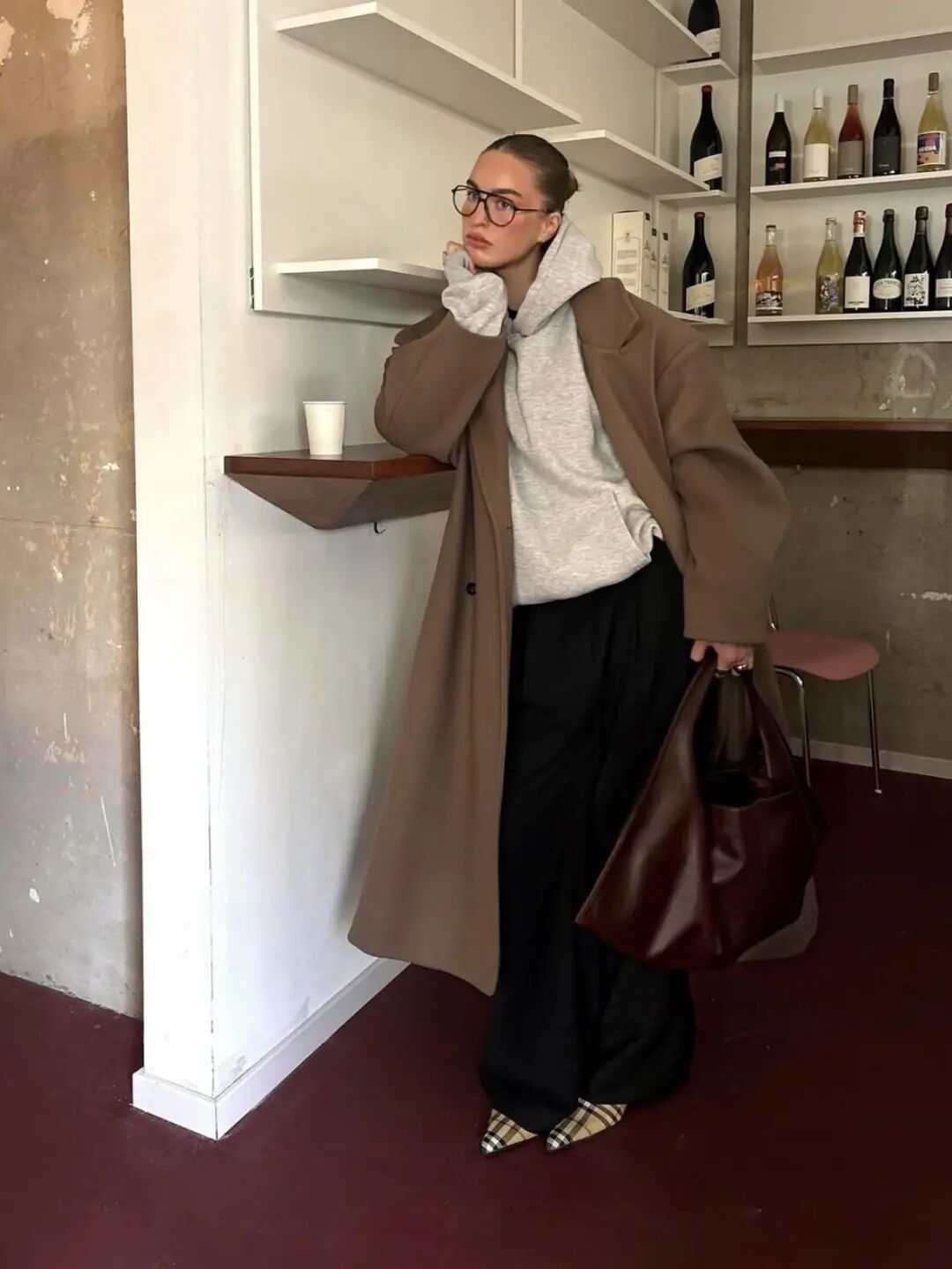 大衣+卫衣是秋冬常见的组合之一。选择连帽卫衣搭配羊毛大衣,帽子的存在打破了大衣领部的单调,增添层次感和年轻活力。