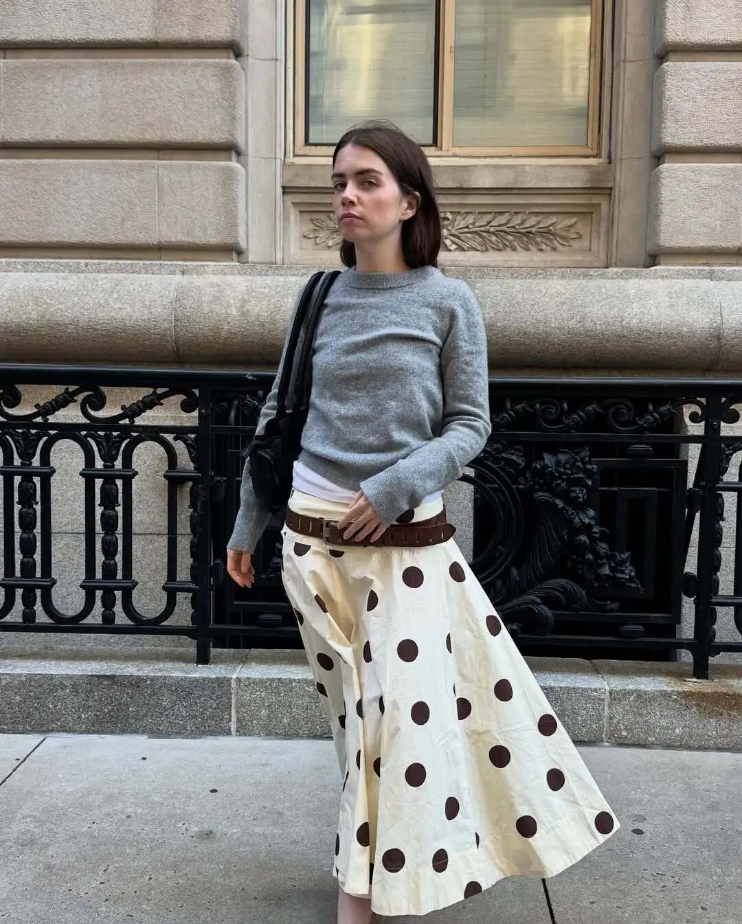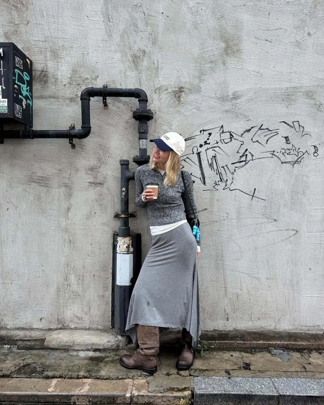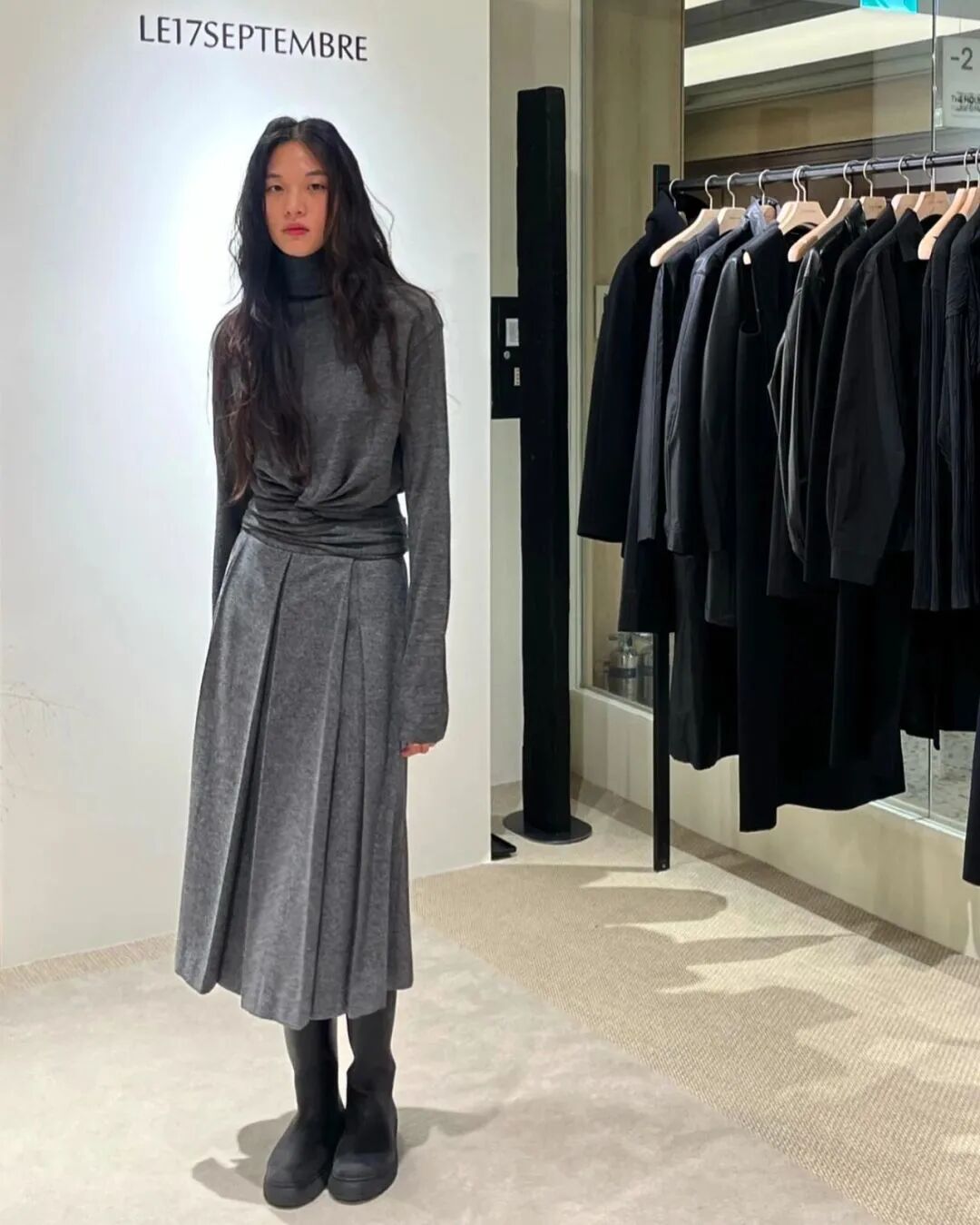 不知道怎么搭配时,同色系就是那个不出错的选择,灰色系的搭配更是把“克制美”发挥到了极致。用灰色打底搭配百褶裙或是大衣,颜色上从浅到深自然过渡,不同灰度会泛出不同的柔和光泽,像水墨画的渐变色,没有多余的色彩干扰,却靠面料的质感清晰分出层次。
