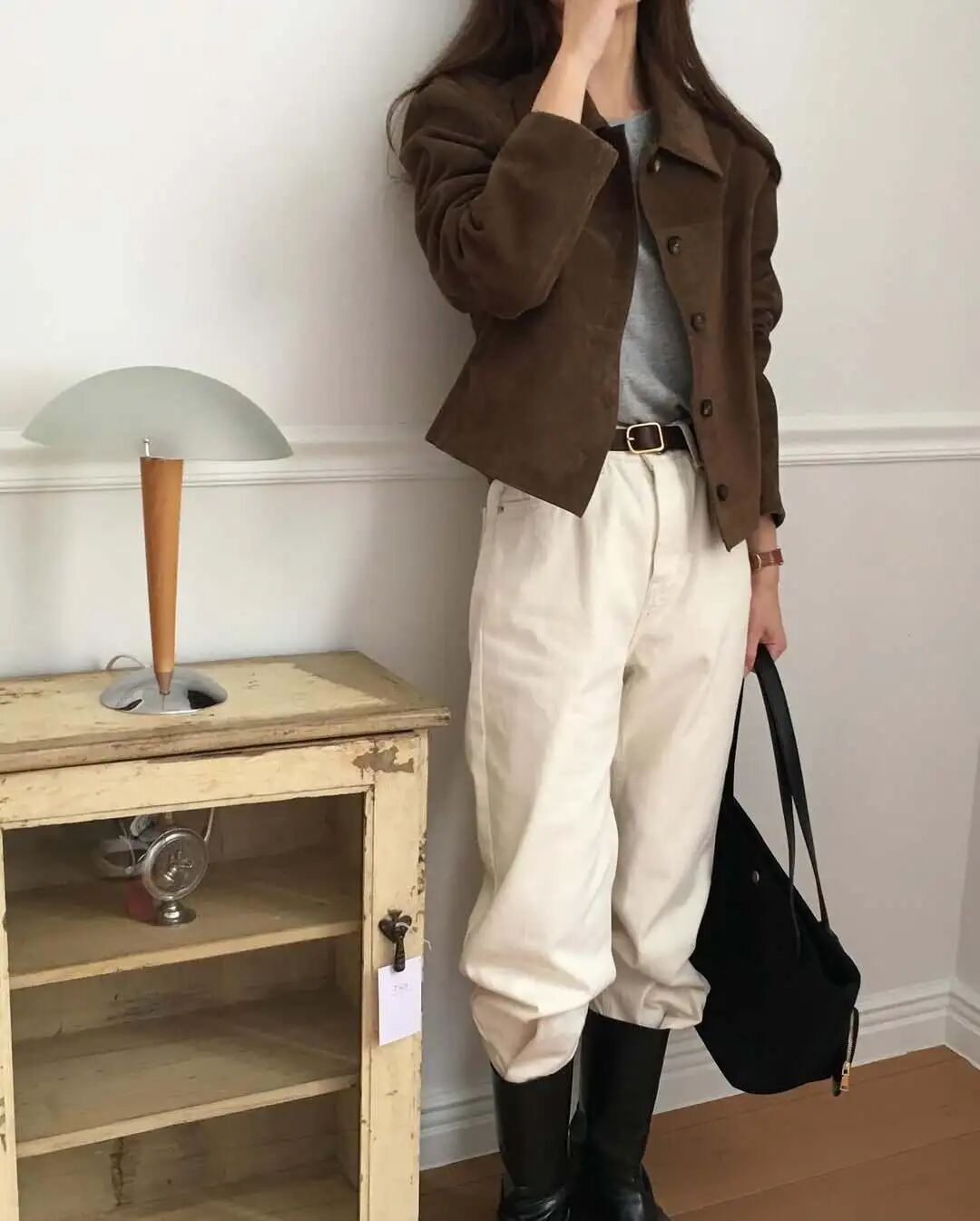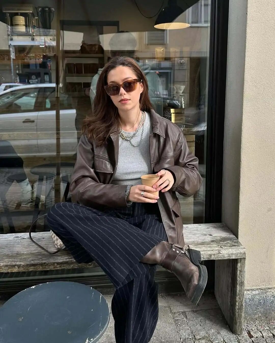 圆领的灰色打底是更加“不挑人”的单品,正如它圆润柔和的线条,哪怕遇上西装、皮衣这种带点“锋利”感的外套,也能以柔克刚,展现出化繁为简的温柔魅力,让整体造型多了份松弛。