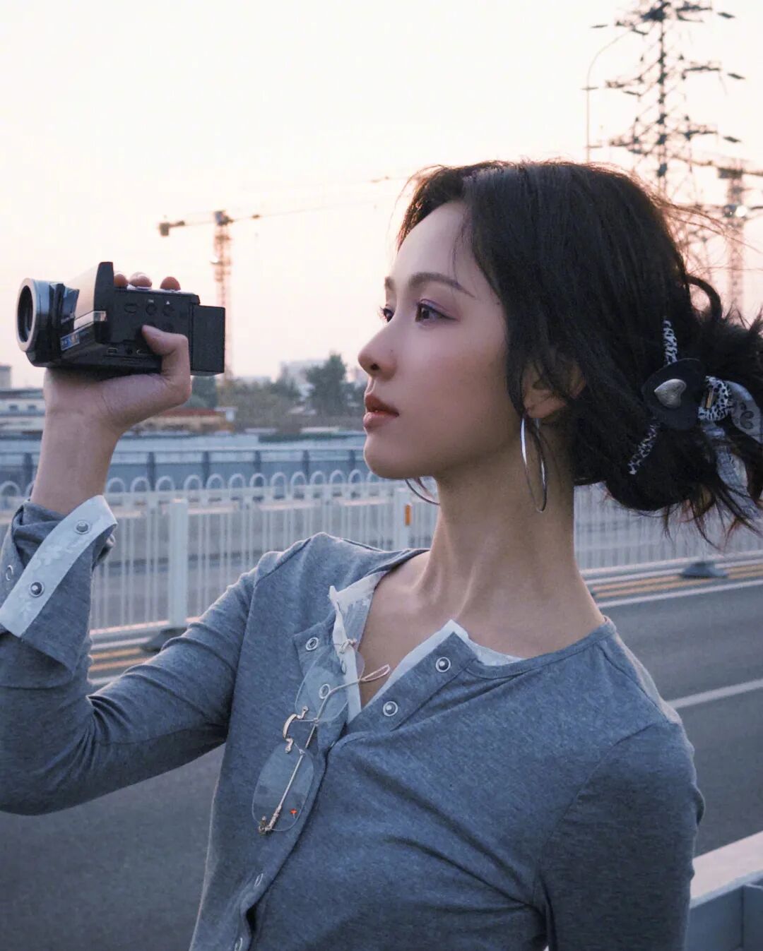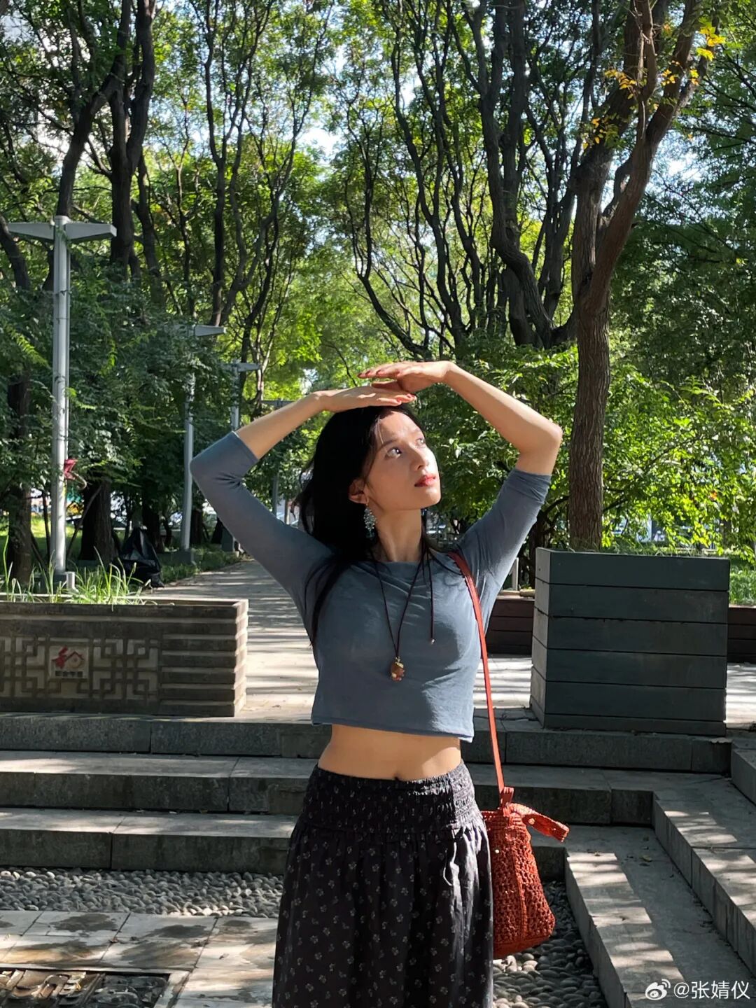张婧仪上身的这件灰色打底可以说是“心选内搭”了!没有复杂印花与夸张剪裁,修身却不紧绷,自然贴合肩颈与腰线曲线,清爽中透着利落。
