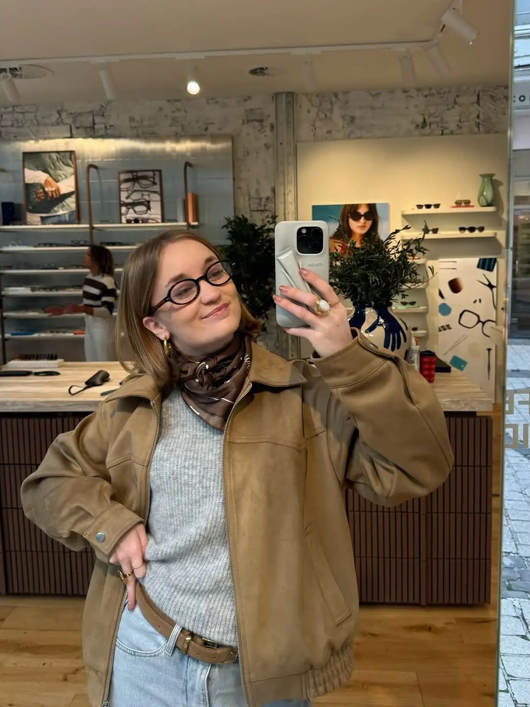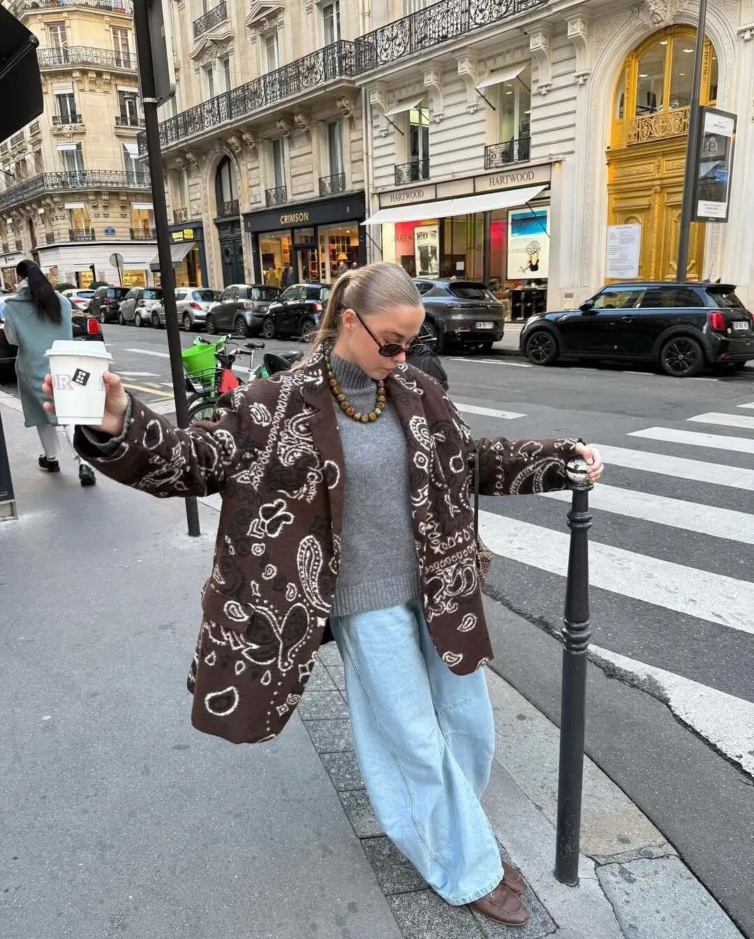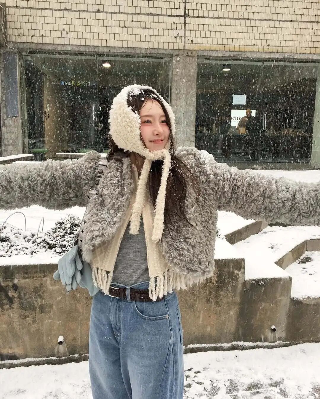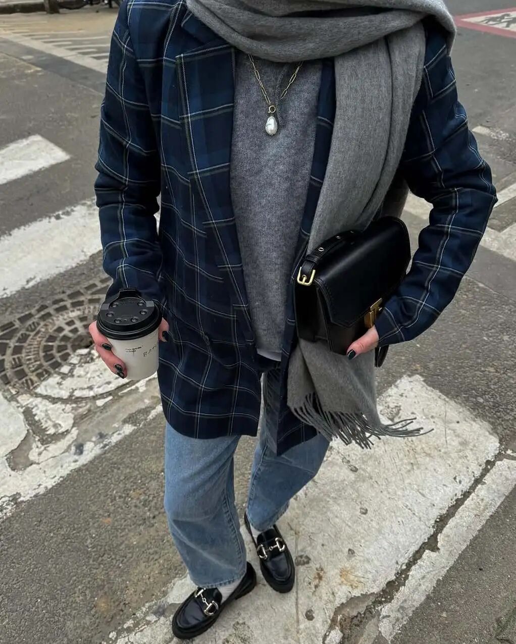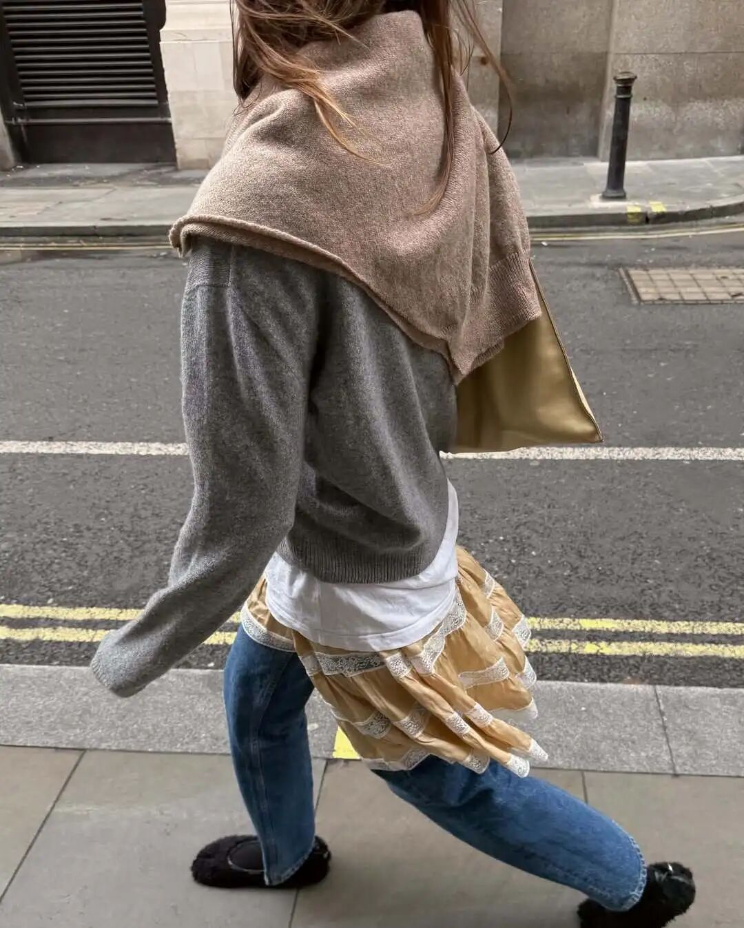围巾是灰色打底衫的温暖cp,同色系的围巾能强化整体的克制美感,深浅灰度交织出低调层次;大地色系的围巾则添了份自然暖意,柔软的面料裹住脖颈,既抵御了寒意,又让造型多了份慵懒随性。