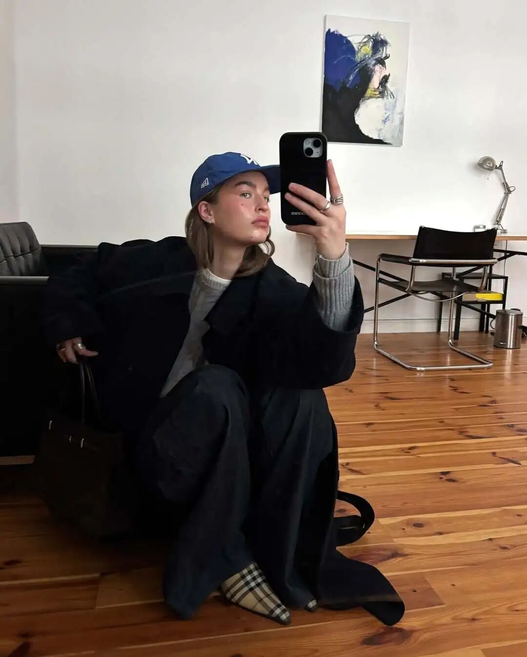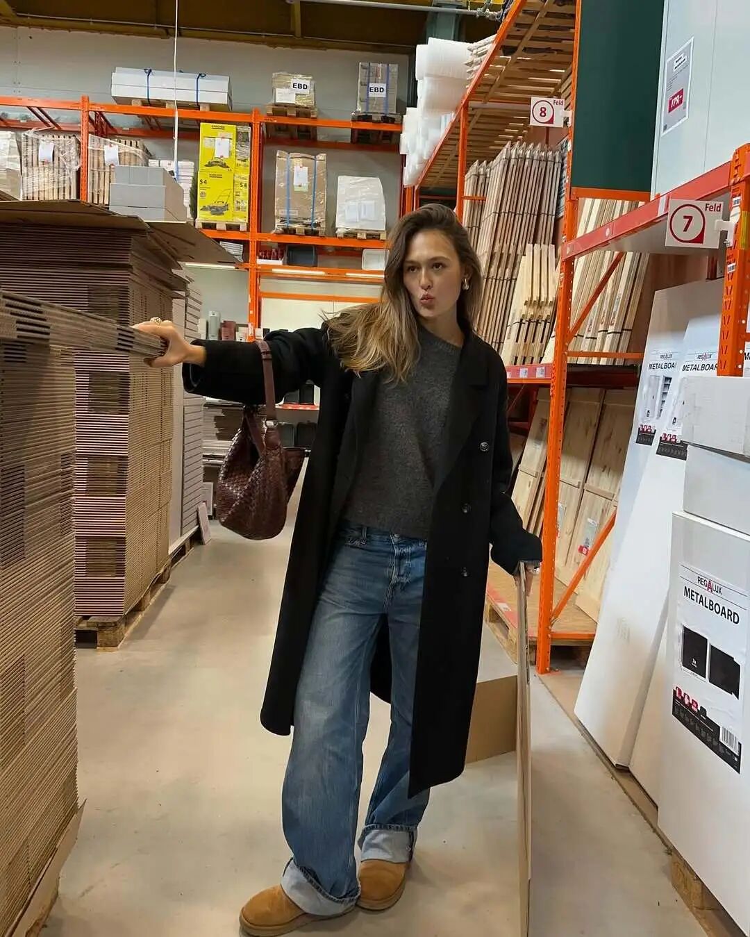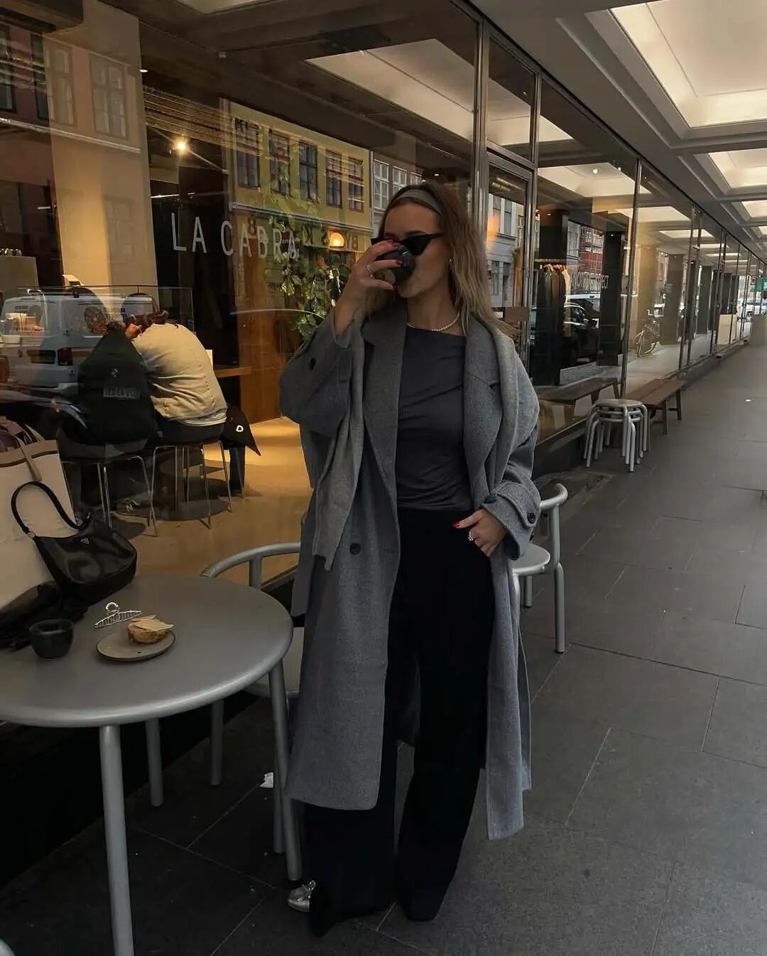 作为内搭来说,灰色打底衫可以选择与身线廓形大致贴合的款式。袖口刚好到手腕最细的地方,衣长落在腰线附近不拖沓,既能更好地“隐形”在外套里,又能悄悄勾勒出利落线条,成为冬日穿搭里不抢戏的核心支撑。