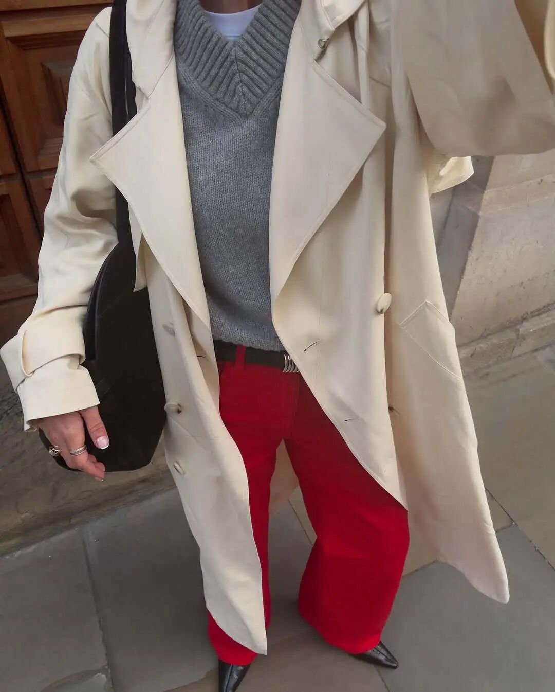 灰色为打底叠加了一个冷静buff,撞色搭配不会显得浮夸。搭配正红色的裤子,热烈中透着沉稳不刺眼;搭配蓝色外套,清爽中带着内敛不跳脱。不过撞色不是随便乱搭,关键是主次分明,就像生活里的一张一弛,沉稳是底色,张扬则是调味剂。