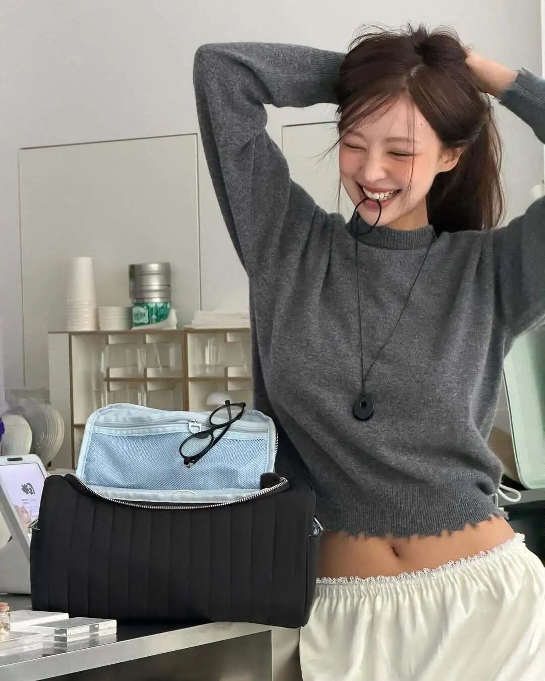 一条毛衣链刚好能填进这份素净里。不管是细巧的吊坠,还是带点设计感的亮色项链,都能精准点亮胸前的空白。走路时链条轻轻地晃动,更是为造型增加了动态的美感。