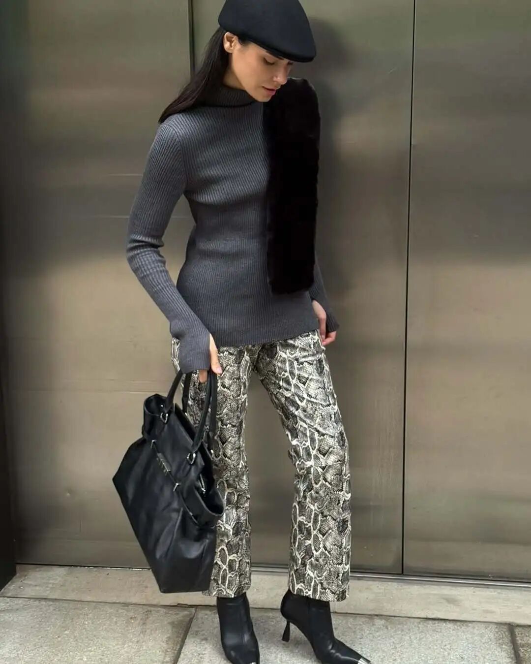高领灰色细针织衫作为打底是气质型选手,细腻的针织纹理贴肤不扎人,领口到下巴下方一厘米的长度刚刚好,能自然修饰颈部线条,把脸衬得更小。而且在厚重的羽绒服、毛呢大衣里,也不会显得臃肿。