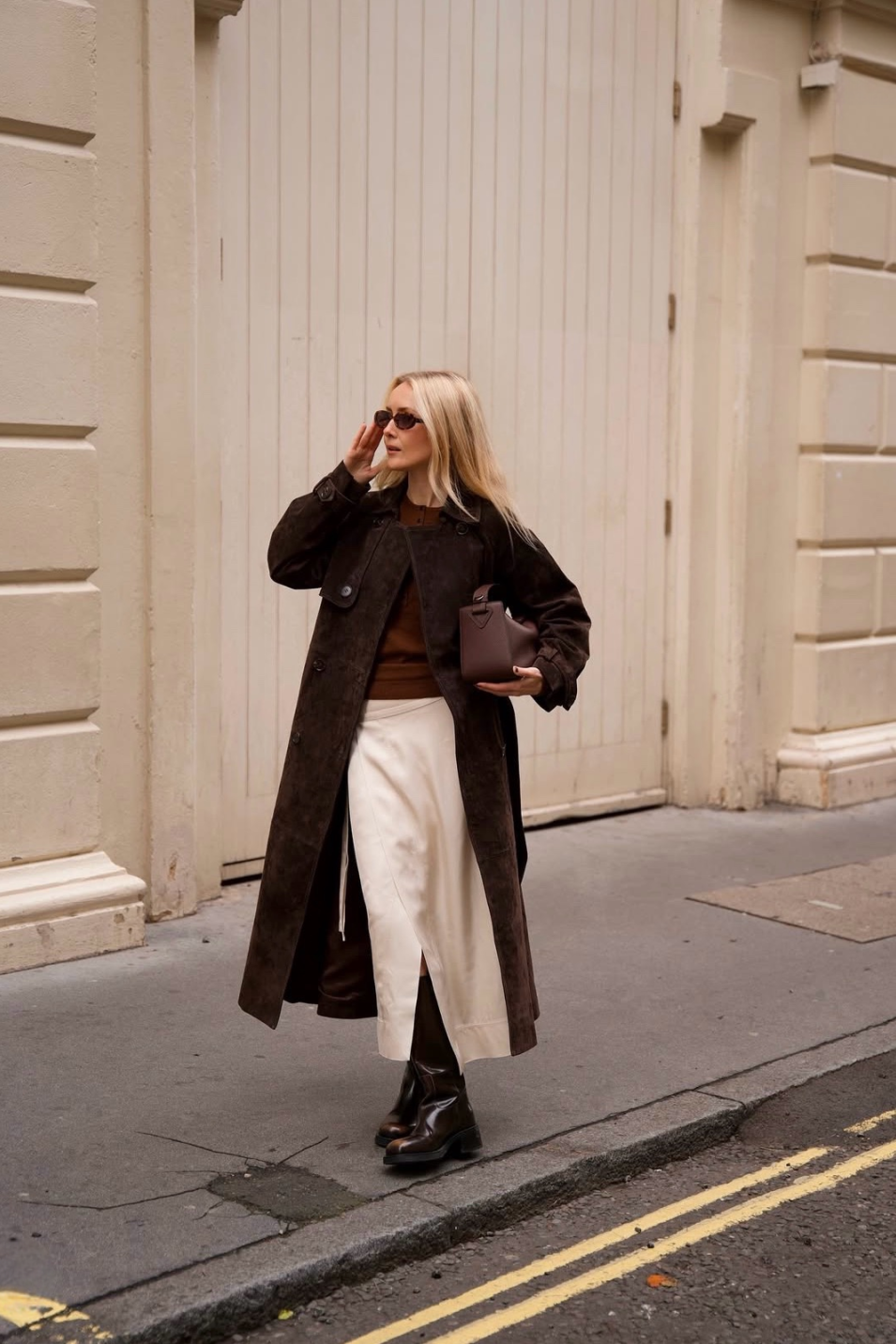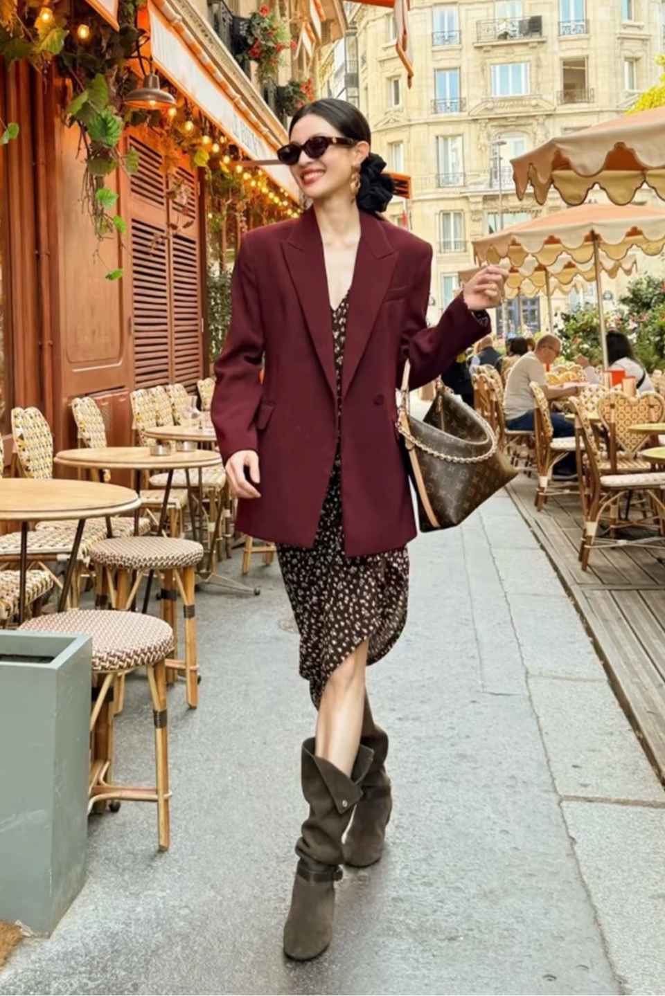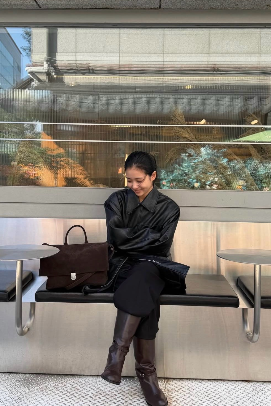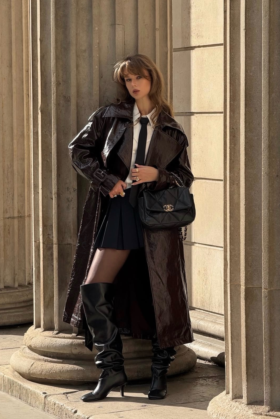 半身裙和褶皱长靴搭配具备超强的兼容性,可以利用挺括的西装搭出通勤的装扮,也可以搭配帅气的皮衣轻松营造甜辣风格。
