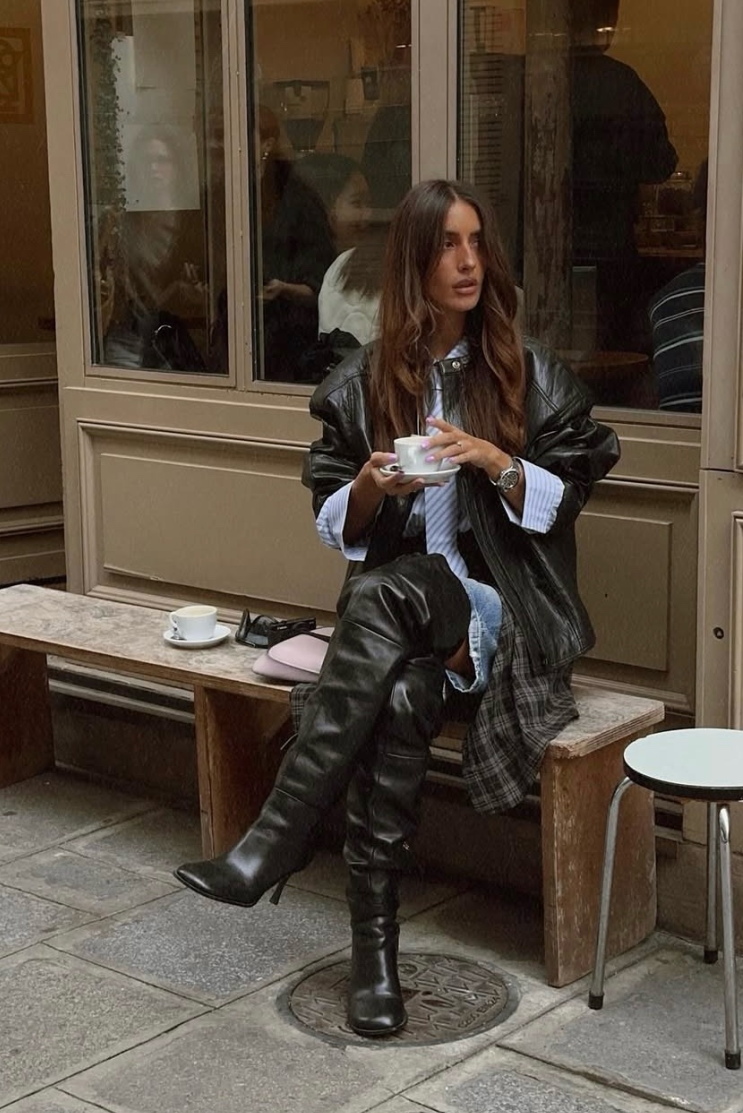 长款大衣同时也是褶皱长靴的百搭模板,廓形oversize外套的利落搭配褶皱靴的慵懒,松弛的时髦感立刻就有了。