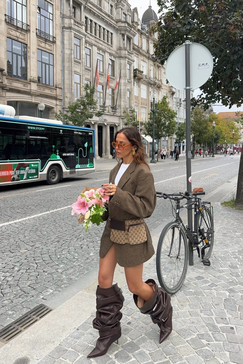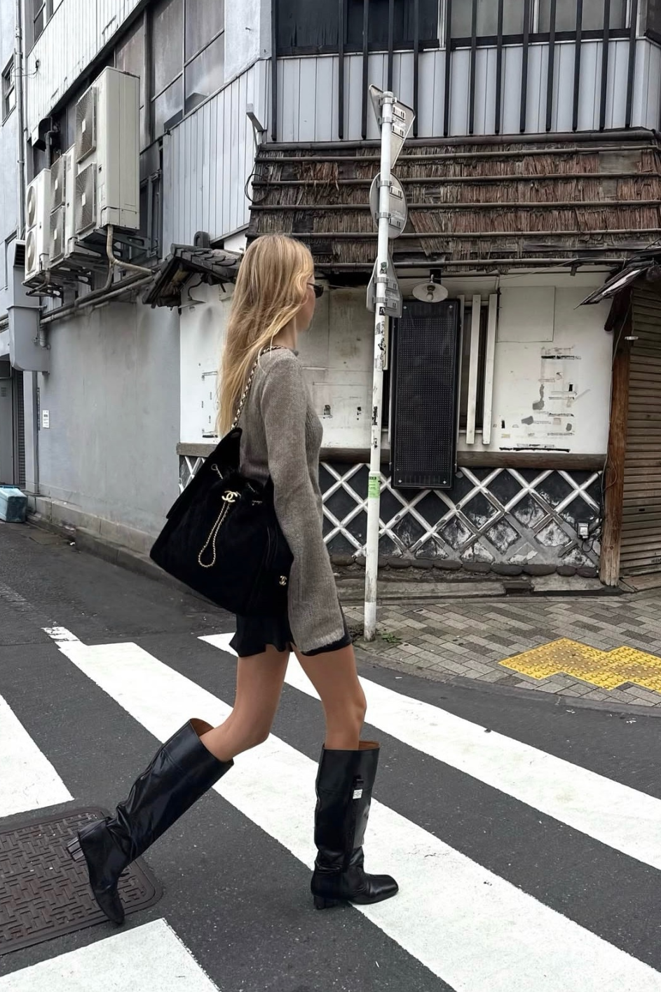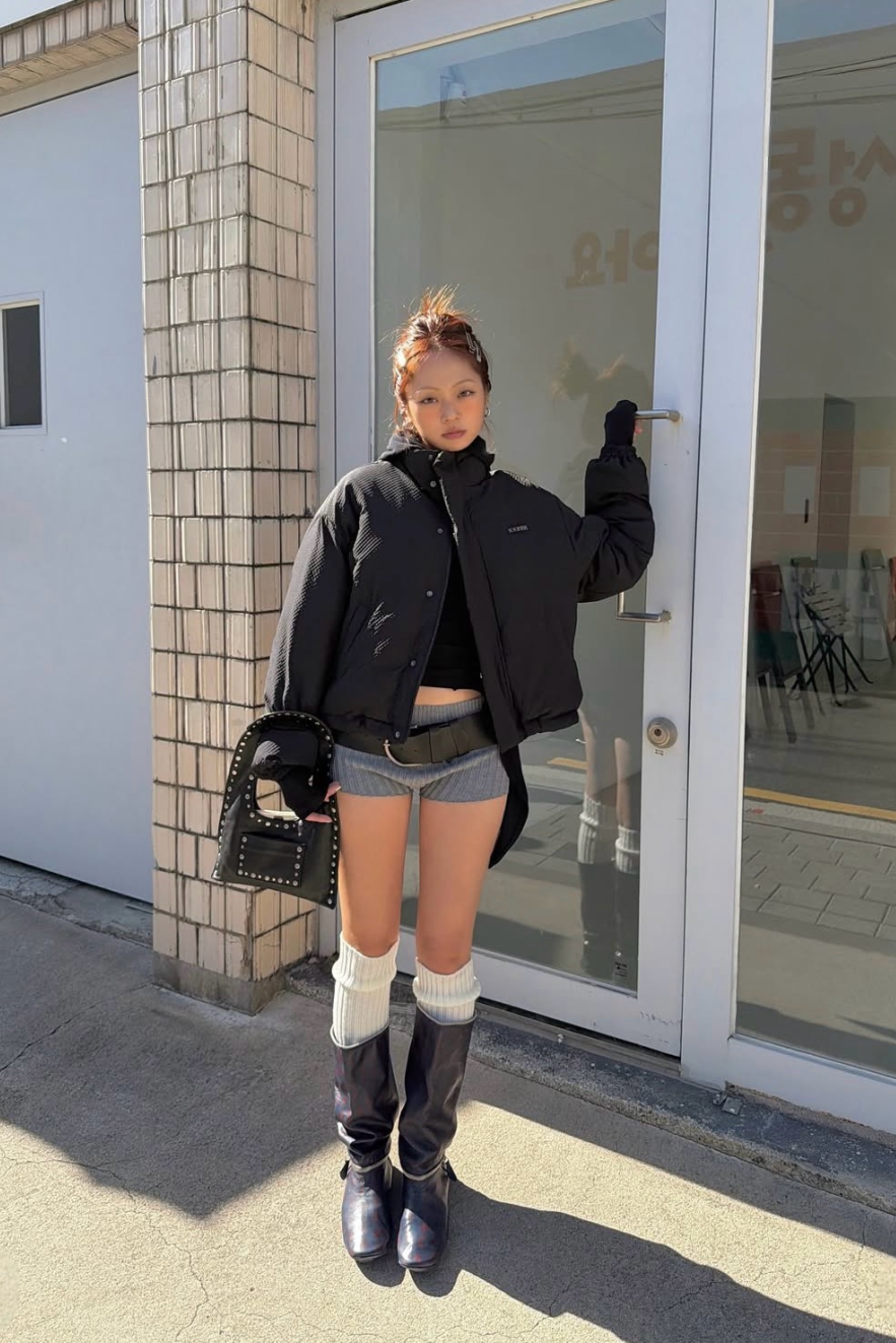 短裙或者短裤搭配褶皱长靴,适当的露肤度可以在视觉上拉长整体比例,宽松款靴筒还能遮住小腿的肉肉,美化腿部线条。