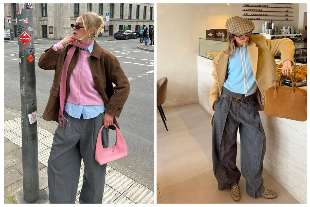 灰色西装长裤宽松的裤管与微微拖地的长度,轻松为造型塑造出如雕塑般的轮廓感和高级感。灰色的中性低调让它成为百搭基础款,上身搭配一件亮色系的针织内搭,能瞬间打破灰色的沉静,为整体注入活力与呼吸感。