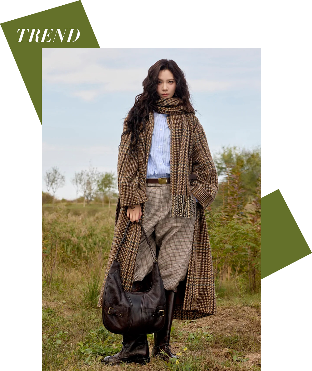 在材质的选择上,多运用视觉或触感上“柔软”的面料,像灯芯绒的肌理感、针织的温柔弹性,以及毛呢的挺括与温暖,将这三种各具特色的软质面料进行巧妙叠搭,不仅能提升穿着的舒适度,更能自然而然地营造出一种带有复古气息的文艺格调。
