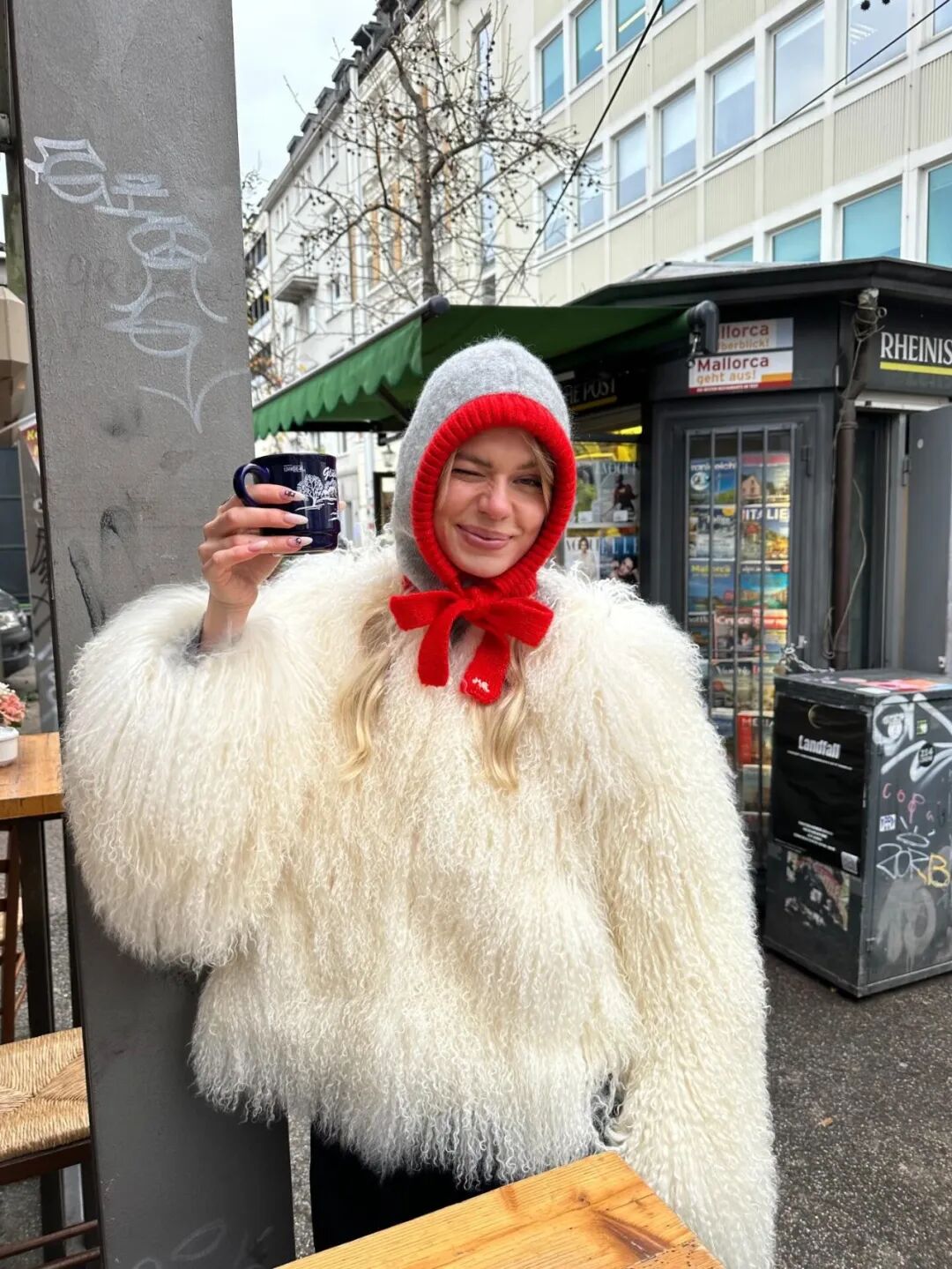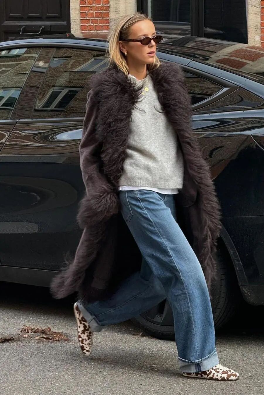毛毛元素如何穿得不显臃肿?关键在“局部使用”。一件皮质夹克内衬换成羊羔毛,保暖度升级的同时保持了外套的利落轮廓。