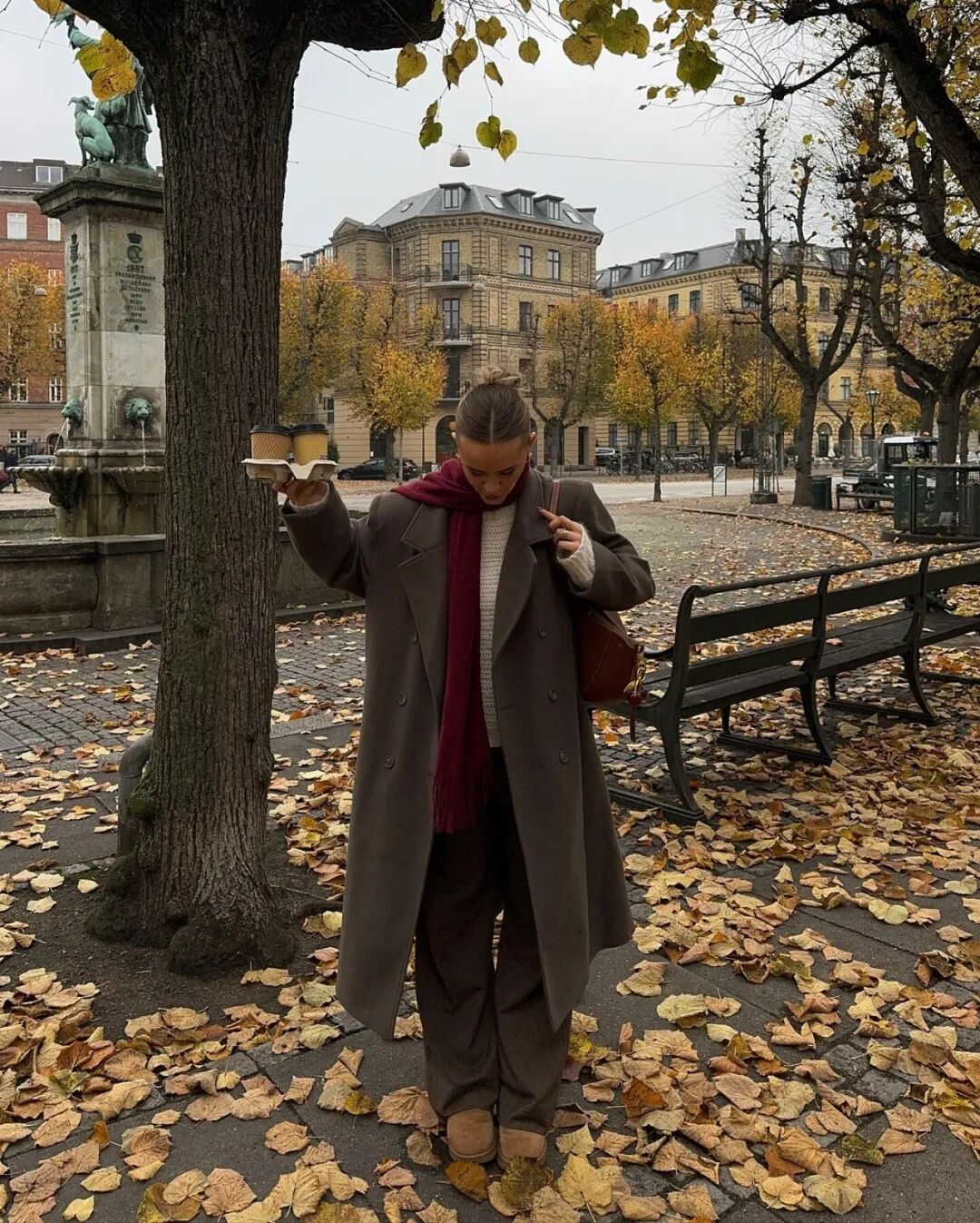 选择一件质感好的棕色大衣,它能和你衣柜里80%的单品成功配对,适用于多种场景。