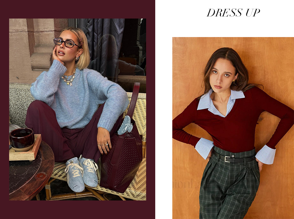 酒红色和蓝色的搭配尤其出彩,有种复古又现代的矛盾美感,是值得借鉴的吸睛撞色。