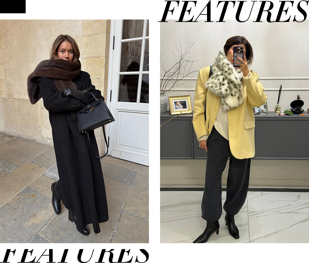 甚至可以在穿纯色大衣时,随意披一条仿皮草围巾,保暖和造型一举两得。毛绒单品已经足够抢眼,其他部分尽量从简,平衡得刚好才是时髦的精髓。