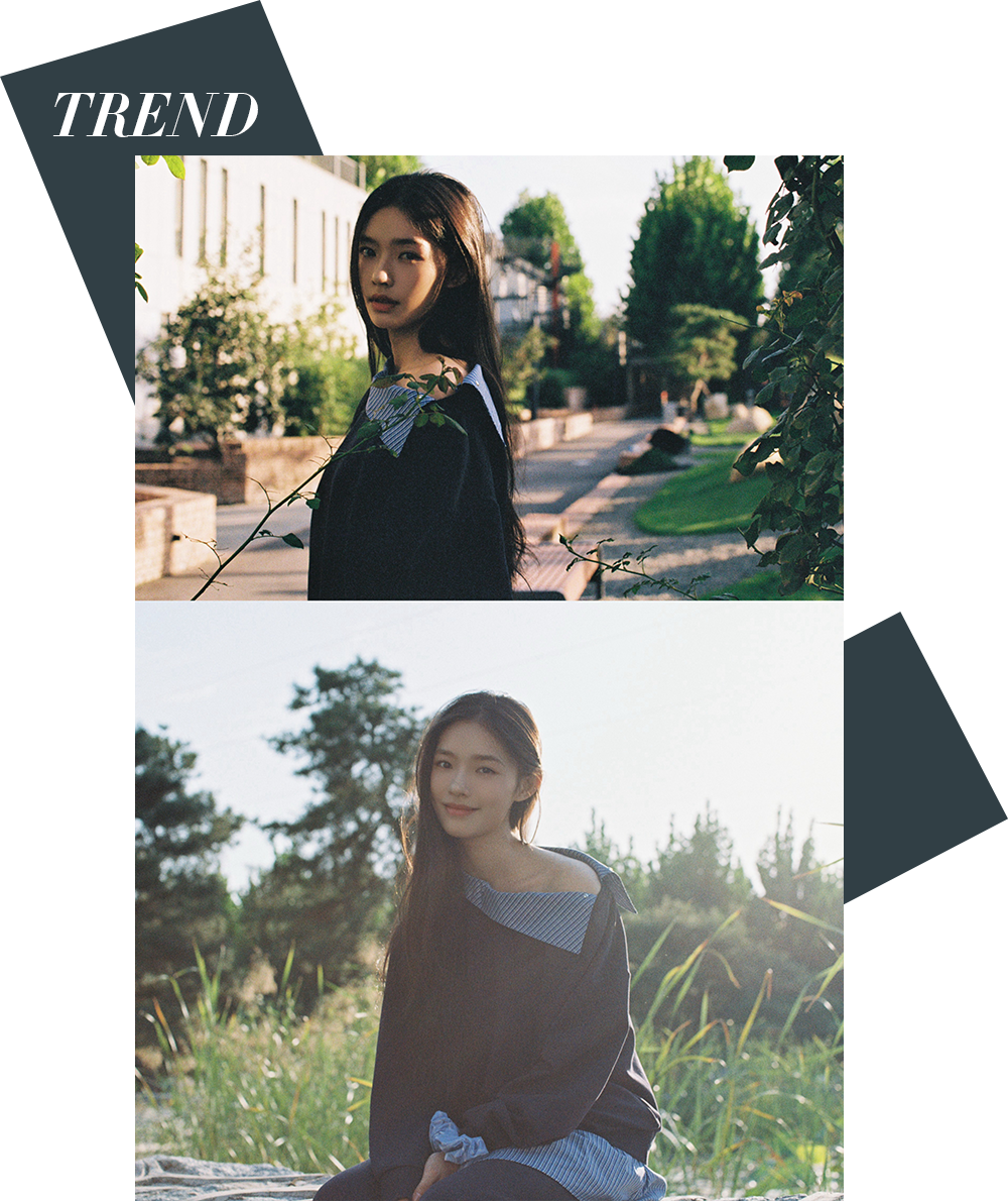 将“正式感”的面料与“休闲感”的面料相结合,也可以实现“居家通勤”的慵懒精致。林允这件斜肩翻领上衣,巧妙地展露出肩颈线条,两种不同面料的拼接,创造出视觉上的错位感,仿佛将两件单品叠穿。仅凭这一件设计感十足的上衣,就塑造出丰富的层次感。