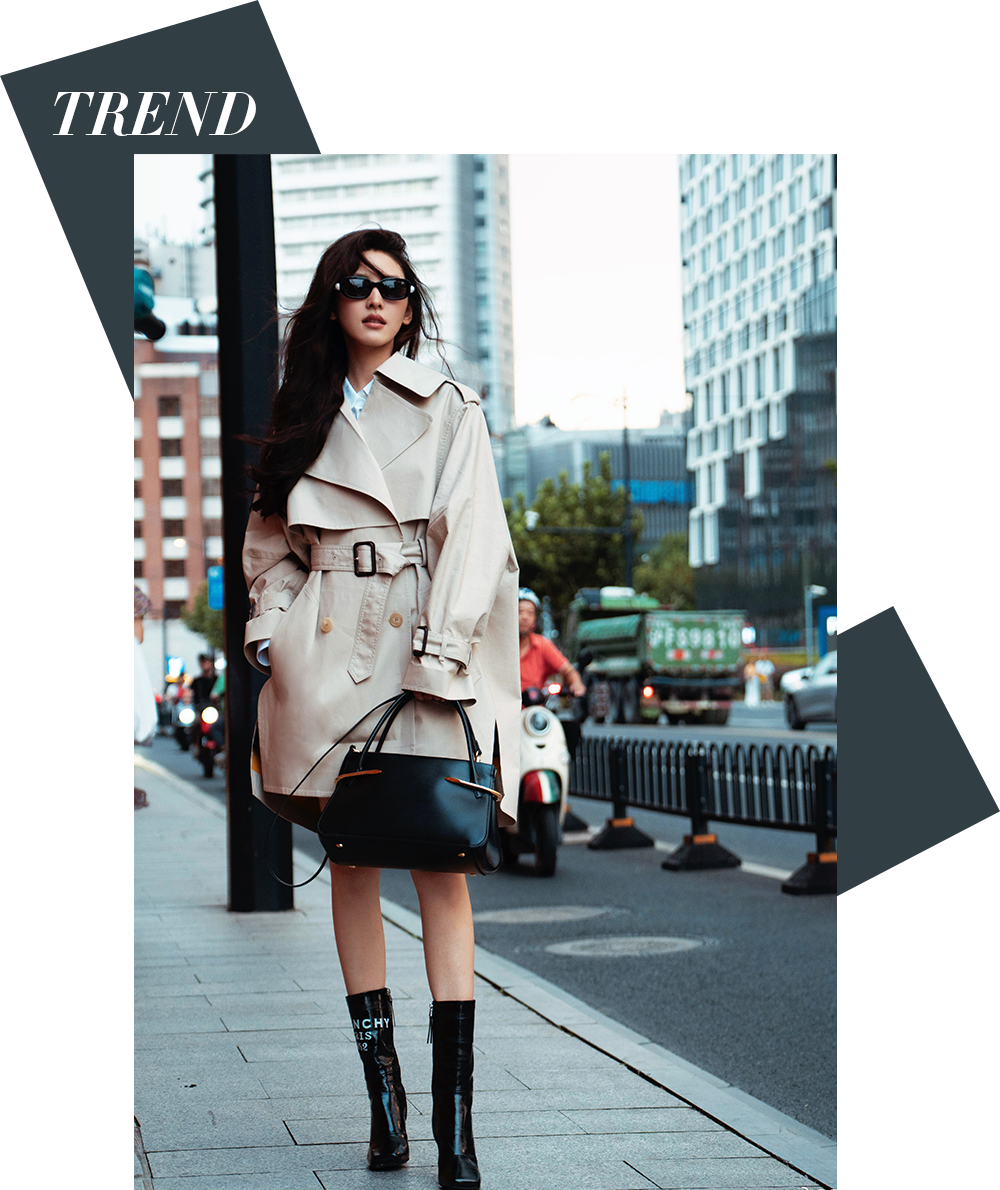 充满矛盾张力的“疯感”,其实是在保持外表得体与冷静的同时,通过一个精心设计的“破绽”来展现出不一样的穿搭态度。章若楠凭借一件剪裁独特的风衣,轻松塑造出充满锋利感的造型。风衣利落的线条与极具张力的设计,结合光泽感皮靴与手拿包,整体简洁却不失强大气场。