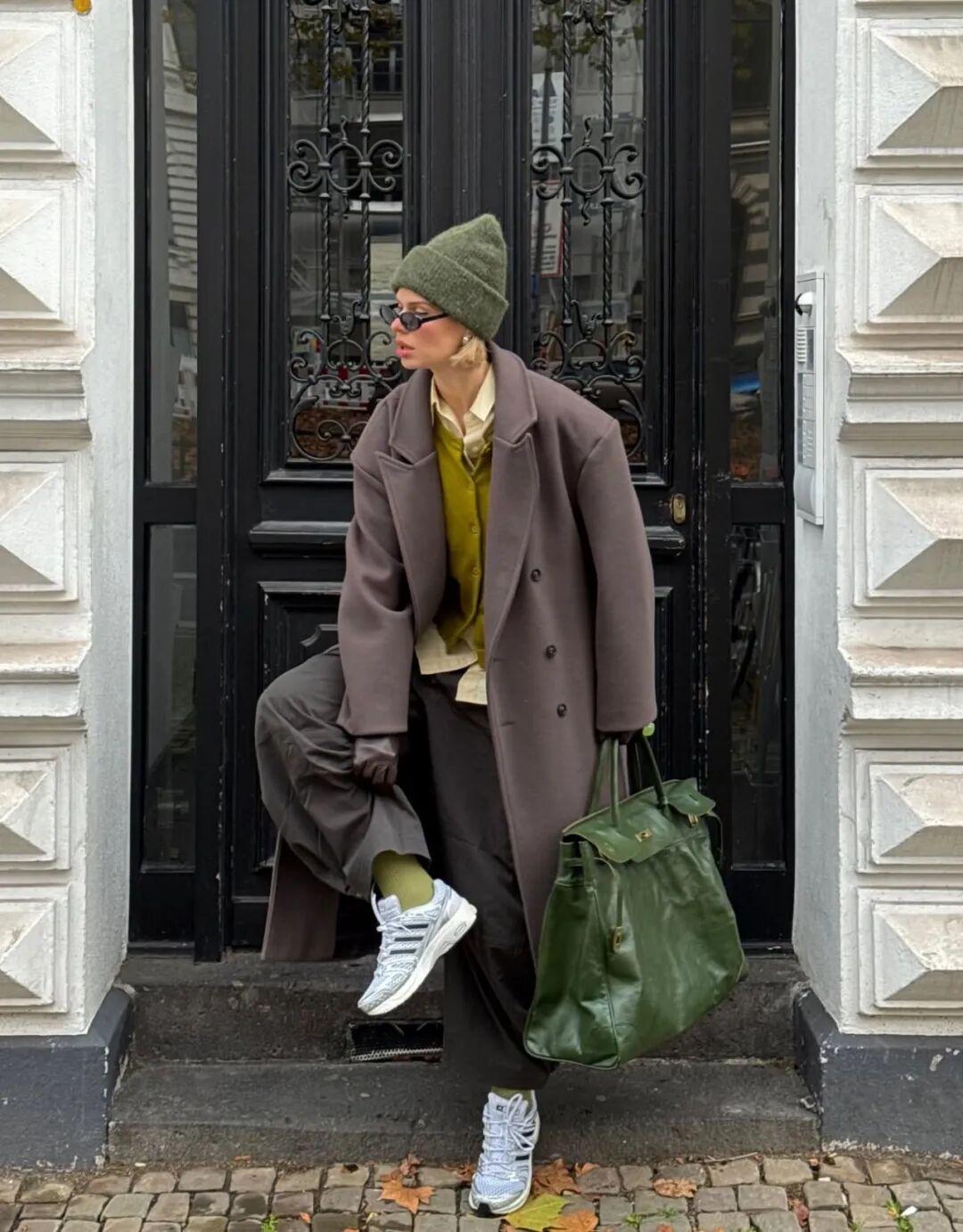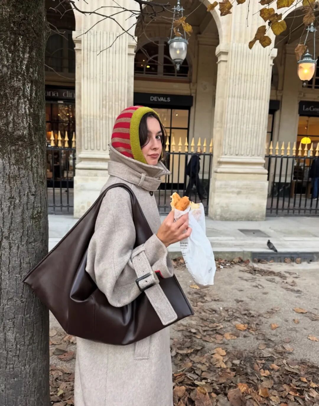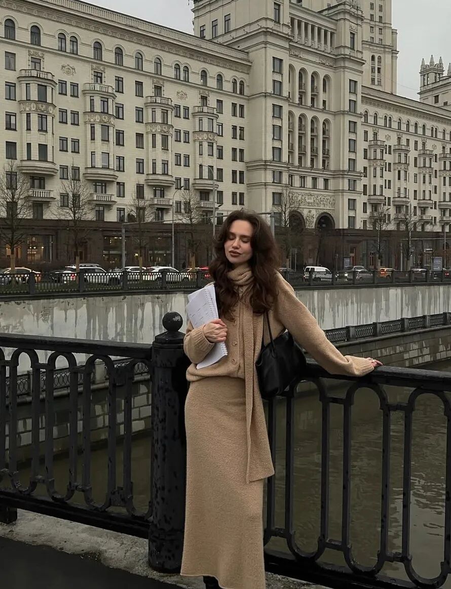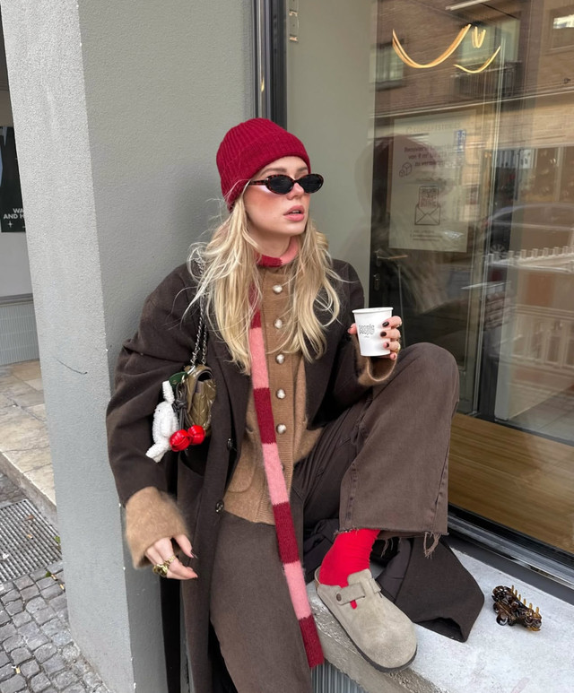 除此之外,穿搭的点缀效果还体现在色彩的搭配上。在安静随性的衣物搭配之外,用饰品建立两到三个色彩锚点,例如围巾的颜色与帽子和鞋子呼应,内搭的燕麦色与包袋的皮质色调一致,这种克制的、不经意的色彩串联,能创造出极具整体感和深思熟虑的高级印象,让简约显得极具深度。