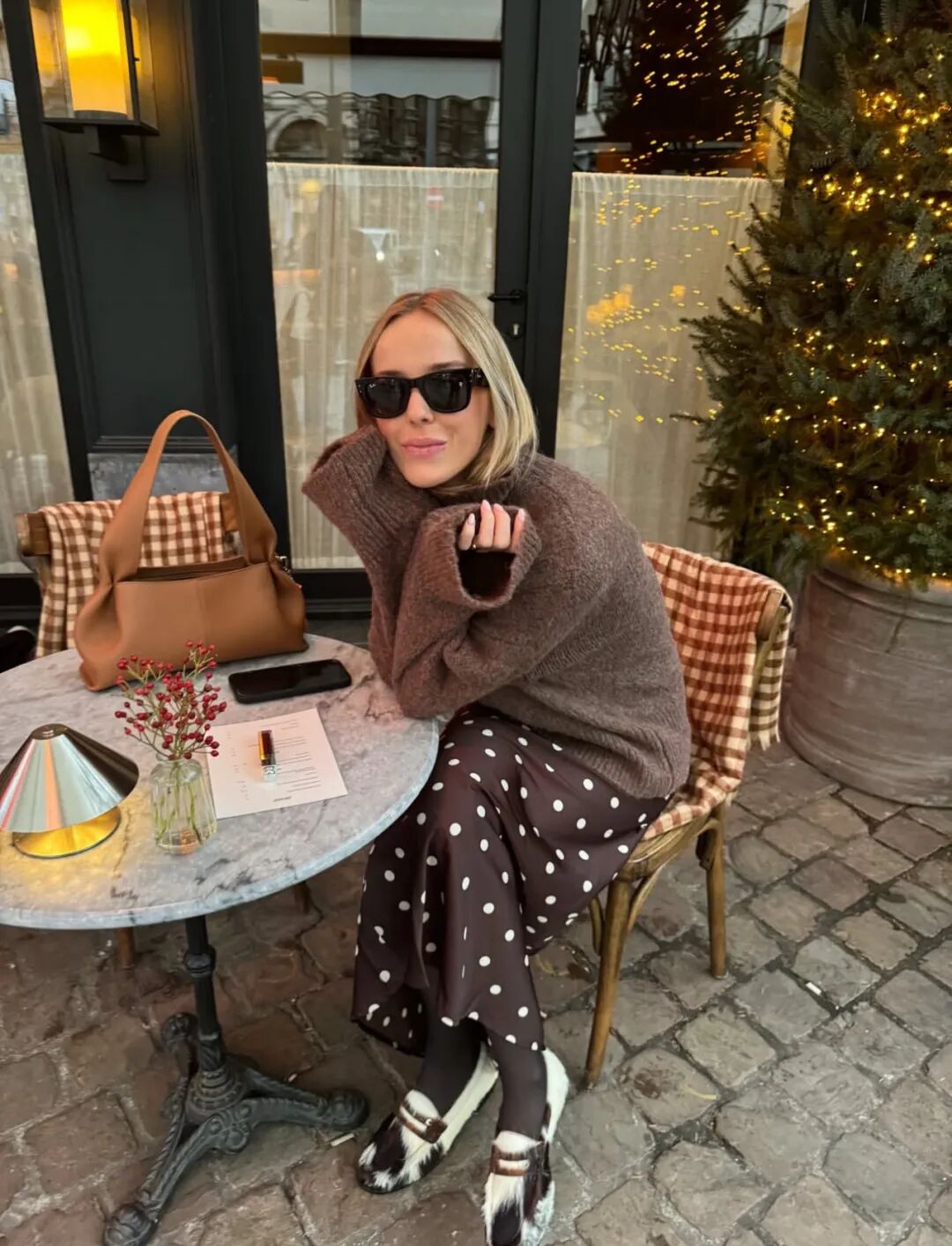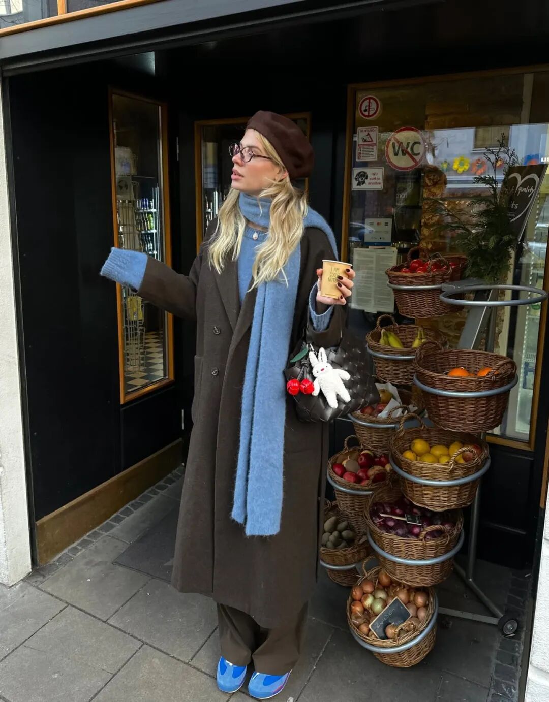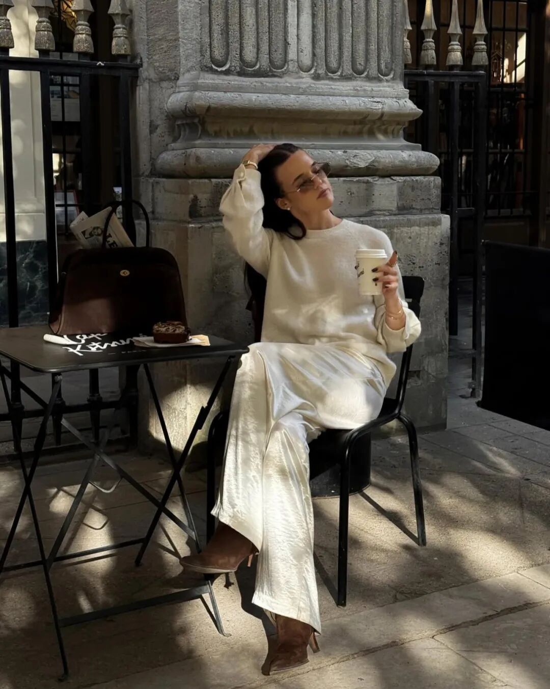 除此之外,穿搭的点缀效果还体现在色彩的搭配上。在安静随性的衣物搭配之外,用饰品建立两到三个色彩锚点,例如围巾的颜色与帽子和鞋子呼应,内搭的燕麦色与包袋的皮质色调一致,这种克制的、不经意的色彩串联,能创造出极具整体感和深思熟虑的高级印象,让简约显得极具深度。