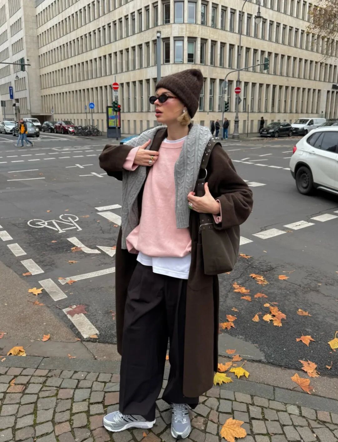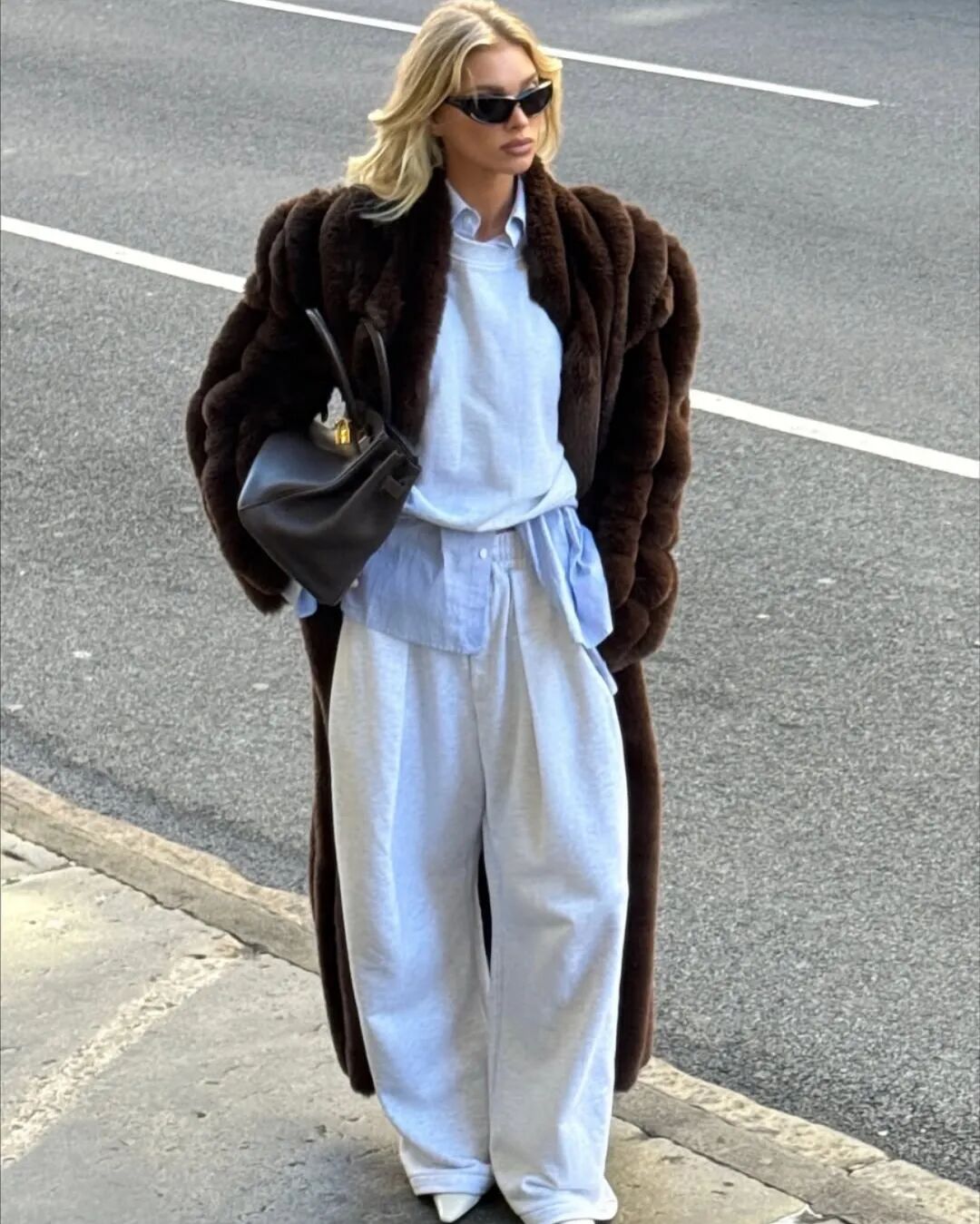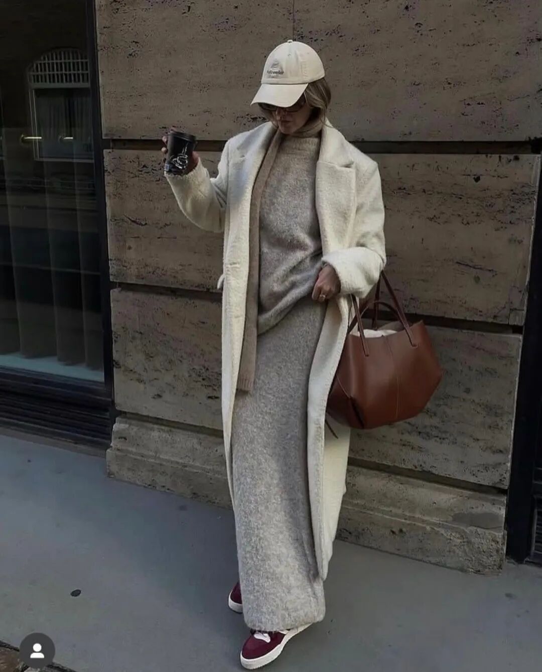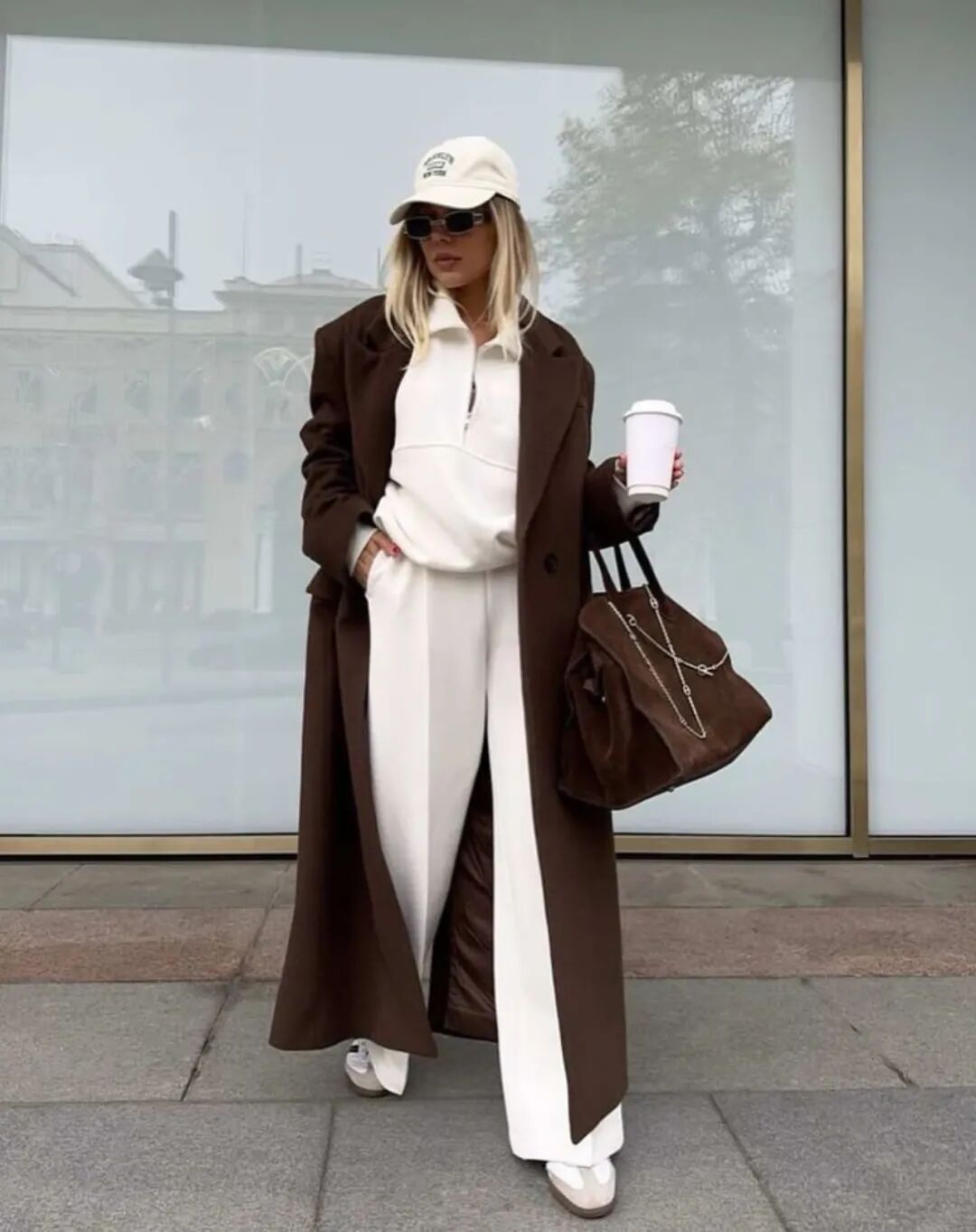 大衣里的卫衣套装将居家舒适直接穿出门。当卫衣被包裹在利落的大衣或长款羽绒服之下,便形成了绝妙的风格对撞。选择灰、燕麦或奶油色等中性色调,能轻松提升质感,搭配一双厚底运动鞋,既能适应城市漫步,也能帮助短途通勤。