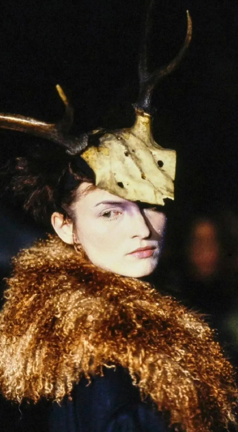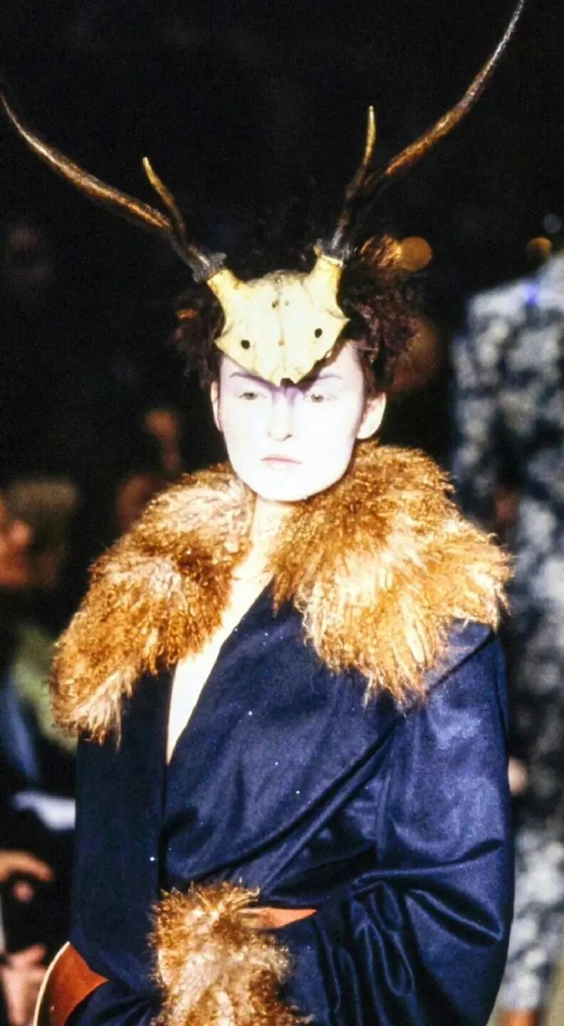 在品牌秀场上,毛领则从保暖符号升华为了造型语言。1996年,鬼才设计师Alexander McQueen在其标志性的“Dante”系列中,将毛领做成环抱式披肩,让柔与刚、温度与盔甲并置,在烛光教堂的哥特氛围中,毛领成为了情绪的表达。
