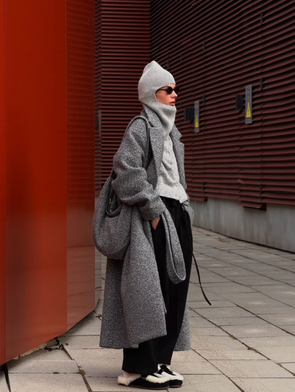 灰色是黑白之间最温柔的过渡,它内敛却丰富,深浅变化之间有着微妙的高级感,能让冬日穿搭显得松弛又不单调。