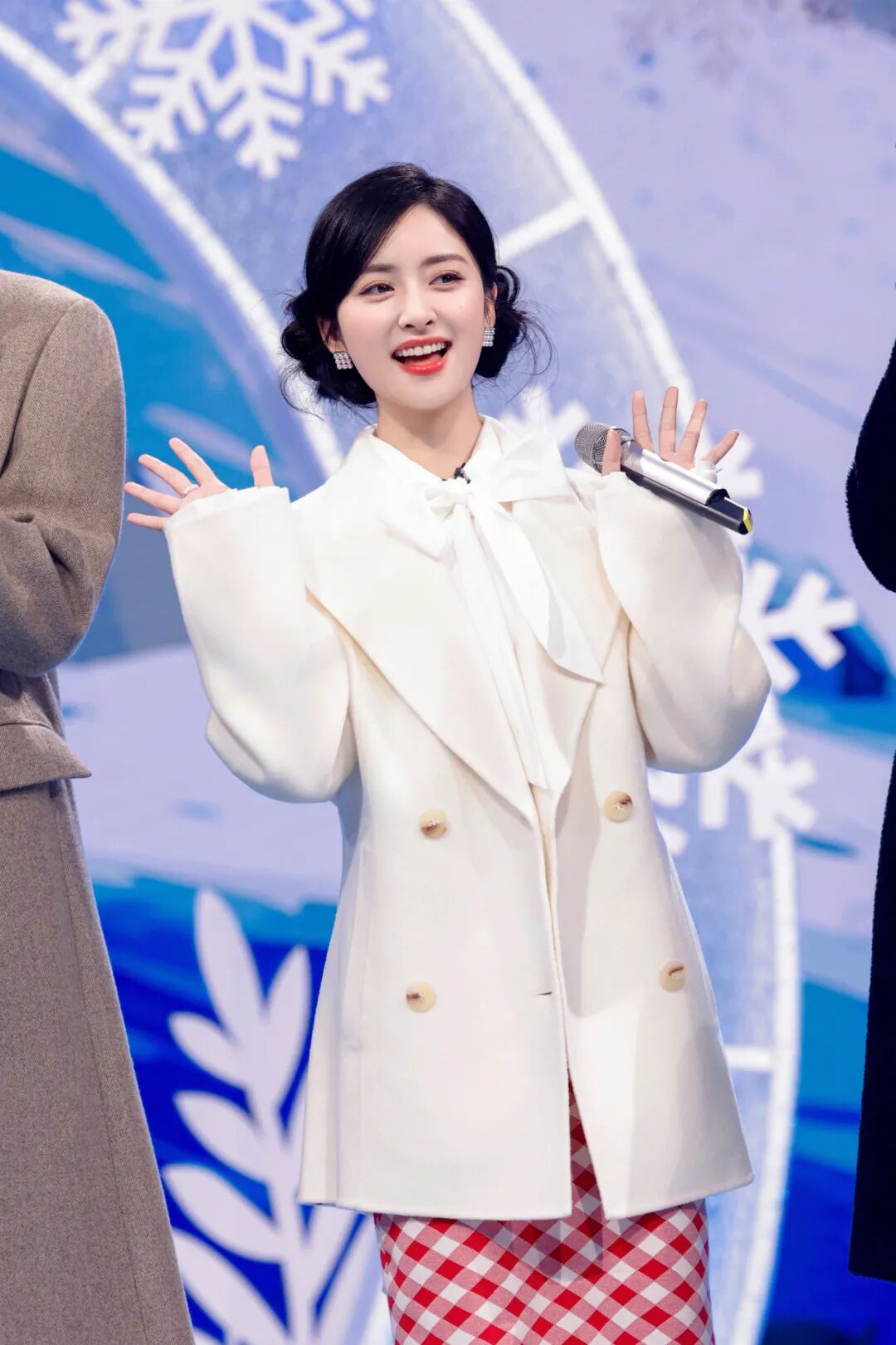 张婧仪上身的这件长款白色羽绒服,花苞式的衣摆设计让整体轮廓如云朵般蓬松柔软,轻盈又不失温暖感,再搭配了一条厚实而有质感的格纹围巾,悄然地释放一股优雅感。