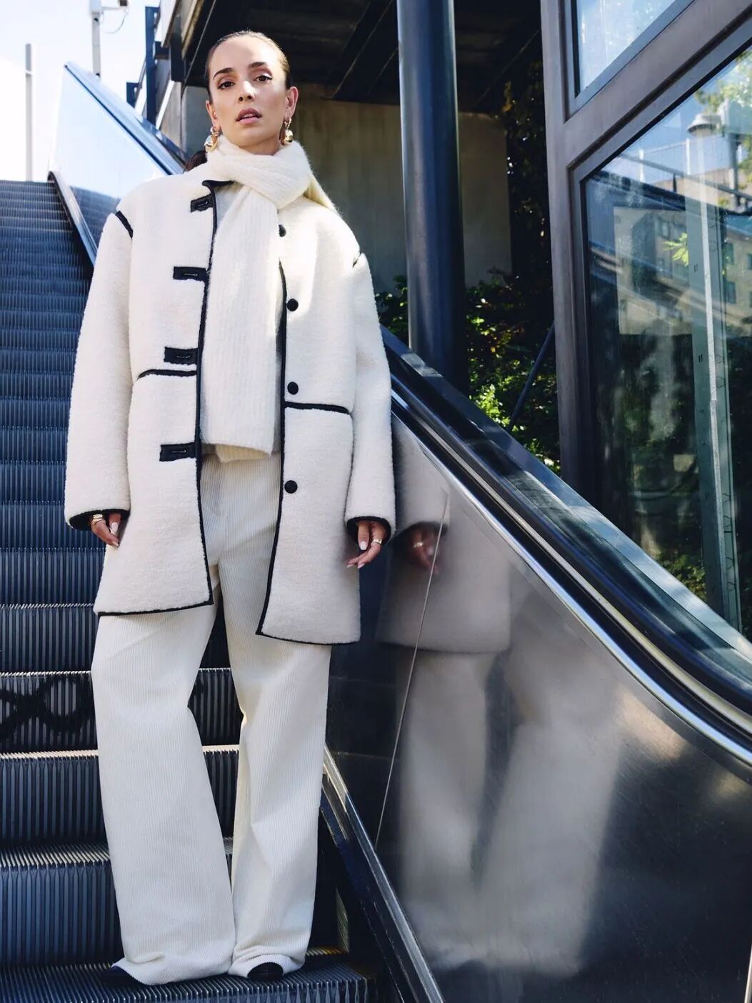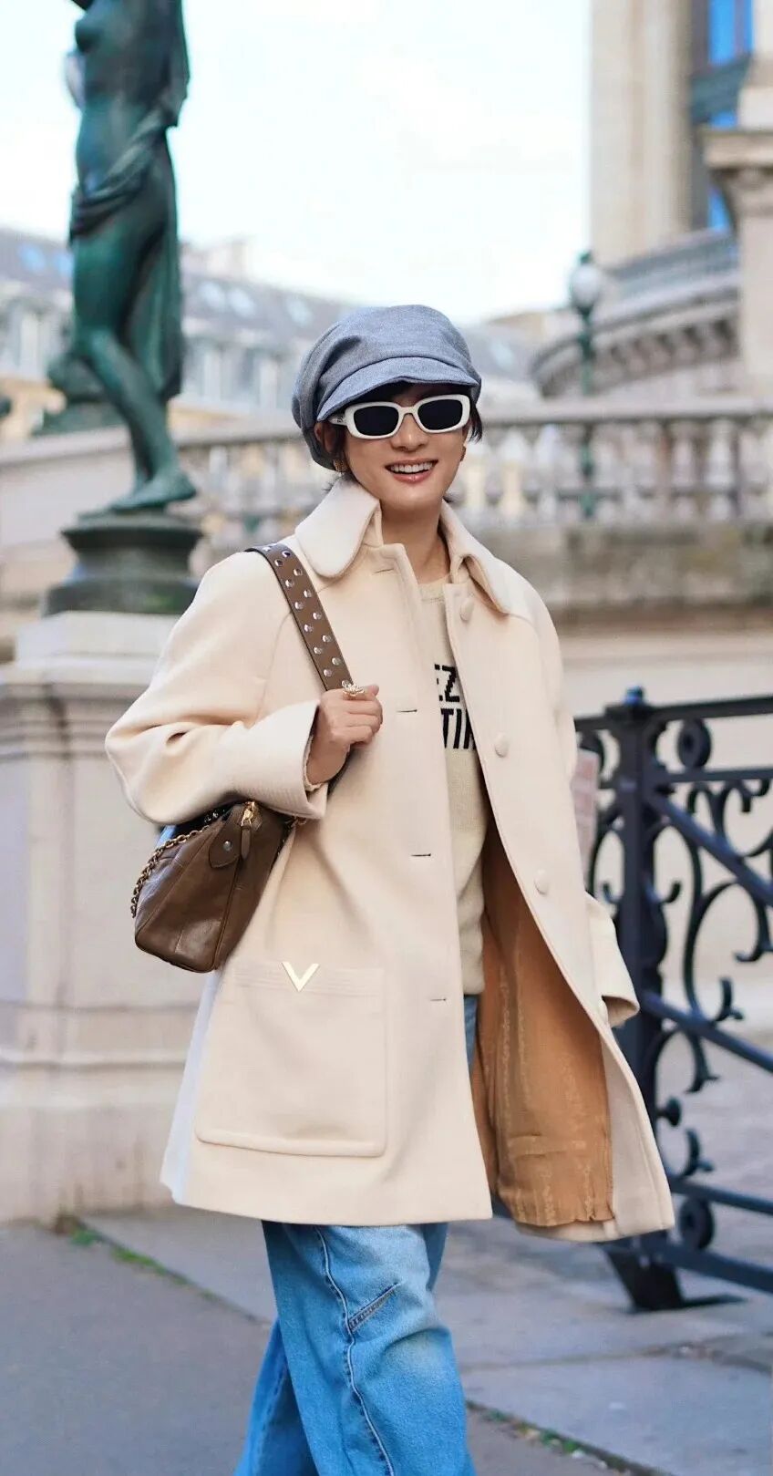 白色呢子大衣上身后立刻凸显稳重与端庄,配合利落的剪裁,让线条干净流畅,无论是H形还是A形轮廓,都能塑造出修身形态,从上至下的统一色调延伸视觉线条,显高显气场。