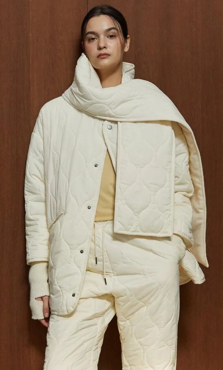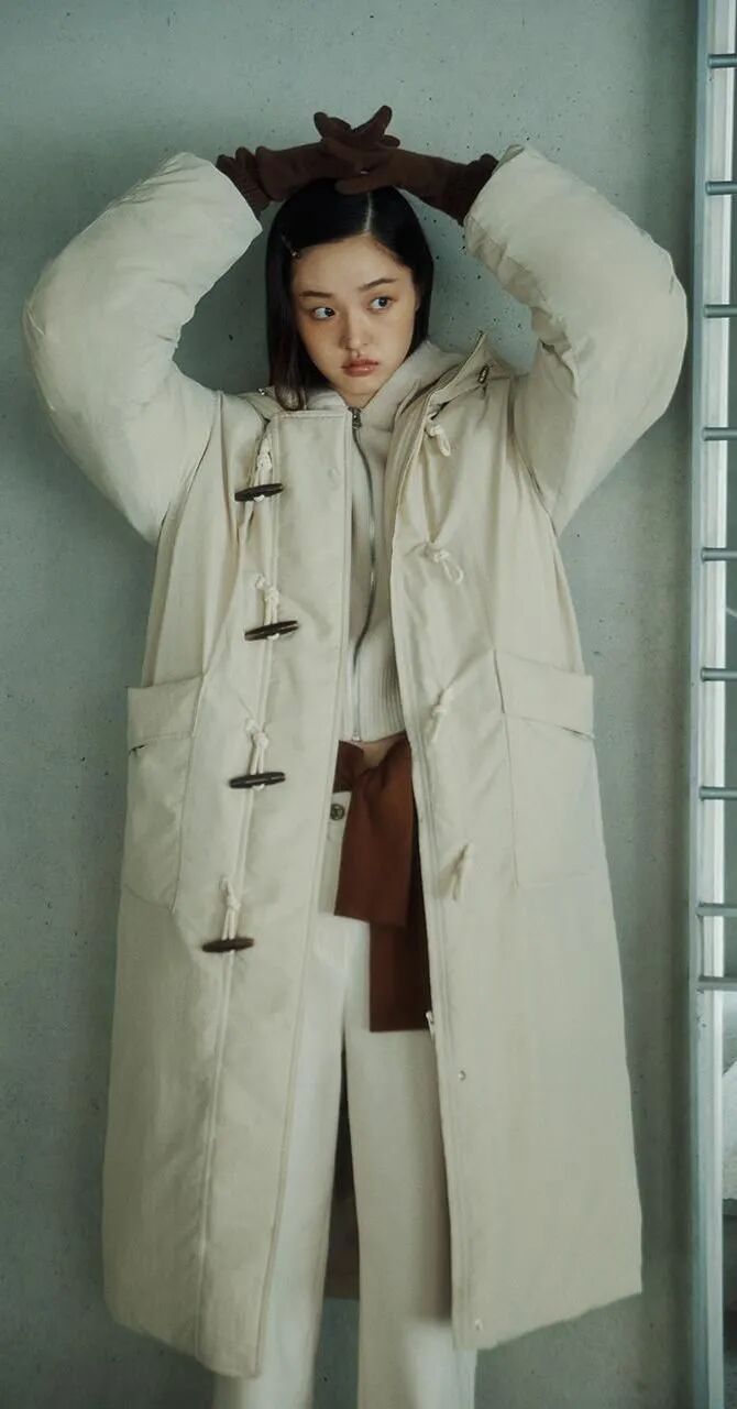 立体感的白色外套,立领加上斜门襟设计,扣上立刻突显气质,还有一种抱住脖子的温暖感,而且整体造型自然中带着酷感,适合敢于混搭和追求风格多变的时髦风格。