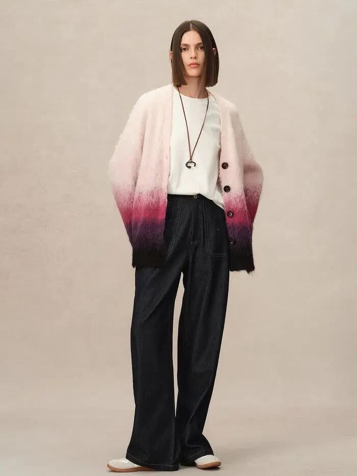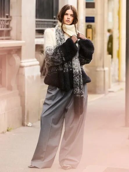 渐变的色彩也很适合与白色相配,一件从奶白逐渐过渡到彩色的厚重感毛衣,让纯粹的白色不再孤立单薄,自然的流动感与视觉延伸,为造型注入了温柔的色彩活力,使得整体造型在冬日里显得格外生动而有温度。
