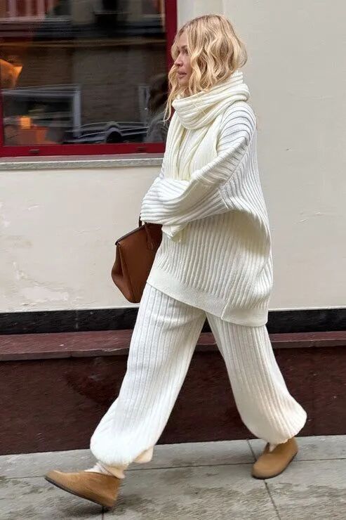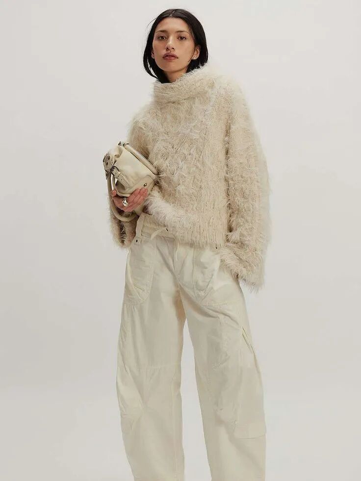 柔和色彩与全白造型相配,也能凸显高级感,一件软糯的浅色调针织毛衣,不仅能打破全身白色的平面感,本身的细腻纹理与温润色调就已充满视觉层次。