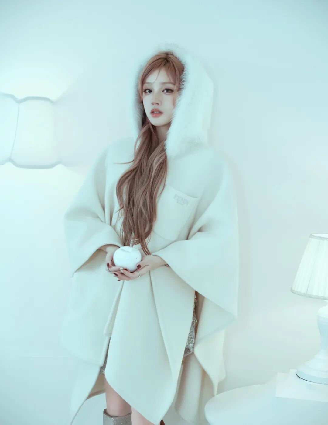 当全身以白色为主时,小面积的对比色点缀至关重要,也能让造型立刻鲜活起来。宋雨琦这身白色毛绒披肩大衣搭配毛绒帽子的造型,软糯感扑面而来,蓬松的材质衬得人乖巧又甜美,给造型注入了几分梦幻与甜美的气息。