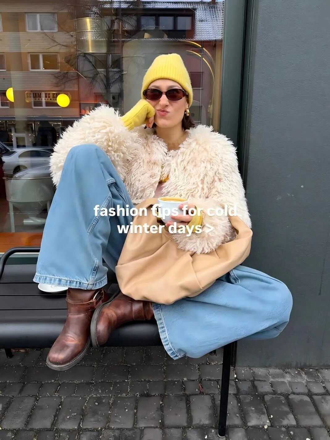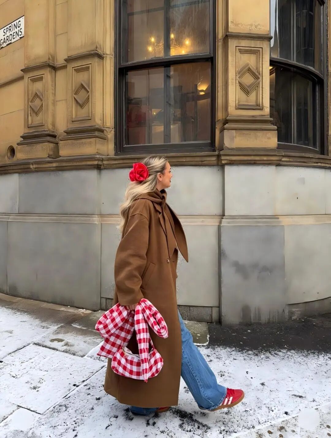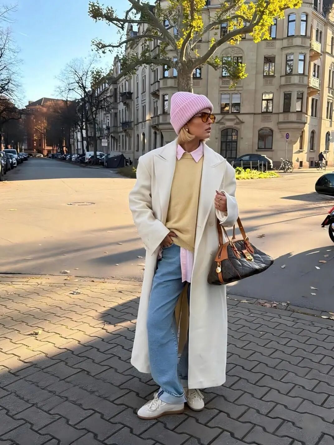 毛茸茸的毛线帽配挺括的羊毛大衣;