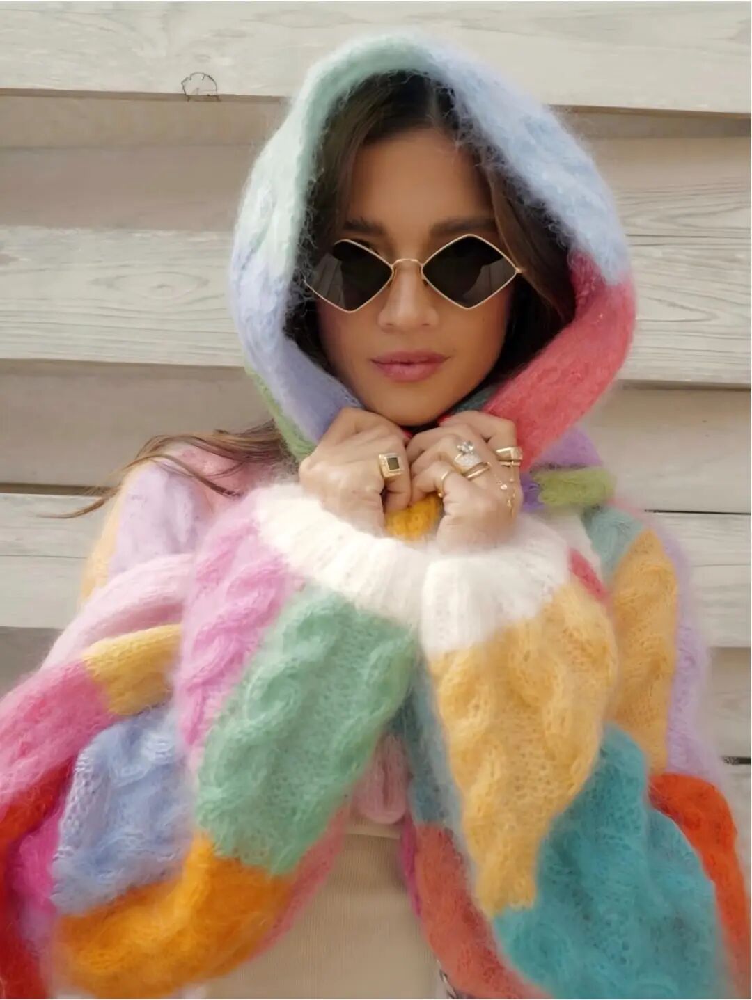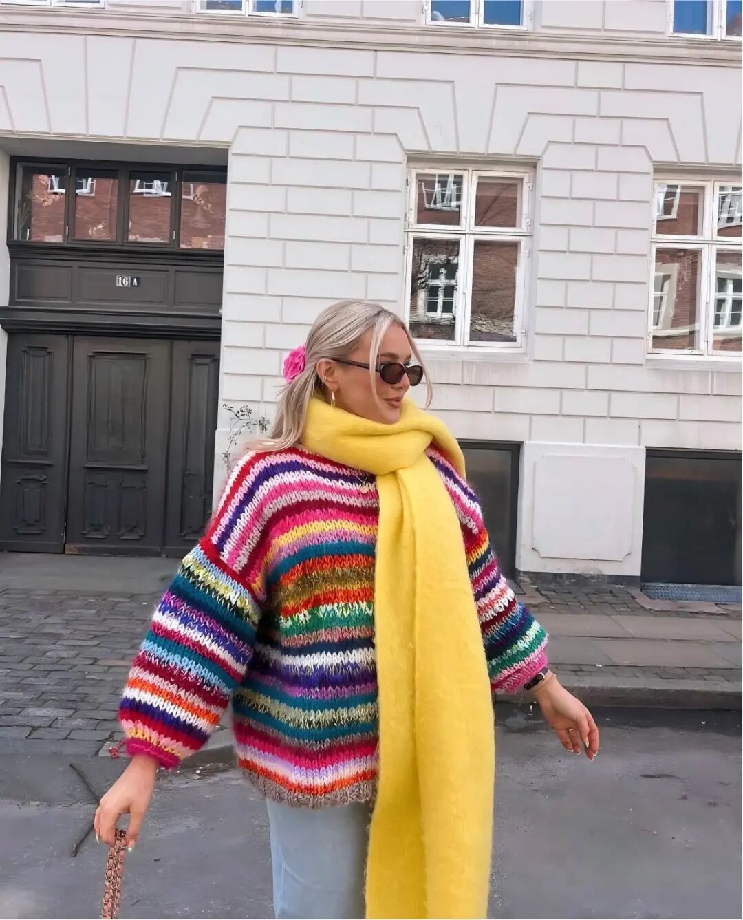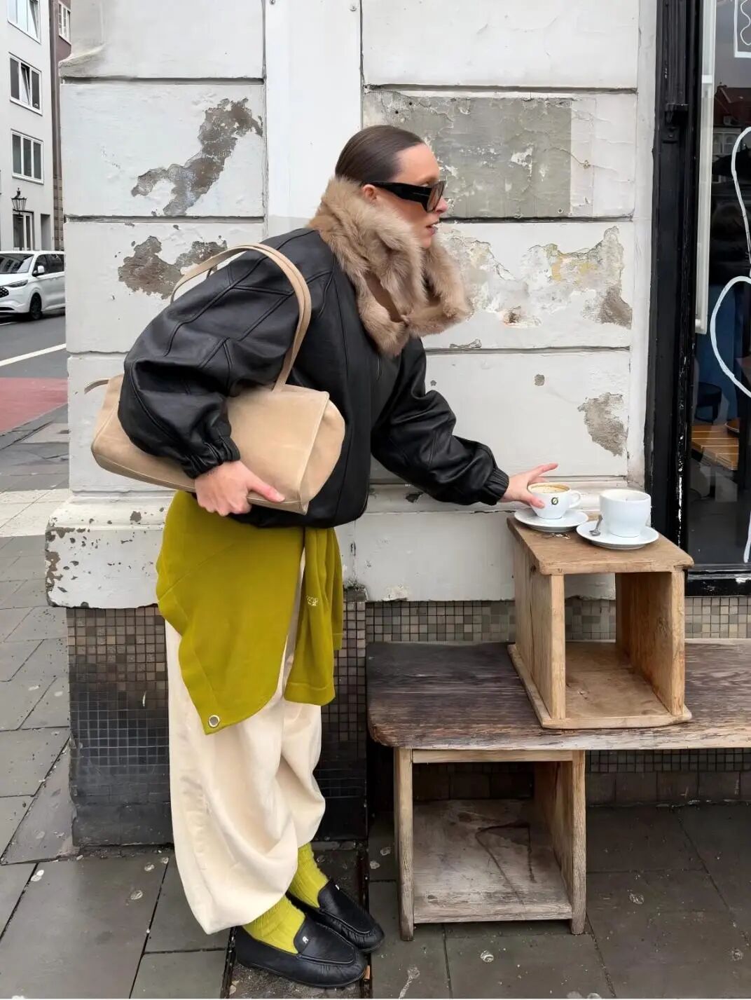 毛茸茸的毛线帽配挺括的羊毛大衣;